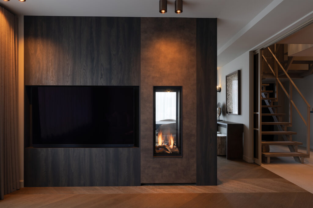 Een bijzonderheid die perfect past bij Melissa’s ontwerpstijl: “Onze signatuur wordt gekenmerkt door het gebruik van hoogwaardige, weelderige materialen, gecombineerd met gedurfde, opvallende details die een gevoel van exclusiviteit en verfijning oproepen.” Het maatwerkmeubel is voorzien van een doorkijkhaard en aan de andere zijde van een barretje. Ook de houten vloer trekt als vanzelf de aandacht in beide ruimtes. Het parket is in een Hongaarse punt gelegd. Hierbij is gekozen voor verschillende breedtes van de planken en een metallic-afwerking door meerdere geoliede lagen, wat een sfeerverhogend beeld oplevert.