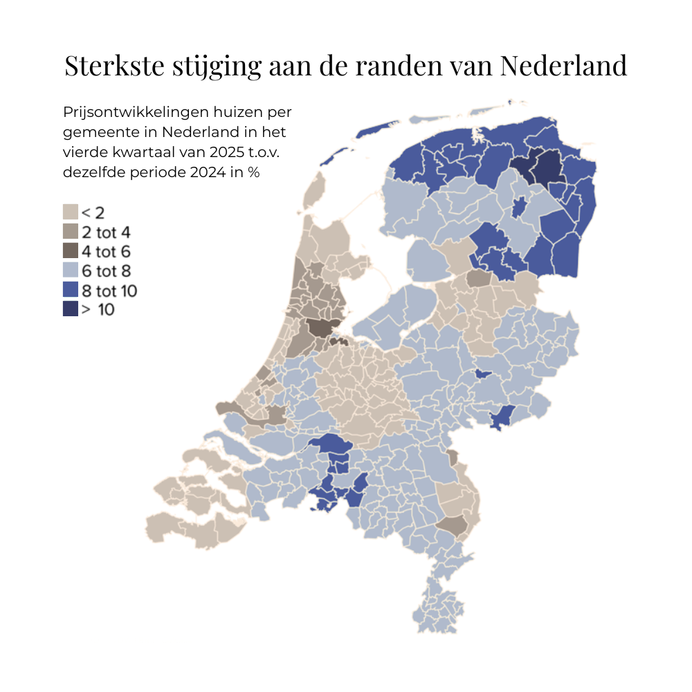 Wie vandaag de dag een woning zoekt, kijkt niet meer uitsluitend naar de postcode, maar naar het totale woonaanbod: ruimte, rust en kwaliteit van leven. Dat verklaart waarom prijsstijgingen zich juist daar versnellen waar die kwaliteiten nog overvloedig aanwezig zijn.
