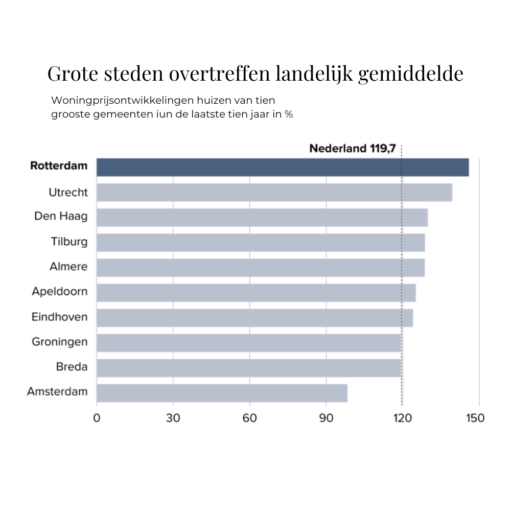 Over een langere periode bezien blijft het grotere beeld indrukwekkend. Sinds 2015 zijn Nederlandse huizenprijzen gemiddeld met bijna 120% gestegen. Een verdubbeling die de woningmarkt definitief heeft veranderd. In grote steden lag die stijging zelfs nog iets hoger, met Rotterdam en Utrecht als duidelijke uitschieters.