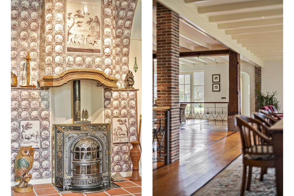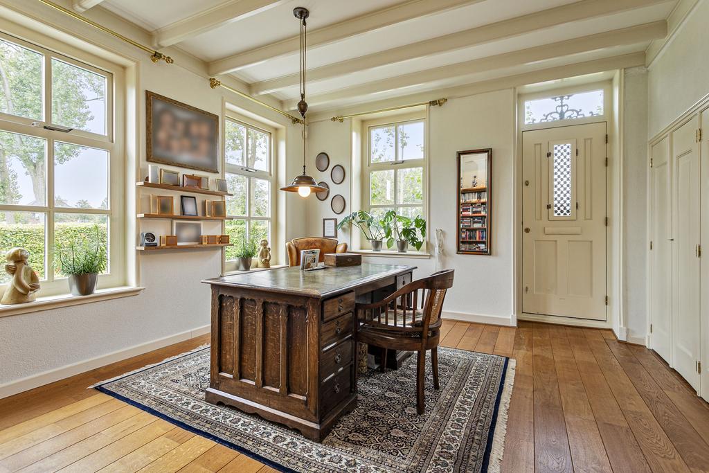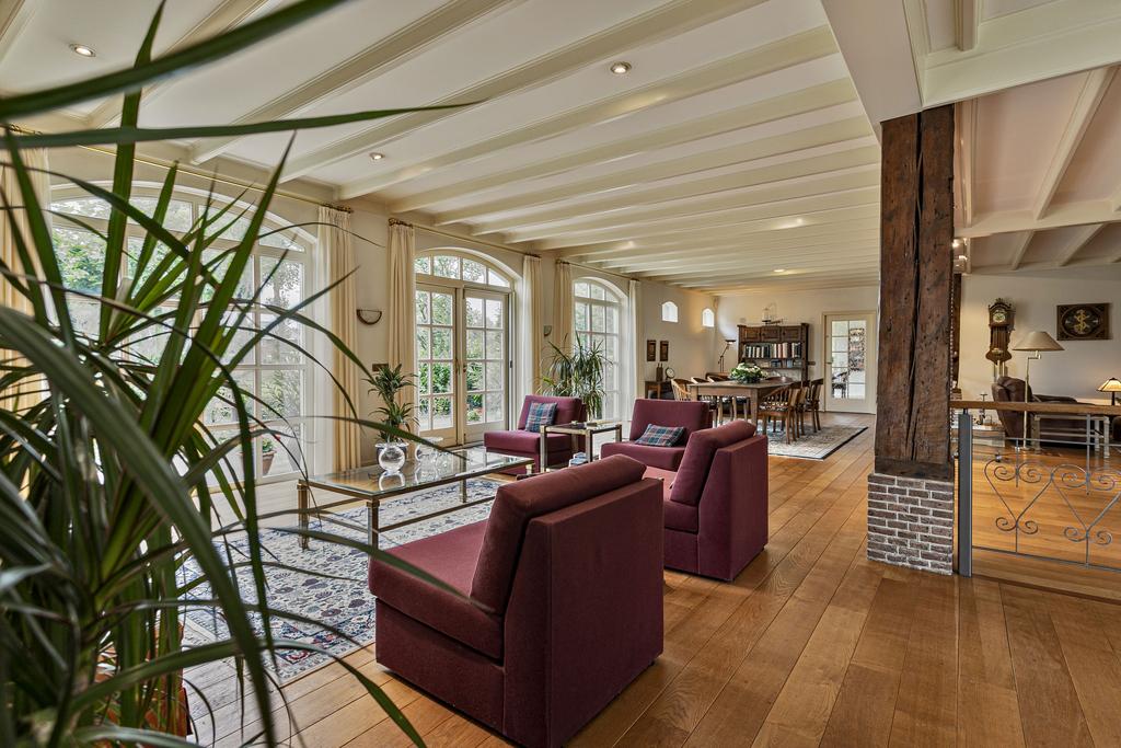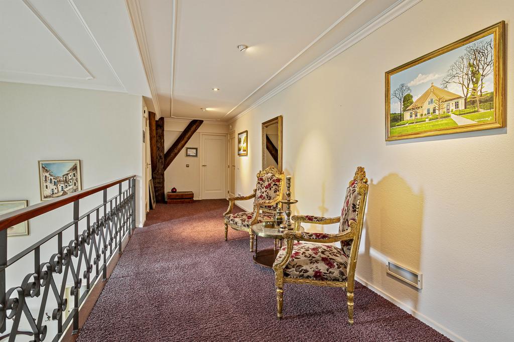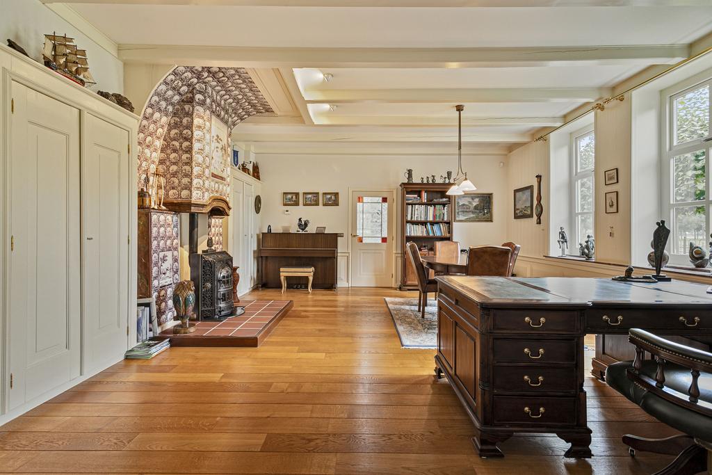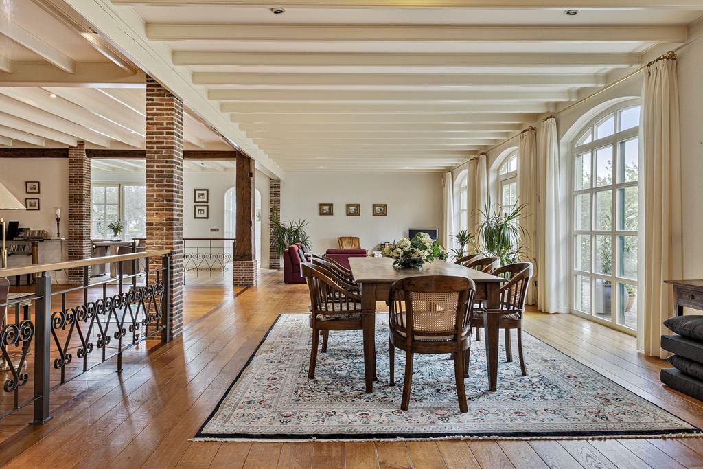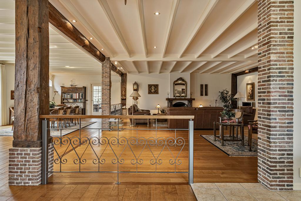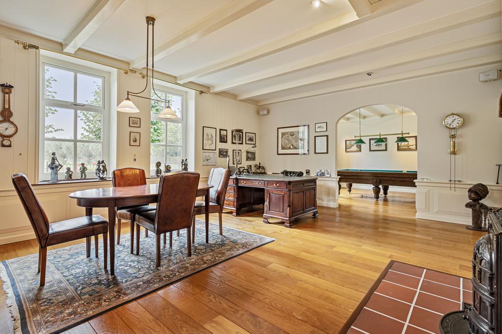 A grand entrance hall with impressive mezzanine welcomes you, leading through double doors into the light-filled living room with large windows overlooking the garden. The entire ground floor features underfloor heating and continuous wooden flooring. At the front of the house are the billiard room and two office spaces, which can easily serve other purposes. A characteristic feature of a ‘stolp’ farmhouse is the central square structure—still original here—around which you can walk seamlessly from one room to another.