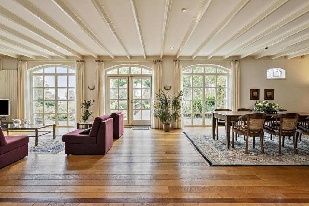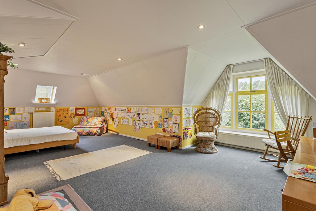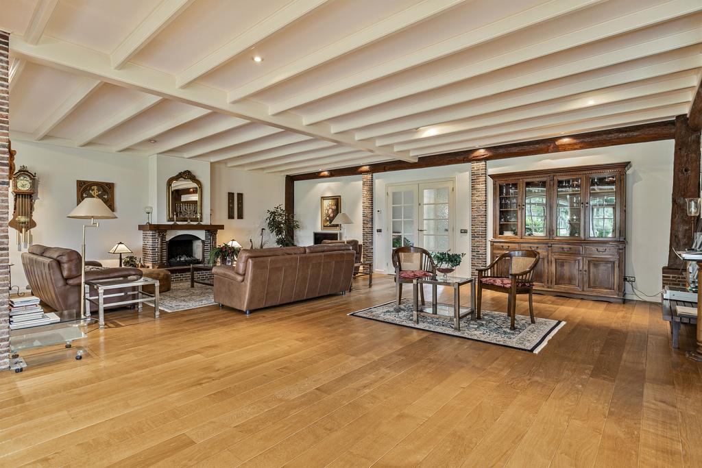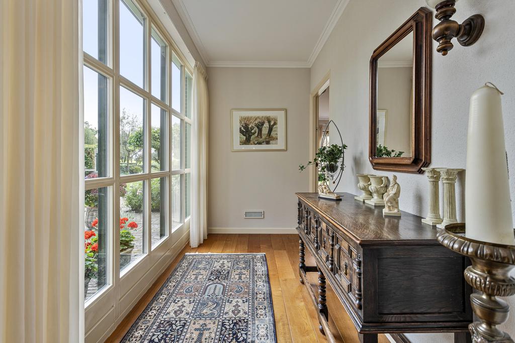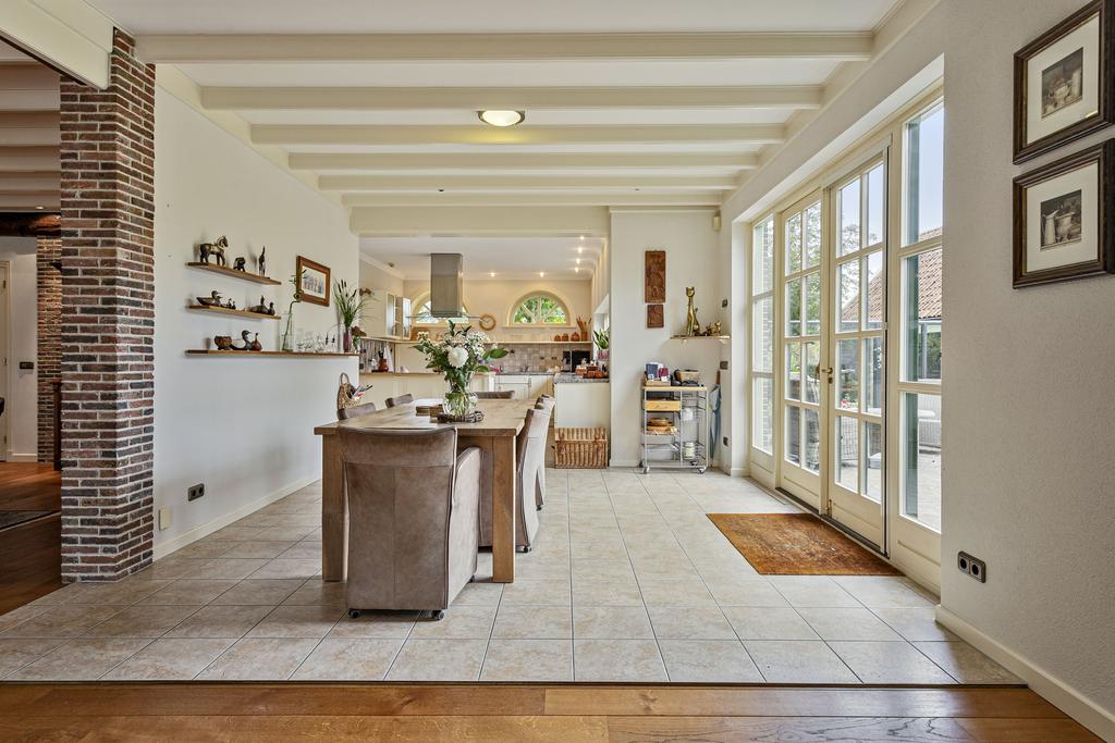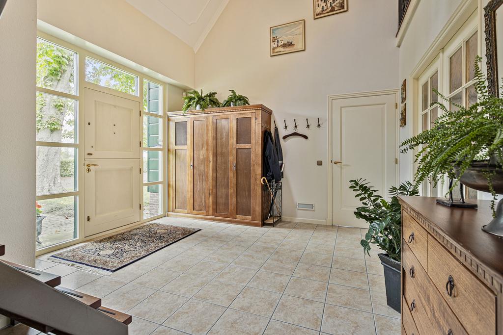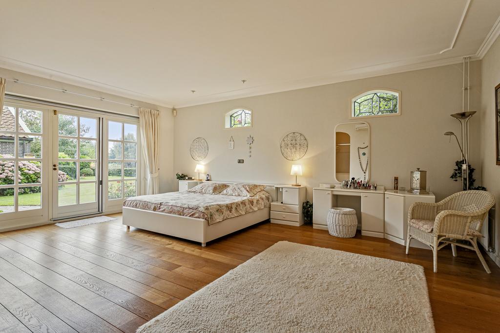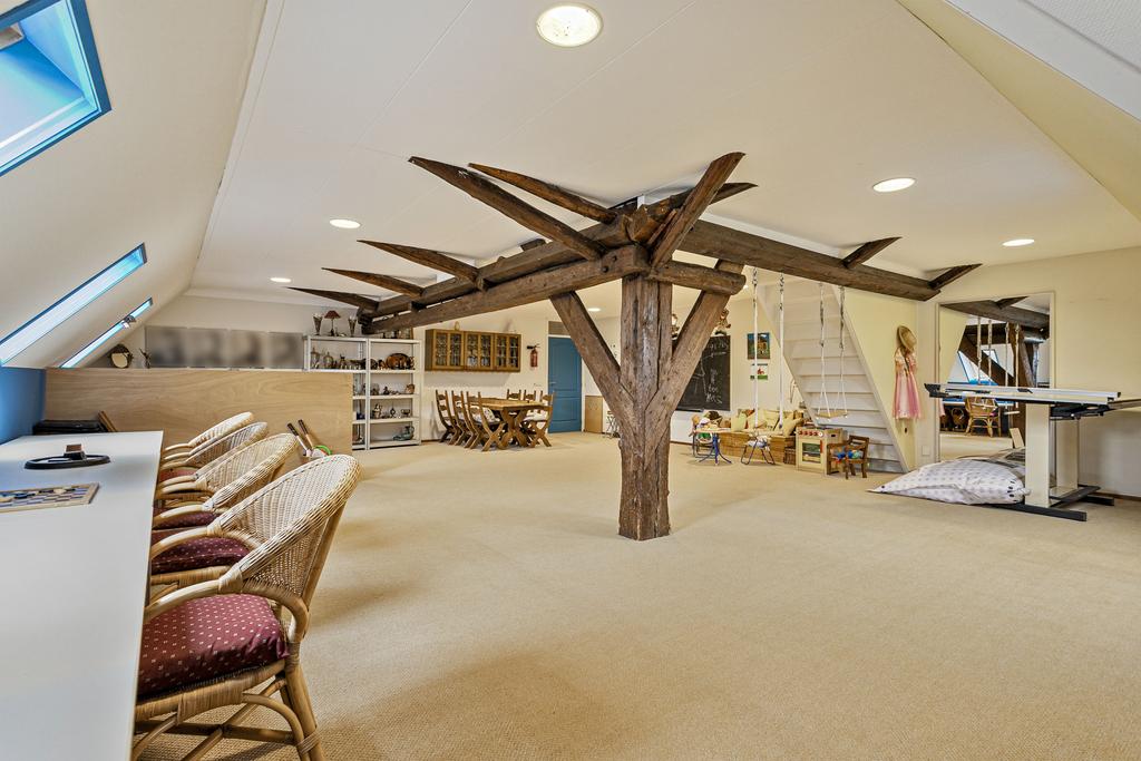 A grand entrance hall with impressive mezzanine welcomes you, leading through double doors into the light-filled living room with large windows overlooking the garden. The entire ground floor features underfloor heating and continuous wooden flooring. At the front of the house are the billiard room and two office spaces, which can easily serve other purposes. A characteristic feature of a ‘stolp’ farmhouse is the central square structure—still original here—around which you can walk seamlessly from one room to another.