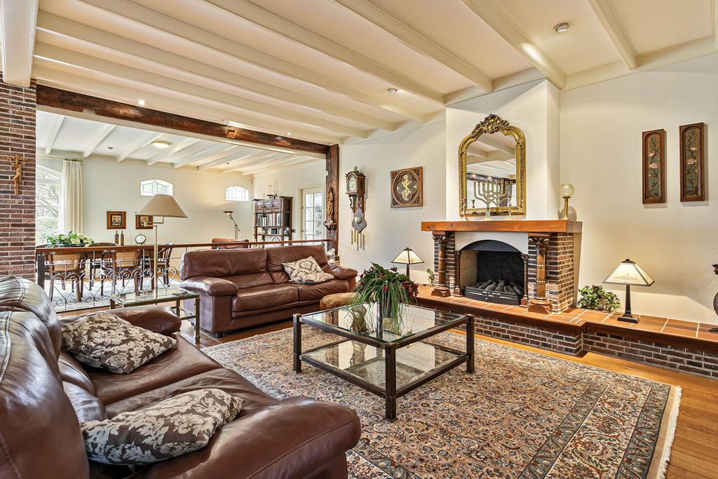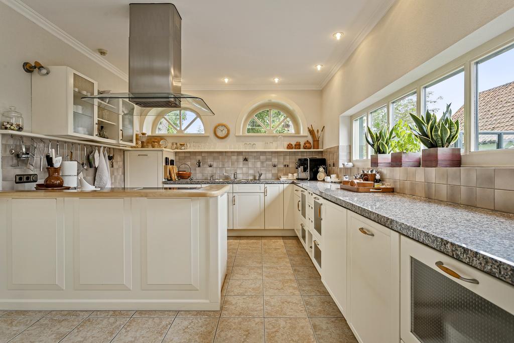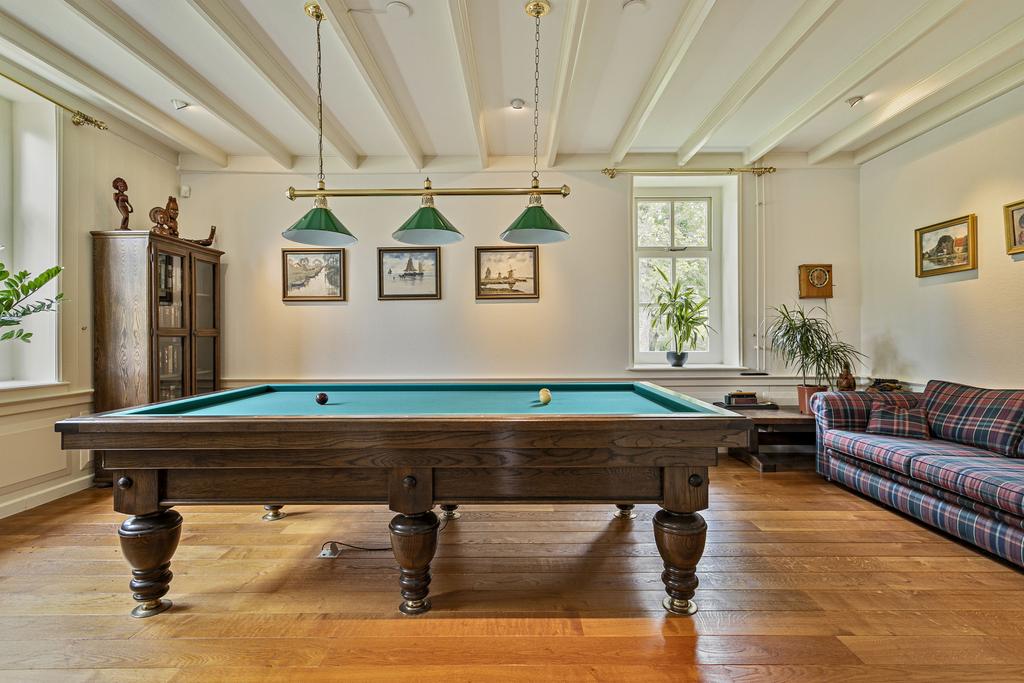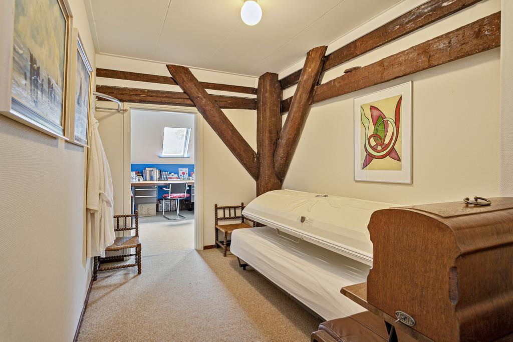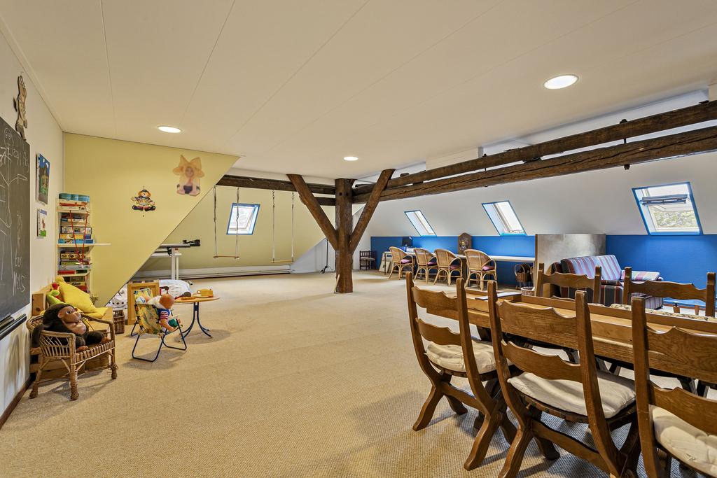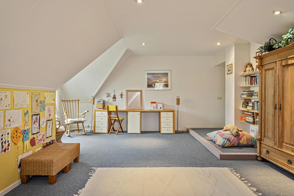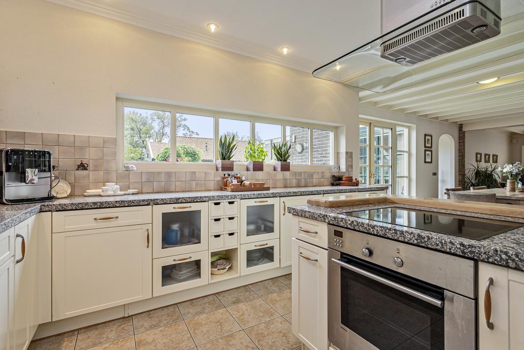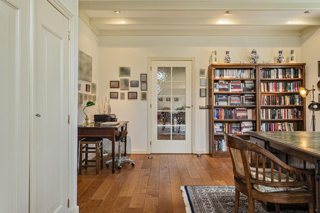 A grand entrance hall with impressive mezzanine welcomes you, leading through double doors into the light-filled living room with large windows overlooking the garden. The entire ground floor features underfloor heating and continuous wooden flooring. At the front of the house are the billiard room and two office spaces, which can easily serve other purposes. A characteristic feature of a ‘stolp’ farmhouse is the central square structure—still original here—around which you can walk seamlessly from one room to another.