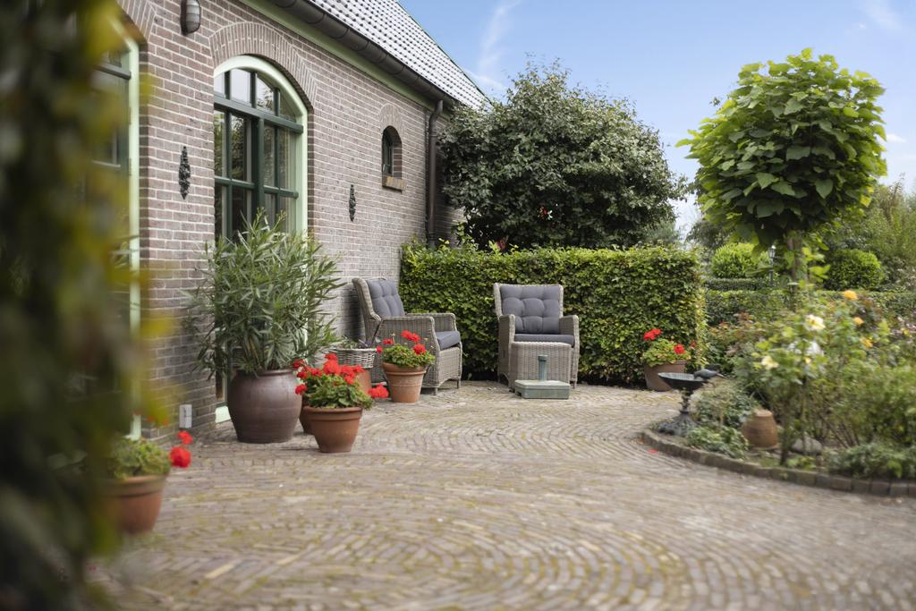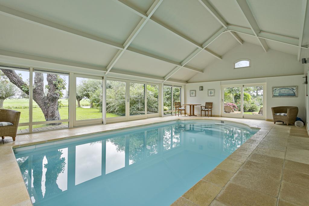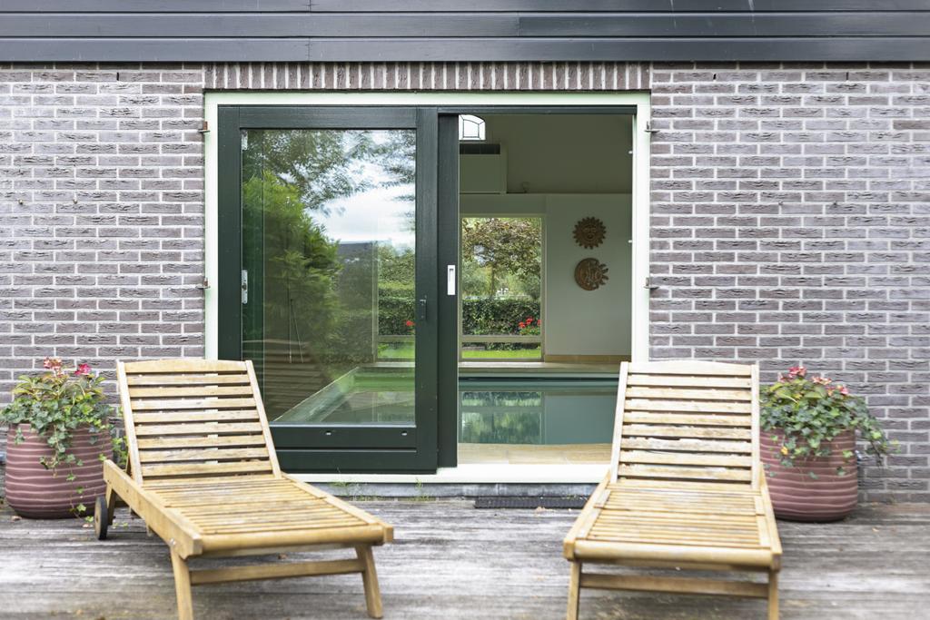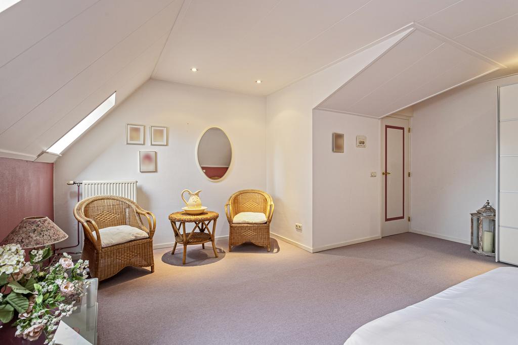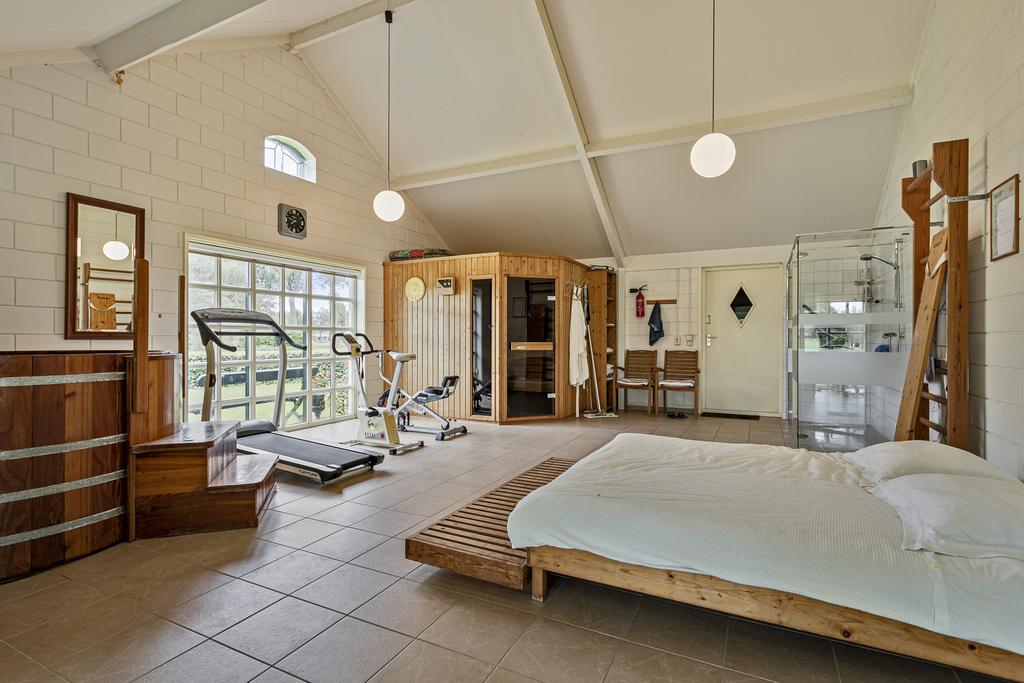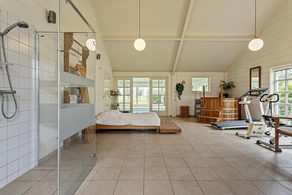 Aan de achterzijde van de boerderij is vanuit een hal de riante master bedroom met eigen badkamer met bad, dubbele wastafel, douche en bidet, apart toilet, inloop kast en deur naar de tuin. Vanuit hier loop je zo naar het badhuis waar je heerlijk baantjes kunt trekken in het overdekte zwembad, in de sauna kunt ontspannen en op het terras kunt genieten van het uitzicht over de tuin en de weilanden.