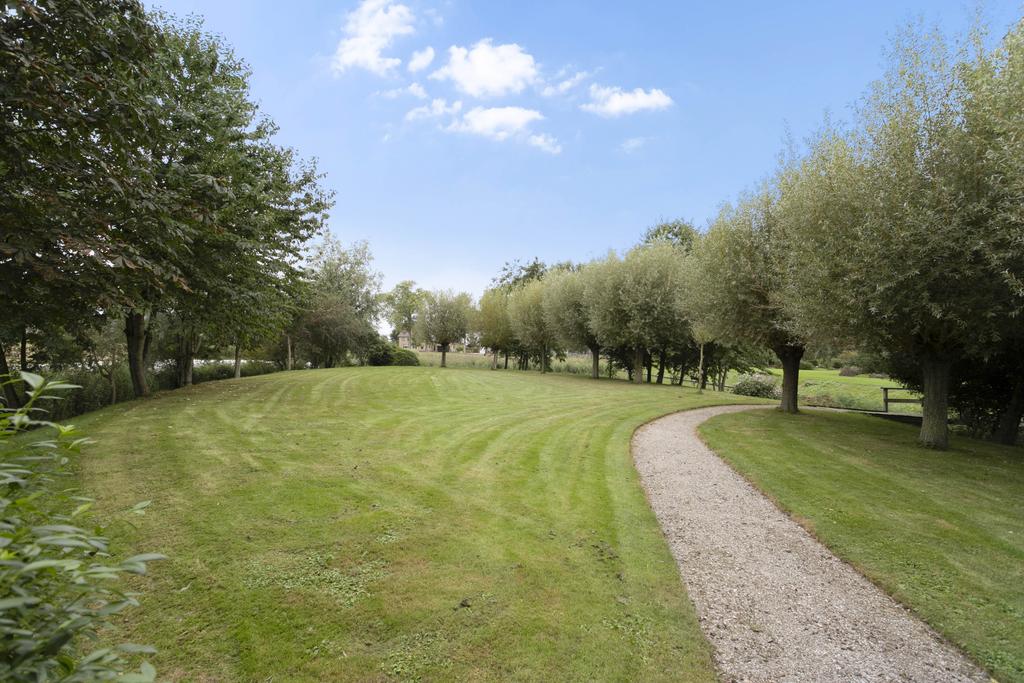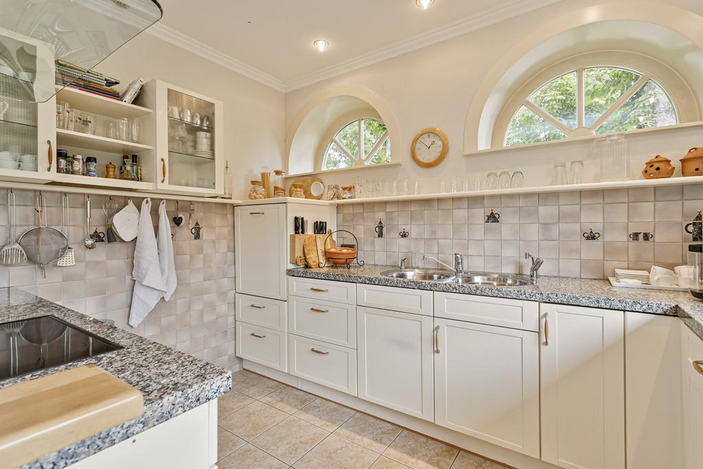 The living room offers multiple seating areas and connects to the dining room, which opens to a sheltered part of the garden through French doors. The kitchen is arranged in a corner layout, equipped with all necessary built-in appliances, and connects to the utility room.