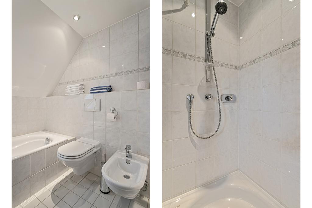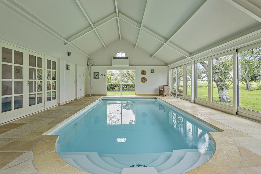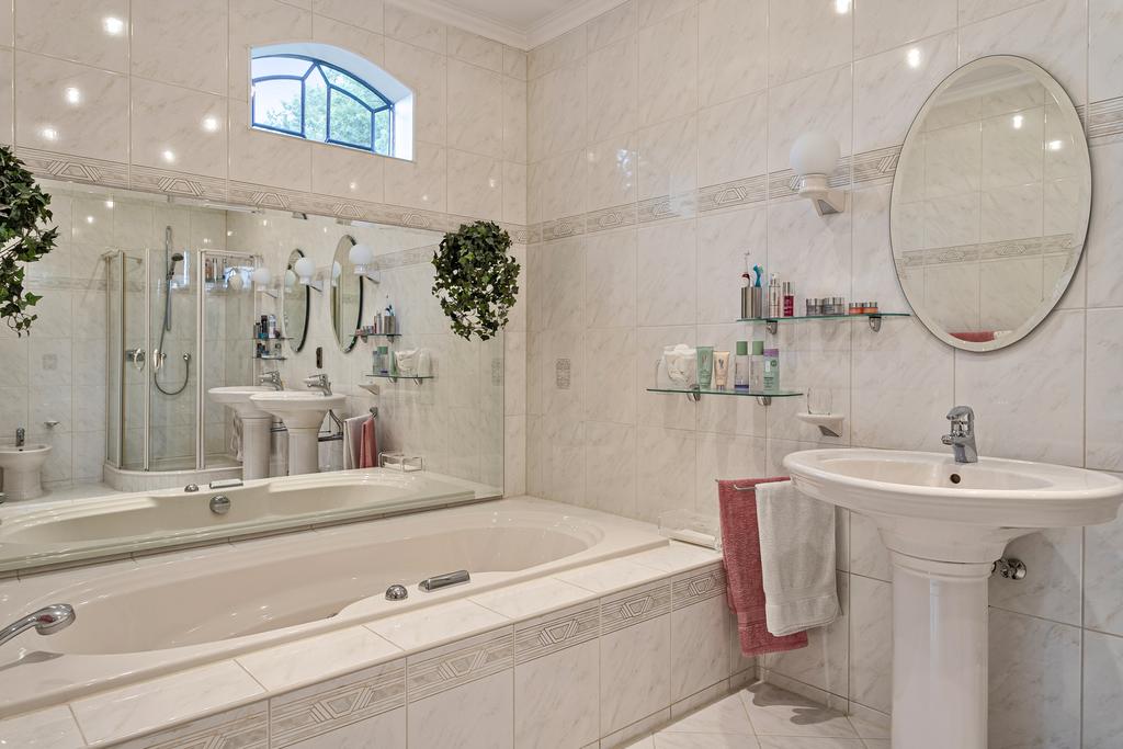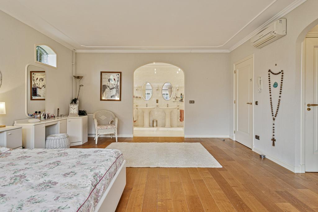 At the rear of the house, a hallway leads to the spacious master bedroom, complete with ensuite bathroom featuring a bathtub, double washbasin, shower, bidet, separate toilet, walk-in closet, and garden access. From here, you walk straight into the wellness building where you can enjoy laps in the indoor pool, relax in the sauna, or unwind on the terrace while taking in the garden and meadow views.