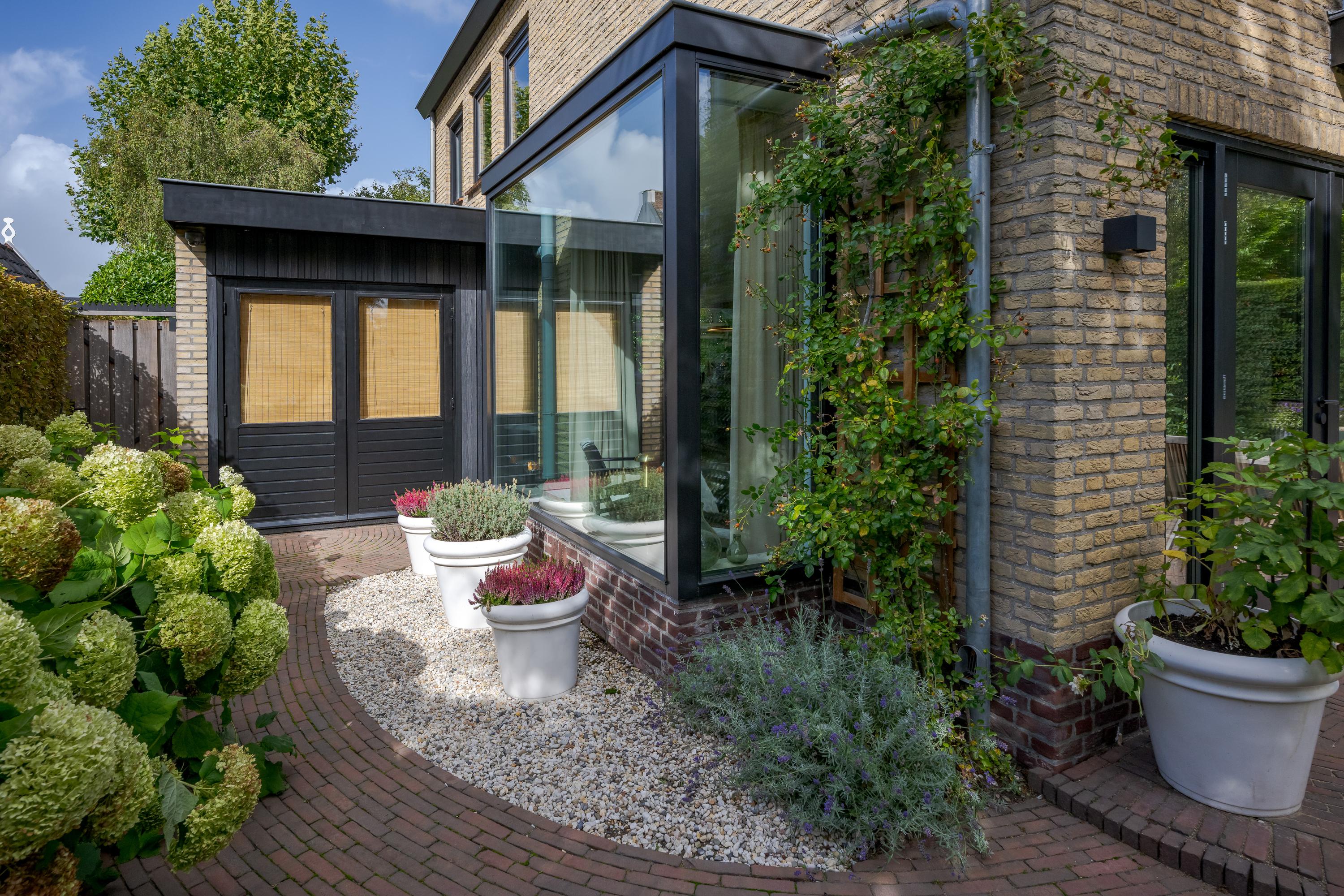 Daarnaast beschikt de woning over een ruime oprit met plaats voor meerdere auto’s, een oplaadpunt, een zonnige voortuin (ca. 100 m²) met beschut terras op het zuiden én een fraai aangelegde achtertuin (ruim 200 m²) op het westen en noorden, voorzien van meerdere terrassen en een irrigatiesysteem.