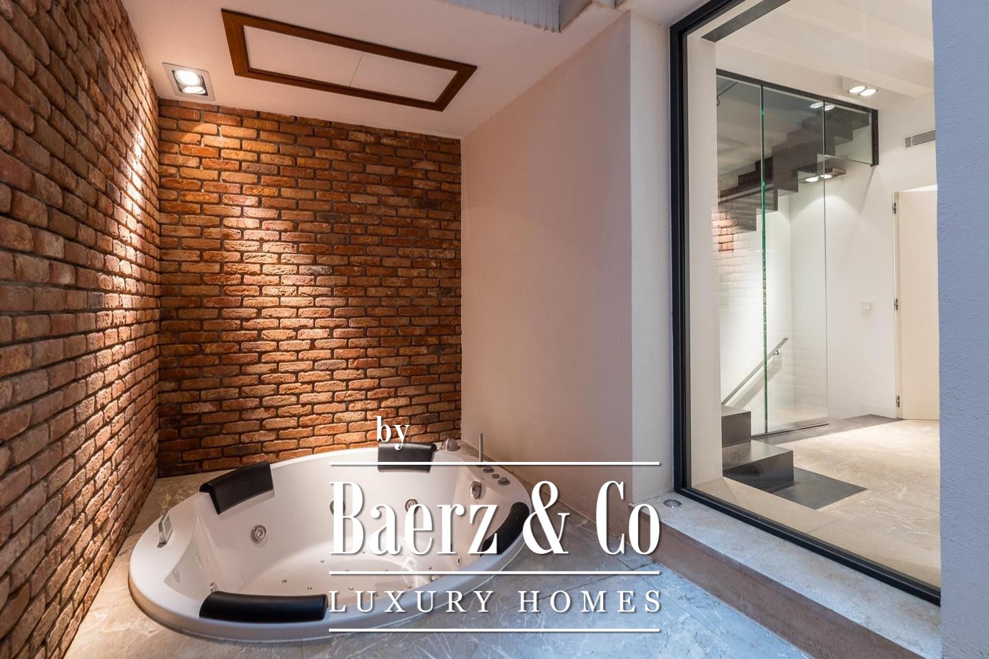 Het souterrain biedt een veelzijdige ruimte, flexibel in te richten als wijnkelder, tv-kamer of opslagplek, zodat u deze naar wens kunt gebruiken. Op de bovenverdieping bevinden zich twee slaapkamers, elk met ingebouwde kasten en en-suite badkamers. Een interne balkonstructuur laat veel daglicht binnen en versterkt het gevoel van rust. Materialen zoals staal, natuursteen, hout en zichtbaar metselwerk worden gecombineerd met vloerverwarming en airconditioning via een warmtepomp. Massief houten ramen en luiken geven het geheel een authentieke, warme uitstraling.
