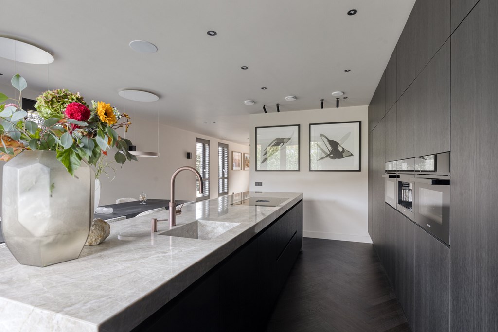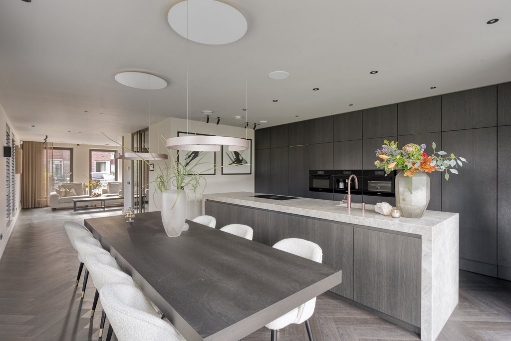 De moderne leefkeuken vormt het hart van het huis en is uitgerust met hoogwaardige apparatuur. Het keukenblad is uitgevoerd in Pure Kwartsiet, een stijlvol en duurzaam natuursteen. U kookt op een Bora inductiekookplaat met geïntegreerde afzuiging, terwijl de Miele-ovens en inbouw koffiemachine en de grote koelkast, vriezer en vaatwasser van Siemens zorgen voor optimaal kookcomfort. De keuken biedt voldoende ruimte voor een royale eettafel en heeft openslaande deuren naar het terras, waardoor u direct buiten kunt dineren of ontspannen.