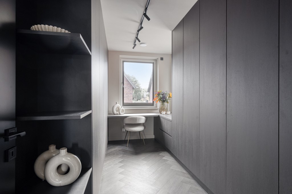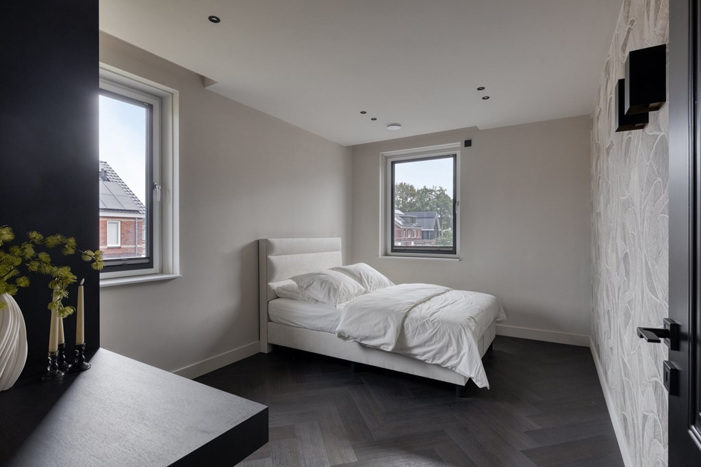 De moderne badkamer is volledig betegeld en voorzien van een inloopdouche met glazen wand, een dubbele wastafel met spiegel en Sonos-speaker. Op de overloop bevindt zich een separate toiletruimte met zwevend toilet. Alles straalt kwaliteit en comfort uit.