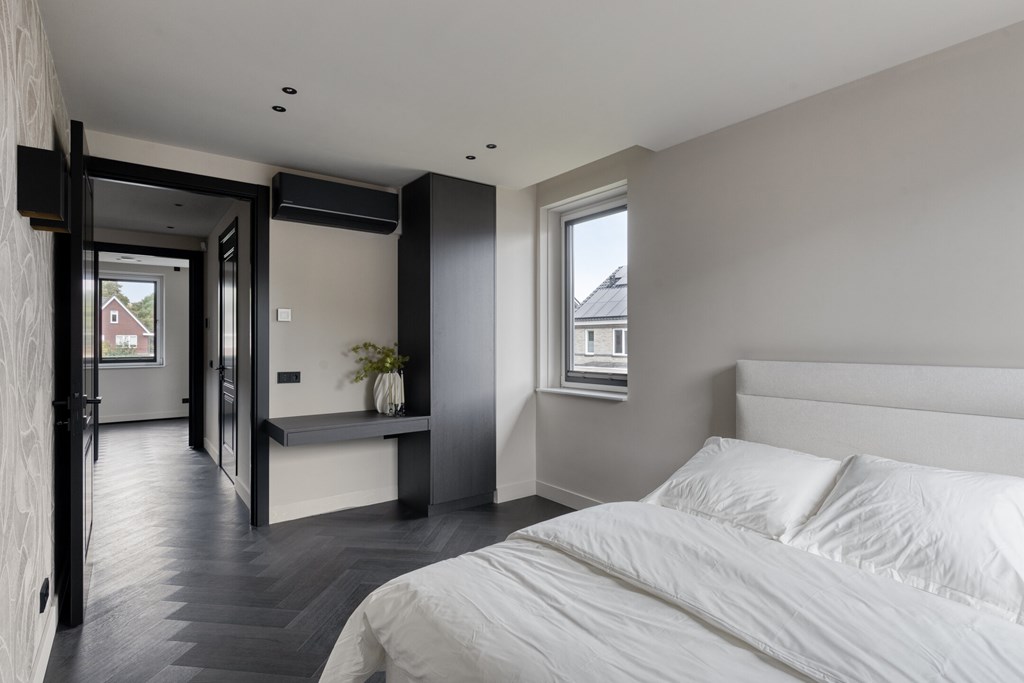 De trap in de hal leidt naar de eerste verdieping, waar u drie ruime slaapkamers en een hoogwaardig ingerichte badkamer aantreft. De gehele verdieping beschikt over vloerverwarming en vloerkoeling. Twee slaapkamers zijn voorzien van airconditioning en maatwerk kasten en bureaus. De derde slaapkamer is ingericht als kastenkamer. Bovendien zijn er screens geplaatst voor optimaal comfort in elk seizoen.