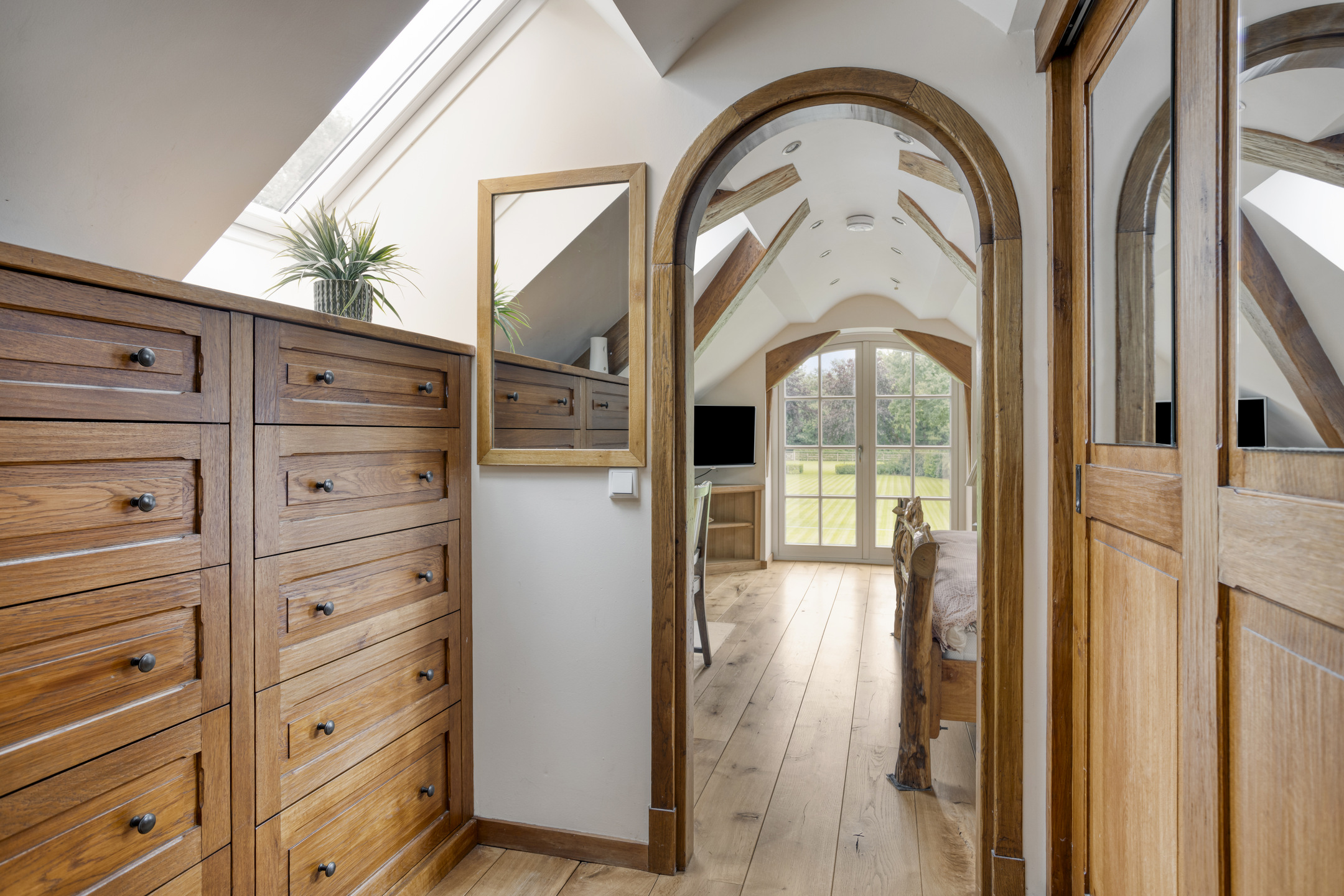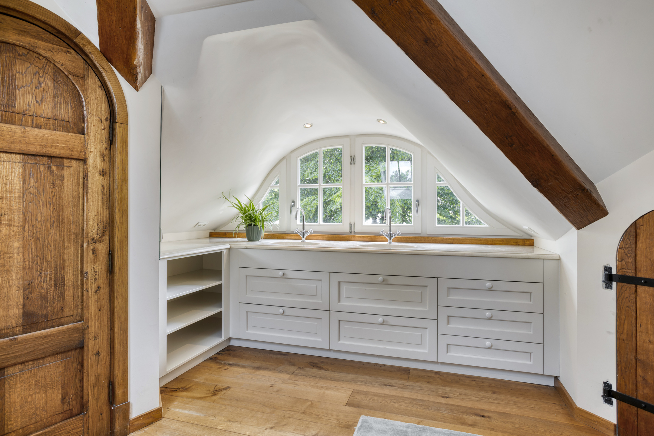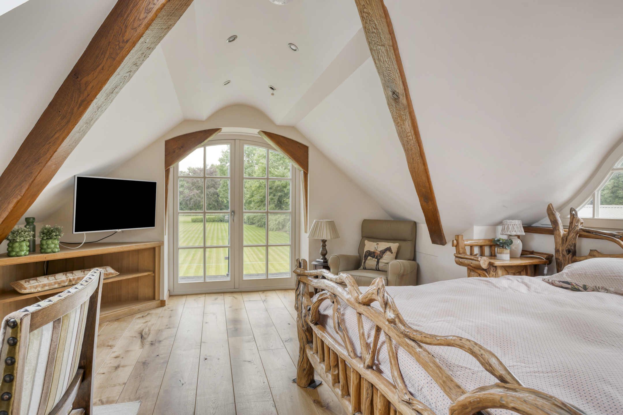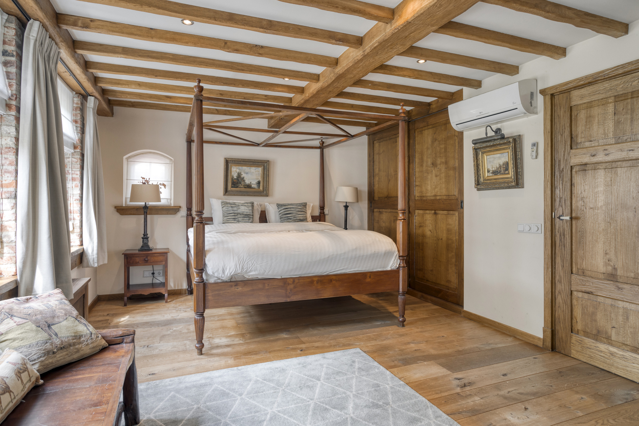 De zeer ruime slaapkamer 4 is voorzien van een houten vloer, een plafond met een zeer bijzondere balkenconstructie, twee dakkapellen en een grote walk in closet. Een grote karakteristieke raampartij biedt een prachtig uitzicht over de parkachtige tuin. Badkamer 2 is voorzien van marmeren vloer- en wandbetegeling, een dakkapel, sierradiator, wandcloset, ligbad, douche en dubbele wastafel in meubel.