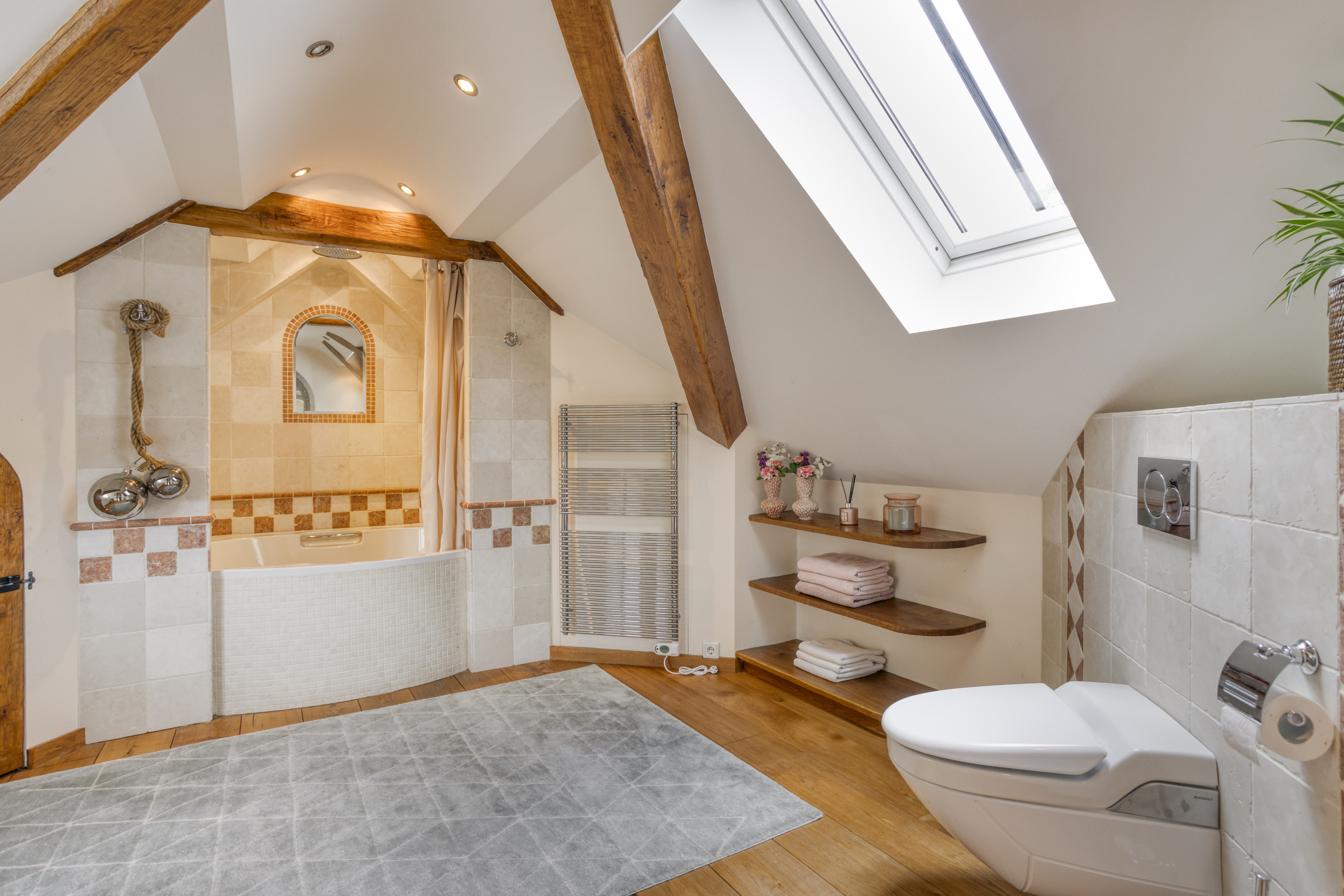 Royale overloop voorzien van een houten vloer en dakraam. Vanuit de overloop is badkamer 2 en de hal naar slaapkamer 2 bereikbaar. Deze hal is voorzien van twee grote inbouwkasten. De ruime slaapkamer 2 is voorzien van een houten vloer, een plafond met een karakteristieke balkenconstructie en inbouwspots, dakraam en dakkapel. Vanuit deze slaapkamer bieden openslaande deuren toegang tot een groot balkon dat een prachtig uitzicht biedt op de parkachtige tuin. De riante badkamer 2 heeft een houten vloer, wandbetegeling, een plafond met karakteristieke balkenconstructie en inbouwspots, dakraam en dakkapel. De badkamer is verder voorzien van een groot badkamermeubel met marmeren blad en dubbele wastafel, sierradiator, wandcloset en ligbad met douche functie. Vanuit de badkamer is de ruimte bereikbaar waarin zich de opstelling van de CV-combiketel bevindt.