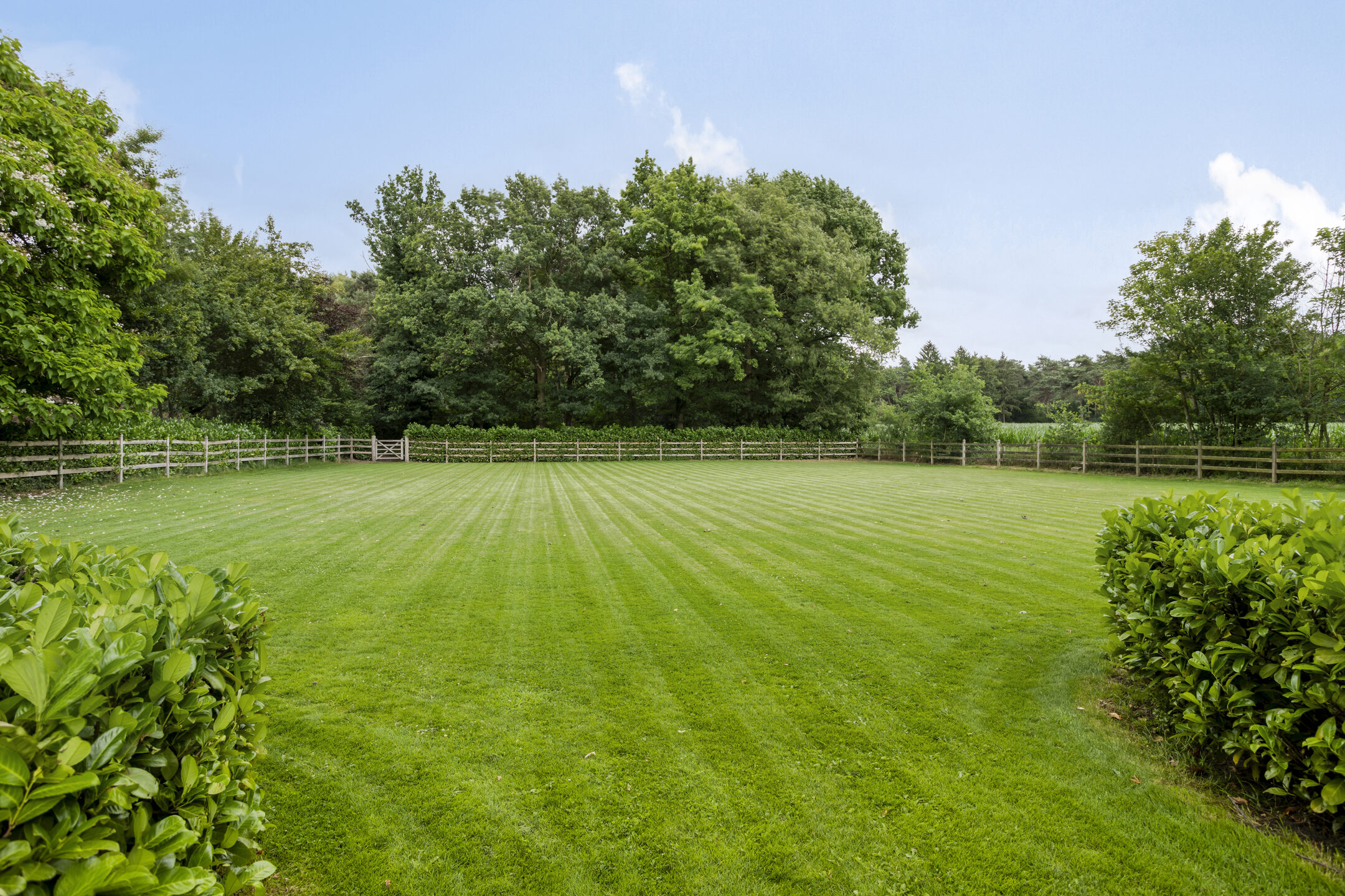 De magnifieke achtertuin is voorzien van een zeer groot gazon, volwassen bomen en borders met diverse beplanting. Vanuit het gazon leidt een natuurlijke doorgang naar een tweede perfect onderhouden gazon. Aan de achterzijde grenst de tuin aan het groen zodat rust en privacy gegarandeerd zijn. De tuin is verder voorzien van een beregeningsinstallatie en diverse elektrapunten.