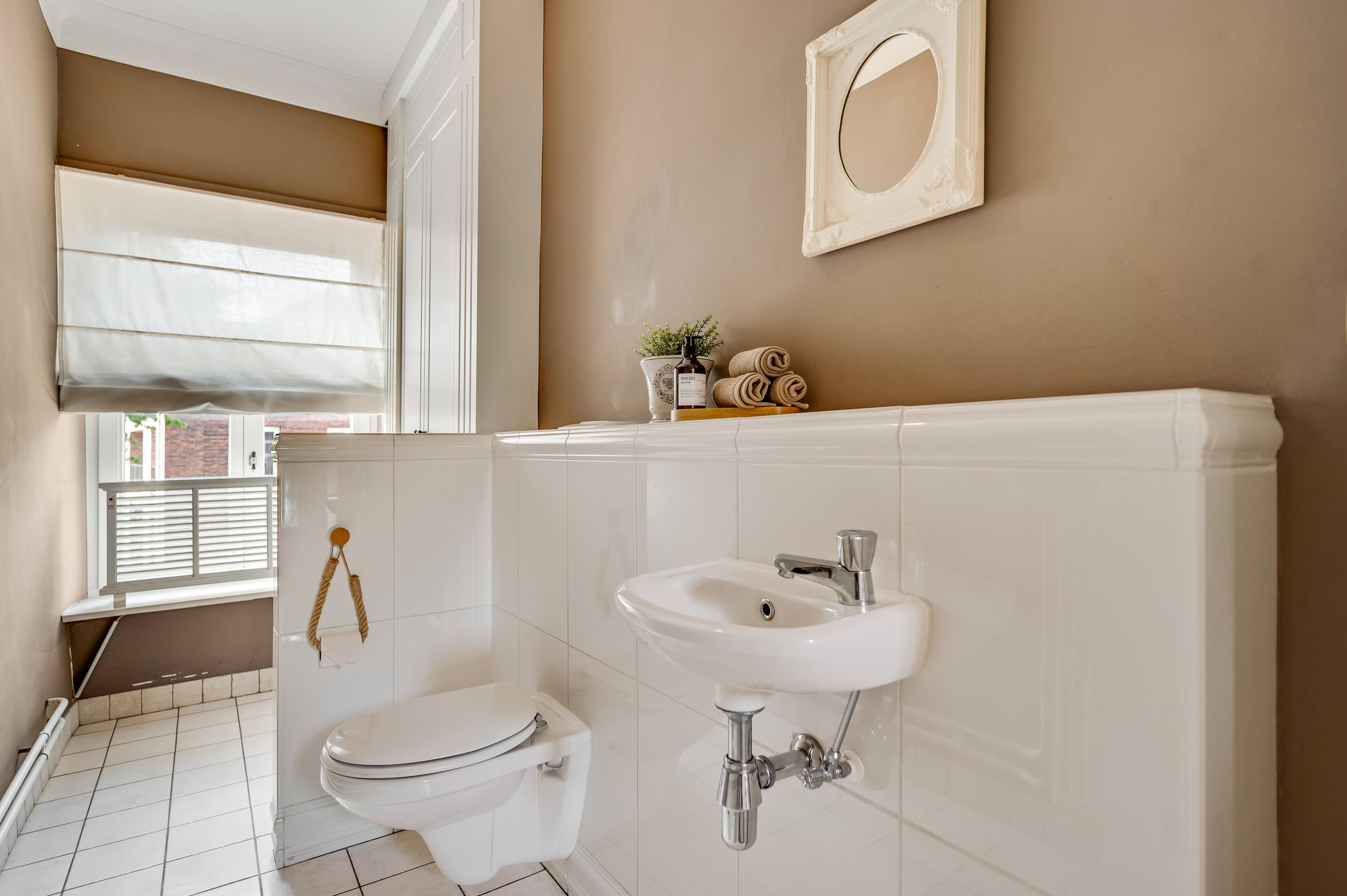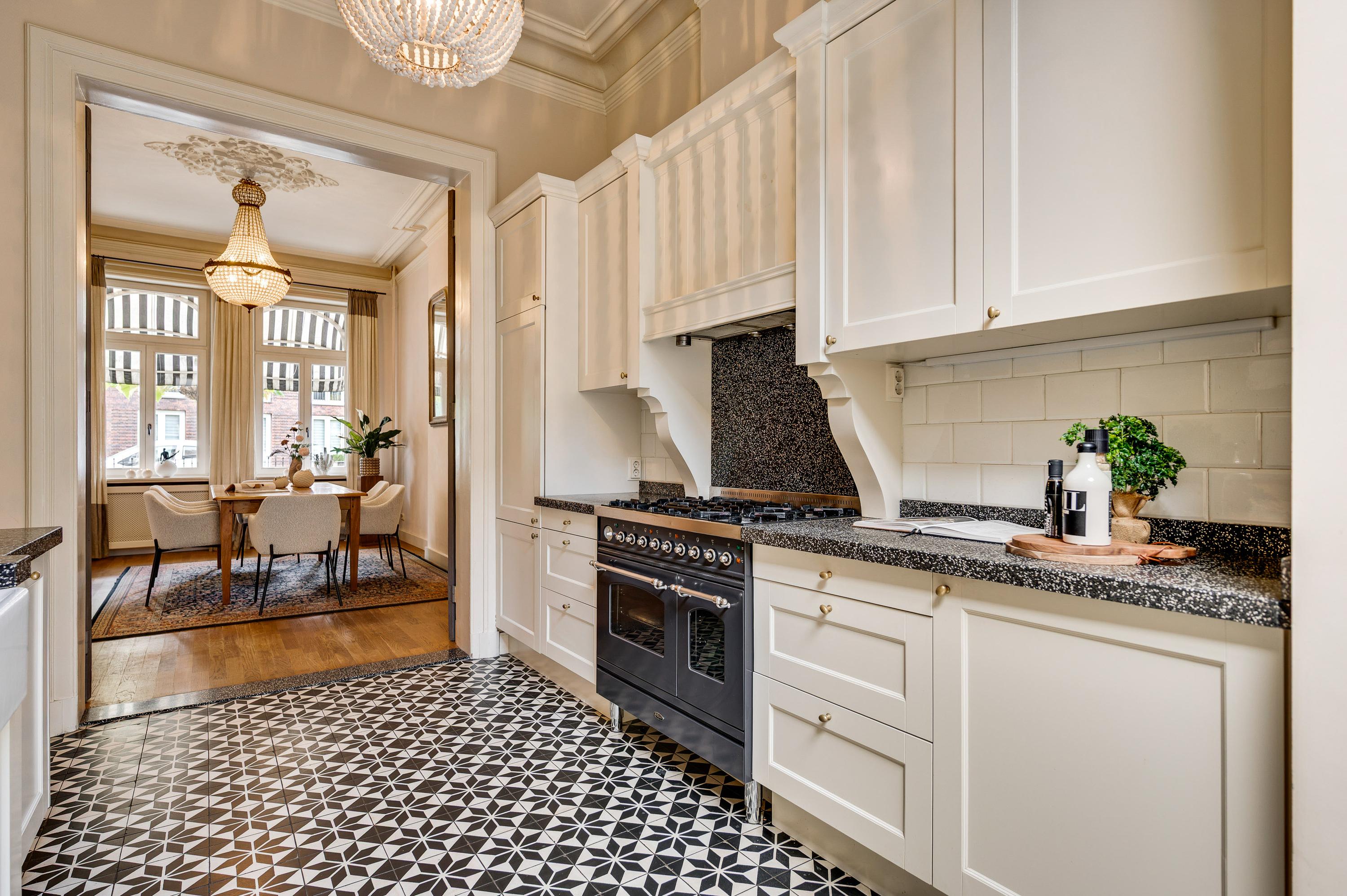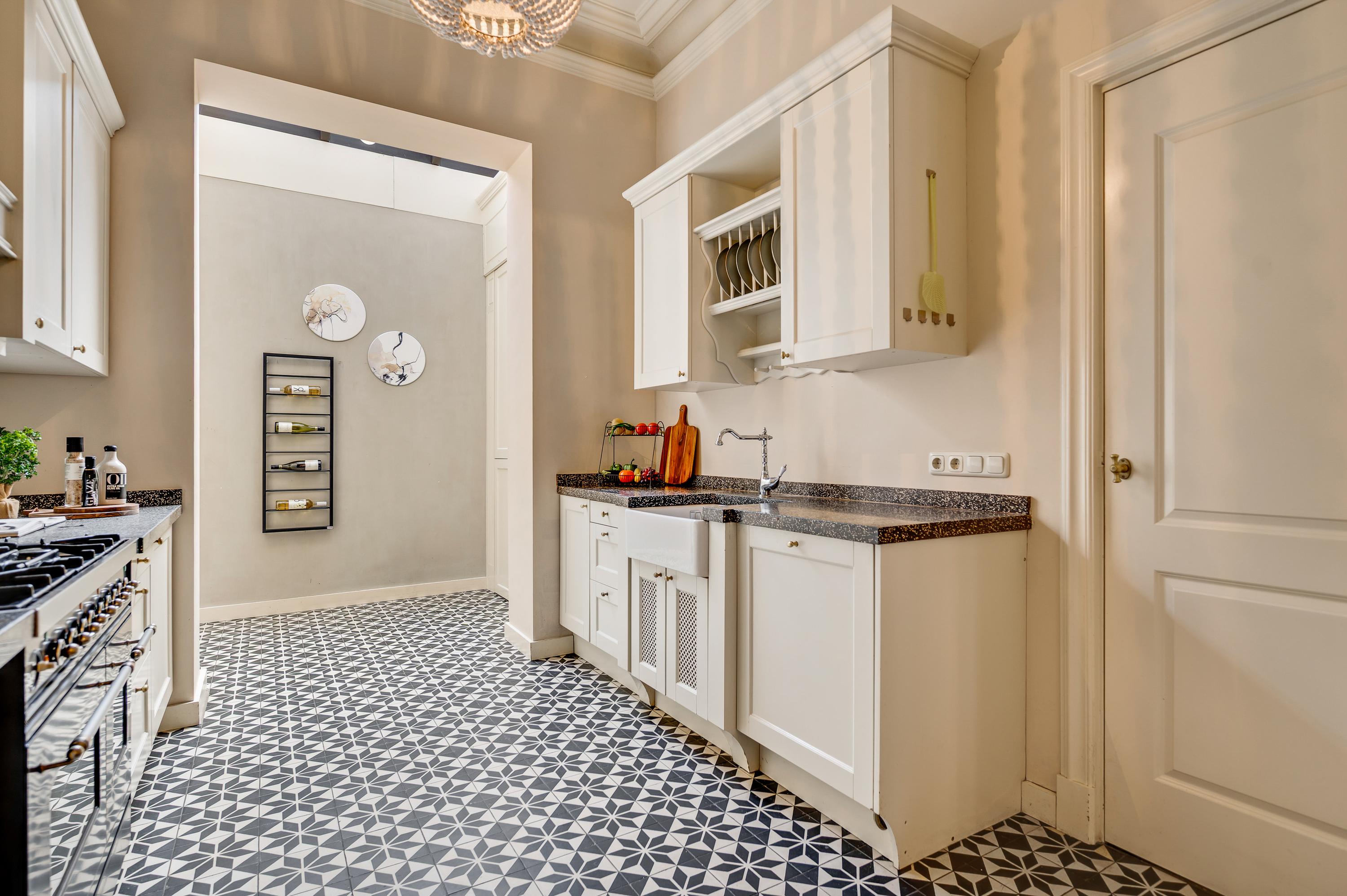 Vanuit de statige hal bereikt u de indrukwekkende woonkeuken van circa 25 m². Deze is uitgerust met een luxe keukenopstelling die klassiek vakmanschap combineert met modern gebruiksgemak. Het terrazzo werkblad, de 6-pits Boretti gasfornuis met dubbele oven, en de hoogwaardige inbouwapparatuur maken deze keuken tot het kloppende culinaire hart van het huis. De klassieke tegelvloer en de hoge paneeldeuren die de keuken van de eetkamer scheiden, benadrukken het verfijnde karakter van de woning.