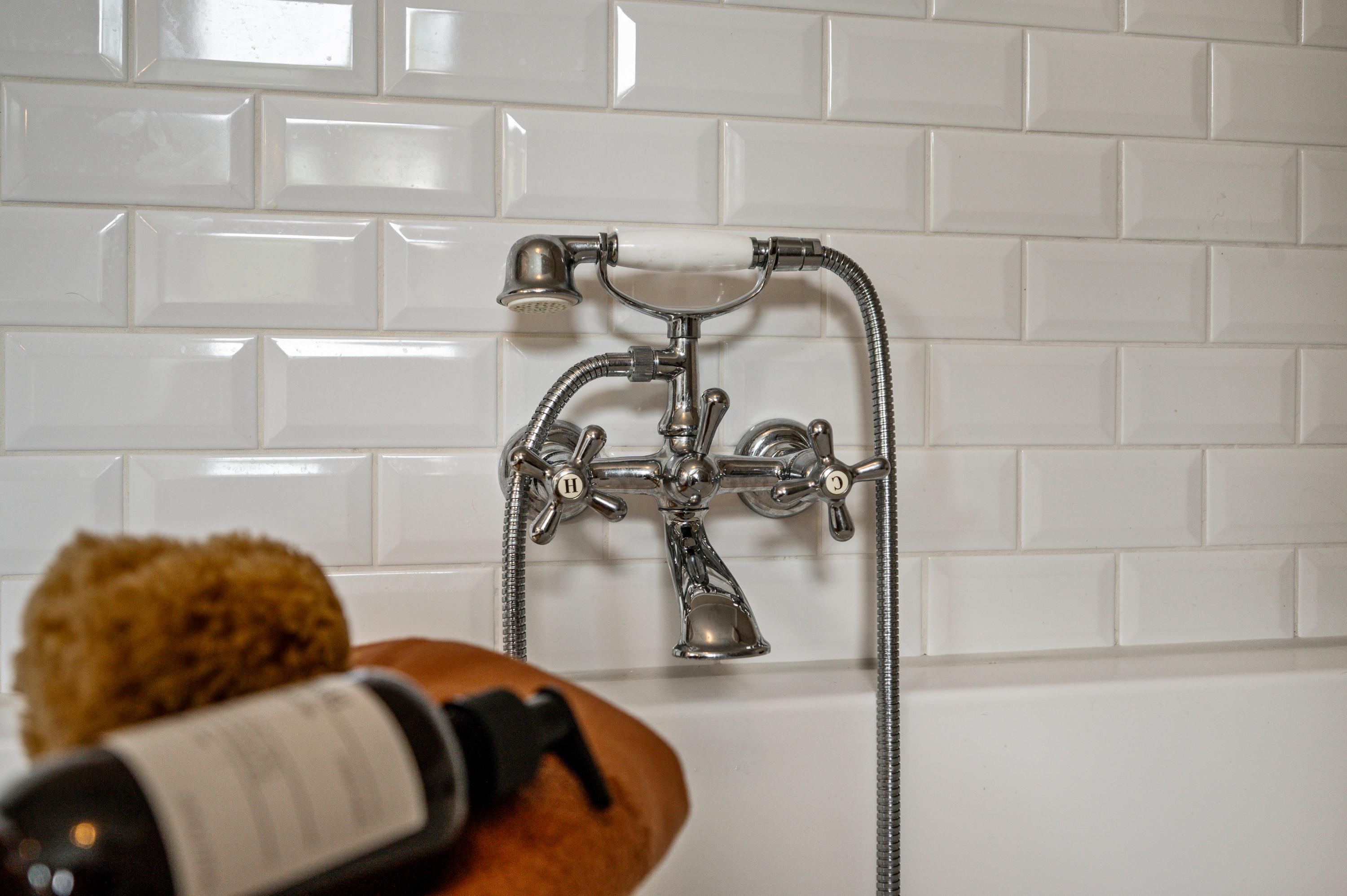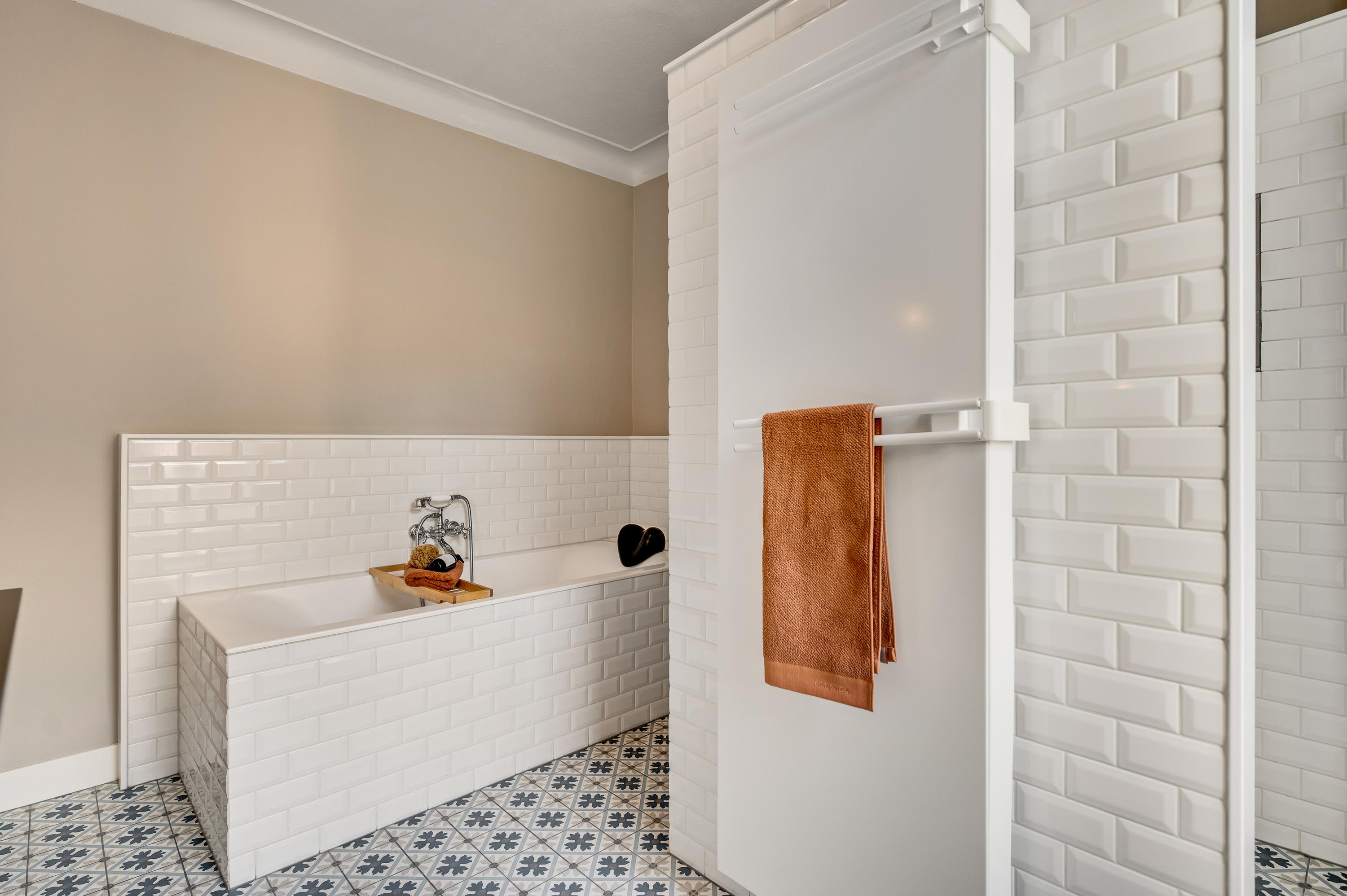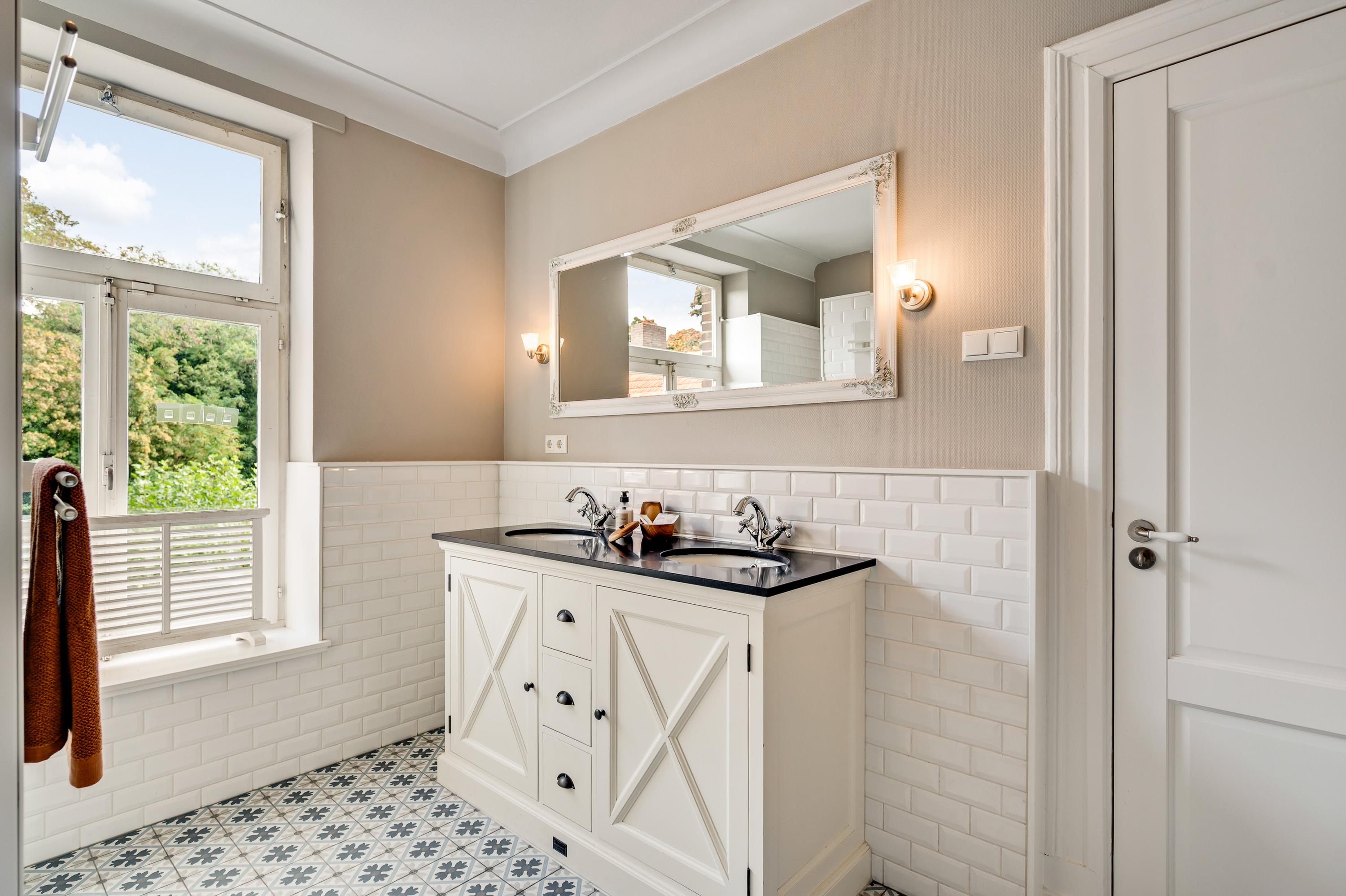De badkamer is voorzien van een dubbele wastafel, ligbad en douche.