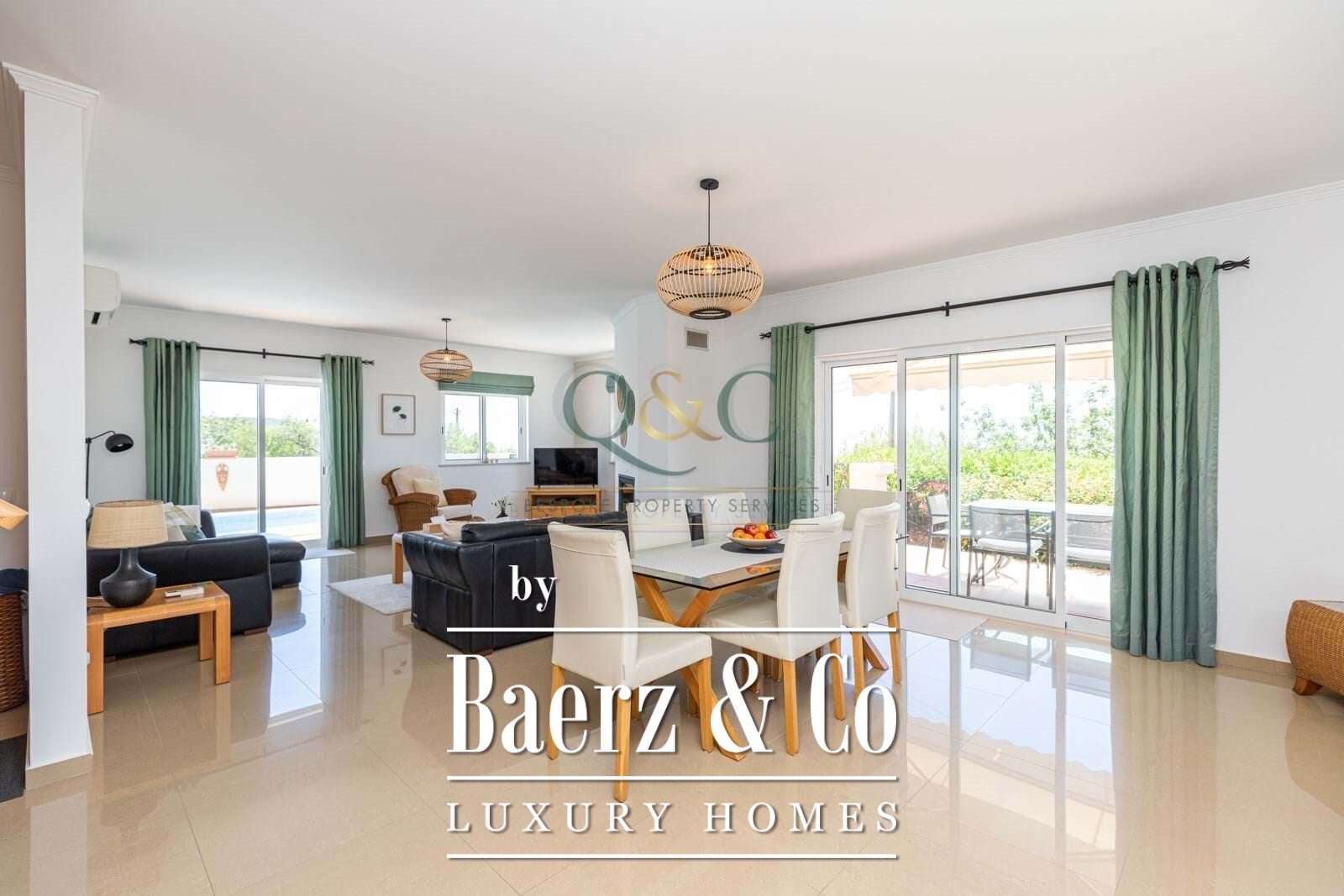 Deze villa in Santa Bárbara de Nexe biedt doordacht wonen over 174 m², beginnend met een inpandige garage en een terras dat het privézwembad omarmt. De entree leidt naar een open woon- en eetkamer, geaccentueerd door een houtkachel. Subtiele overgangen verbinden binnenruimten met overdekte en open terrassen, waardoor licht wordt binnengebracht en het uitzicht op zee en het omliggende landschap wordt geframed.