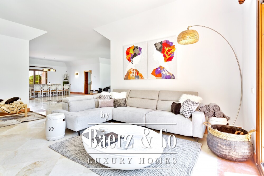 Villa Sotogrande met uitzicht op de bergen en zee bevindt zich in alle rust boven de Almenara Golf Course, omgeven door volgroeide tuinen en het zachte ritme van het mediterrane licht. Deze villa van 744 m² strekt zich uit over een perceel van 2.571 m² en biedt vijf slaapkamers en vijf badkamers, is westelijk georiënteerd en heeft een naadloze toegang tot de tuin.