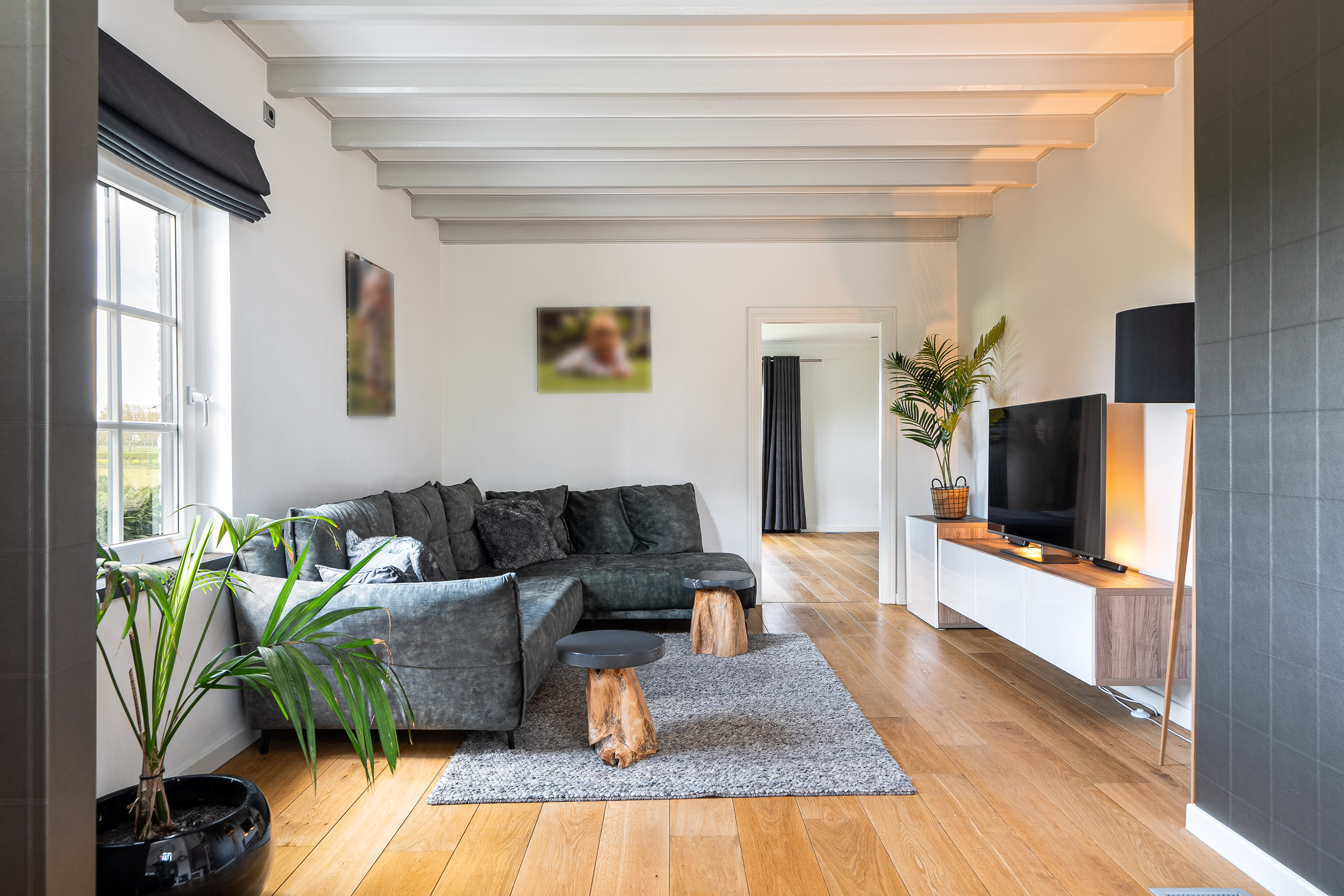 De woonkamer krijgt door de vele raampartijen en de vide veel licht en het uitzicht door elk raam is gefocust op de natuur. De adembenemende vergezichten vervelen hier nooit. De woonkamer heeft diverse sfeerhoeken als een zithoek rond de houthaard, een entertainment hoek en een eethoek. Er ligt een prachtige warme houten vloer voorzien van hete lucht verwarming en de openslaande tuindeuren geven direct toegang tot de gezellige veranda en het terras dat rondom alle privacy biedt.