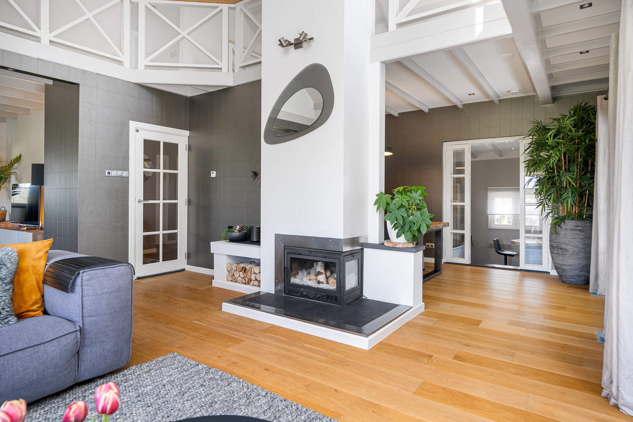 De overloop met vide kijkt uit op de woonkamer en heeft openslaande deuren naar een riant zonneterras (balkon) op het zuiden. Een geweldige plek om de mooiste zons-opgang en -ondergang te beleven. Ook hier voel je volledig privé door de beschutting van de tuin. De vide biedt voldoende plaats voor een gezellige speelhoek, werkplek of bibliotheek.