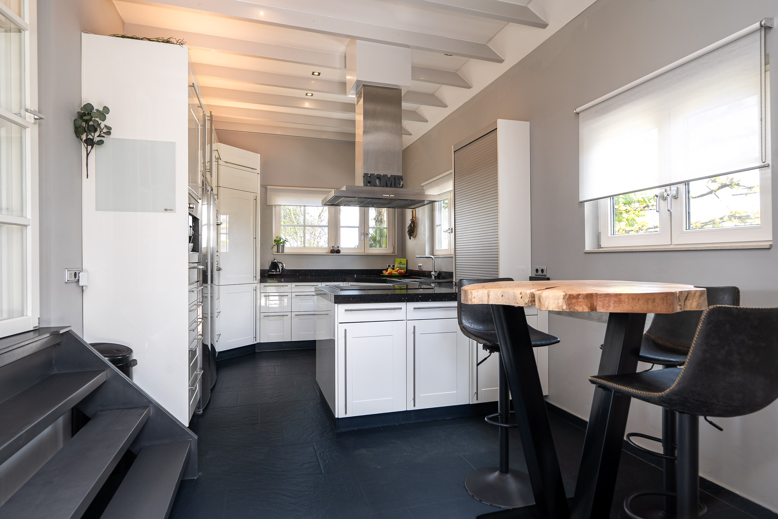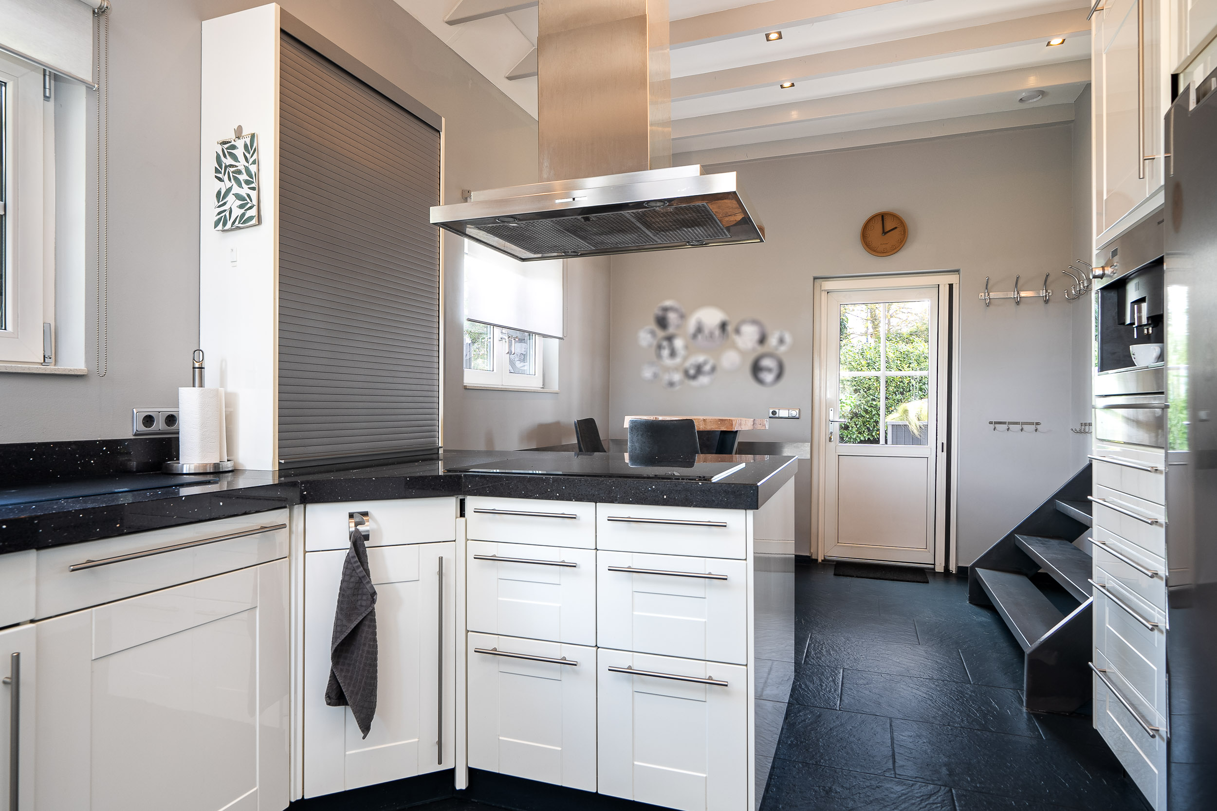 De halfopen woonkeuken is voorzien van diverse inbouwapparatuur en ook hier is een deur naar de tuin. Verwarming middels vloerverwarming. Er is voldoende plaats voor een eethoek in de keuken, maar ook het direct naast de halfopen keuken gelegen knusse woonkamer gedeelte biedt uitstekend ruimte voor een lange eettafel.