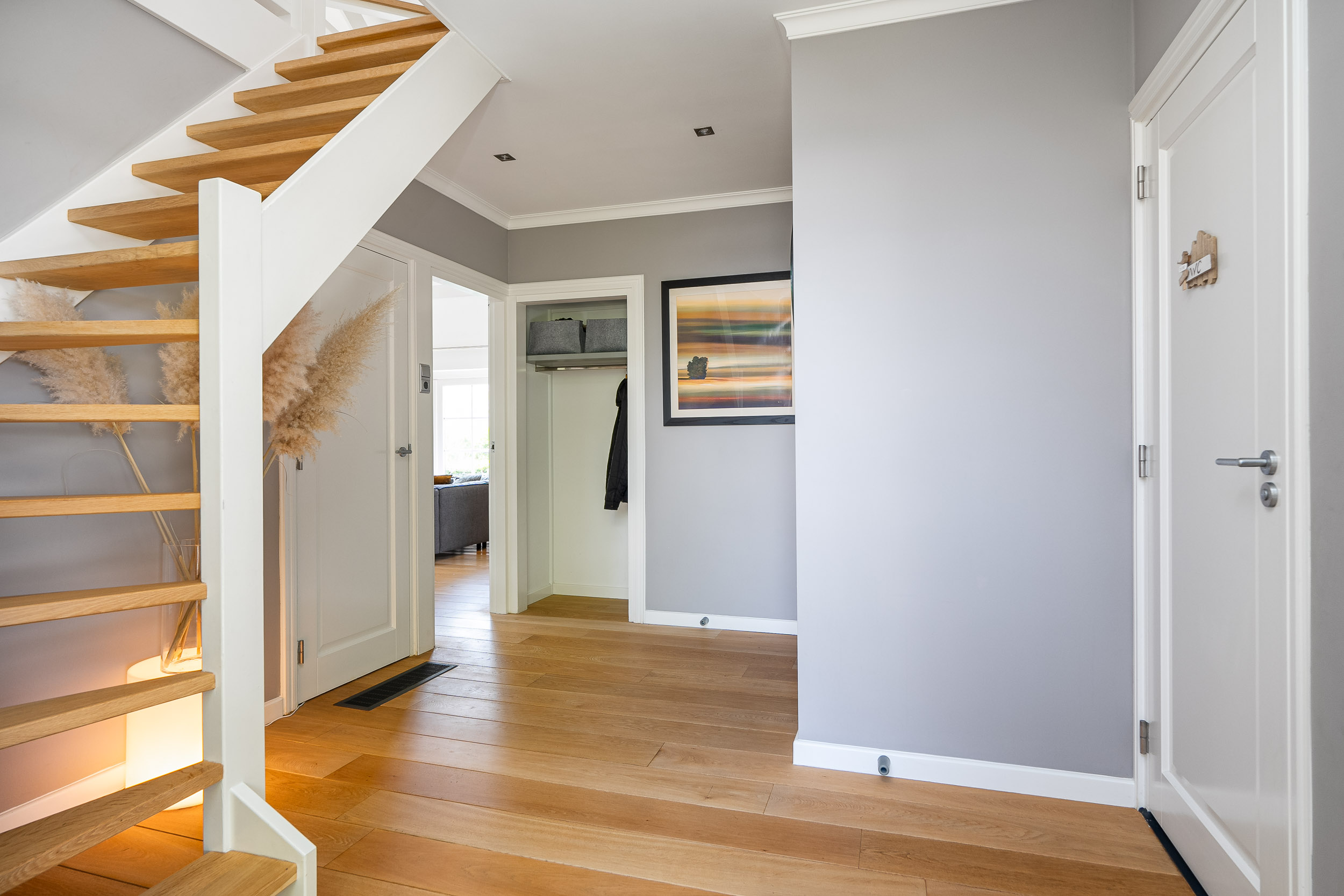 Direct bij het betreden van de woning is het ruimtelijk effect in de hal al voelbaar. Deze geeft toegang naar het gastentoilet, de bijkeuken, de meterkast en de trapopgang.