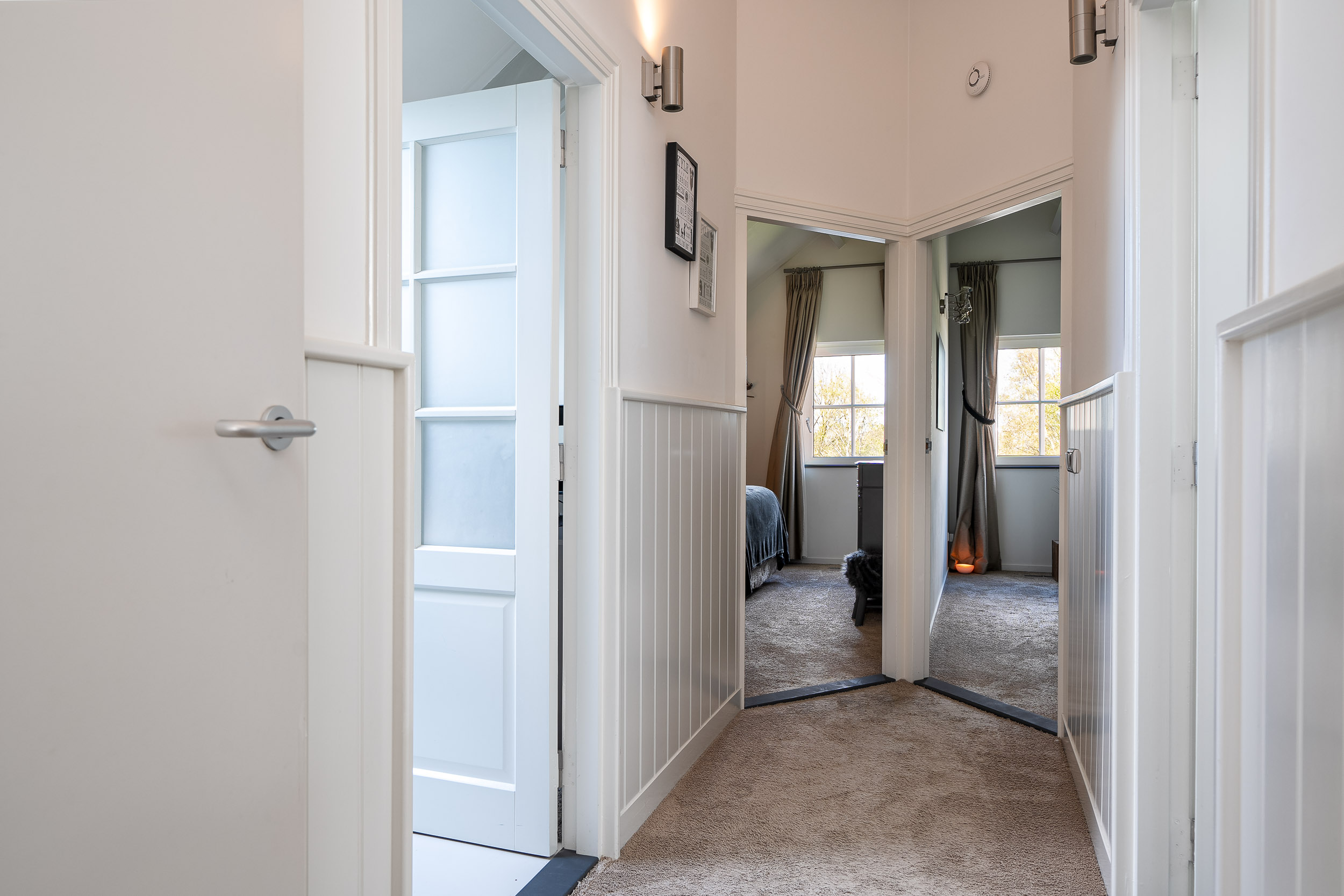 De overloop is afgesloten van de slaapvertrekken en badkamer middels een deur.