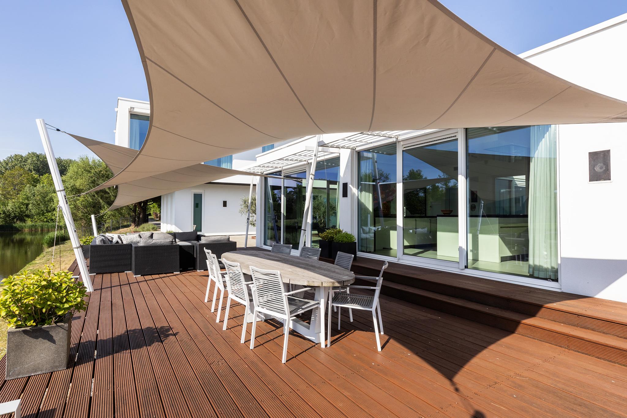 De toegang tot het terrein is afgesloten met een elektrische poort. Rondom de woning zijn meerdere terrassen aangelegd, met op elk moment van de dag zon of schaduw. Oude olijfbomen, hoge pijnbomen en palmen zorgen voor sfeer en karakter. Het perceel is onderhoudsvriendelijk aangelegd met een gazon, borders met druppelirrigatie en een eigen bos met slingerend schelpenpad. Het grote terras, grenzend aan de leef- en woonkeuken, is uitgevoerd in hout en zwevend langs de waterkant geplaatst, wat zorgt voor een magnifiek uitzicht. Luxe zonwering met twee vliegervormige schaduwdoeken, bevestigd aan aluminium steunpalen met stelpunten, zorgen hier voor een aangename overkapping. Een terras waar het op elk moment van de dag heerlijk vertoeven is met een kop koffie of een koel drankje.