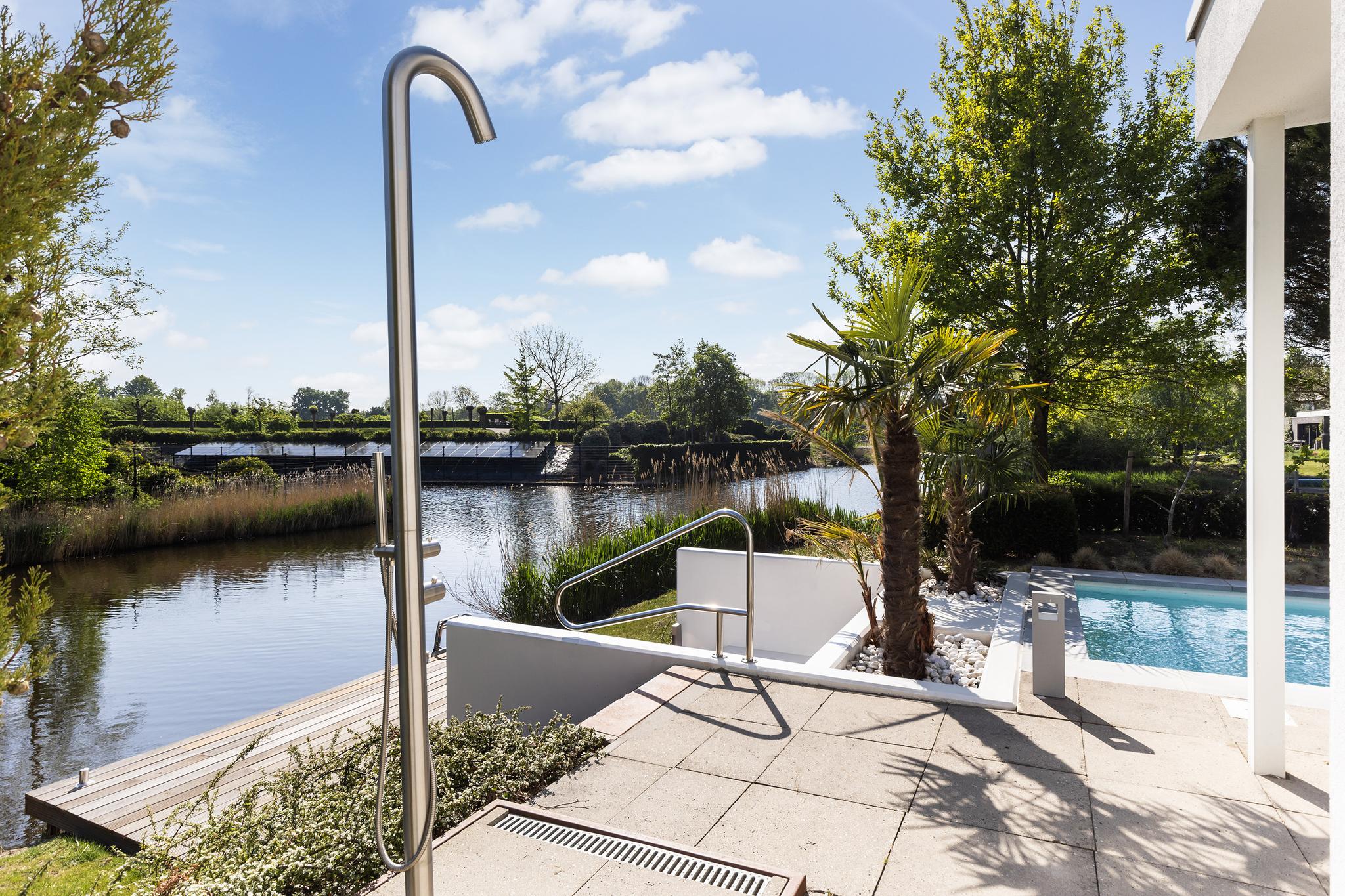De buitenruimte is een volwaardig verlengstuk van het binnenleven: een zorgvuldig aangelegde tuin met volwassen bomen, een verhoogd vlonderterras aan het water, meerdere sfeervolle zitplekken én een in 2021 gerealiseerd, verwarmd zwembad met luxe poolhouse en complete wellness voorzieningen.