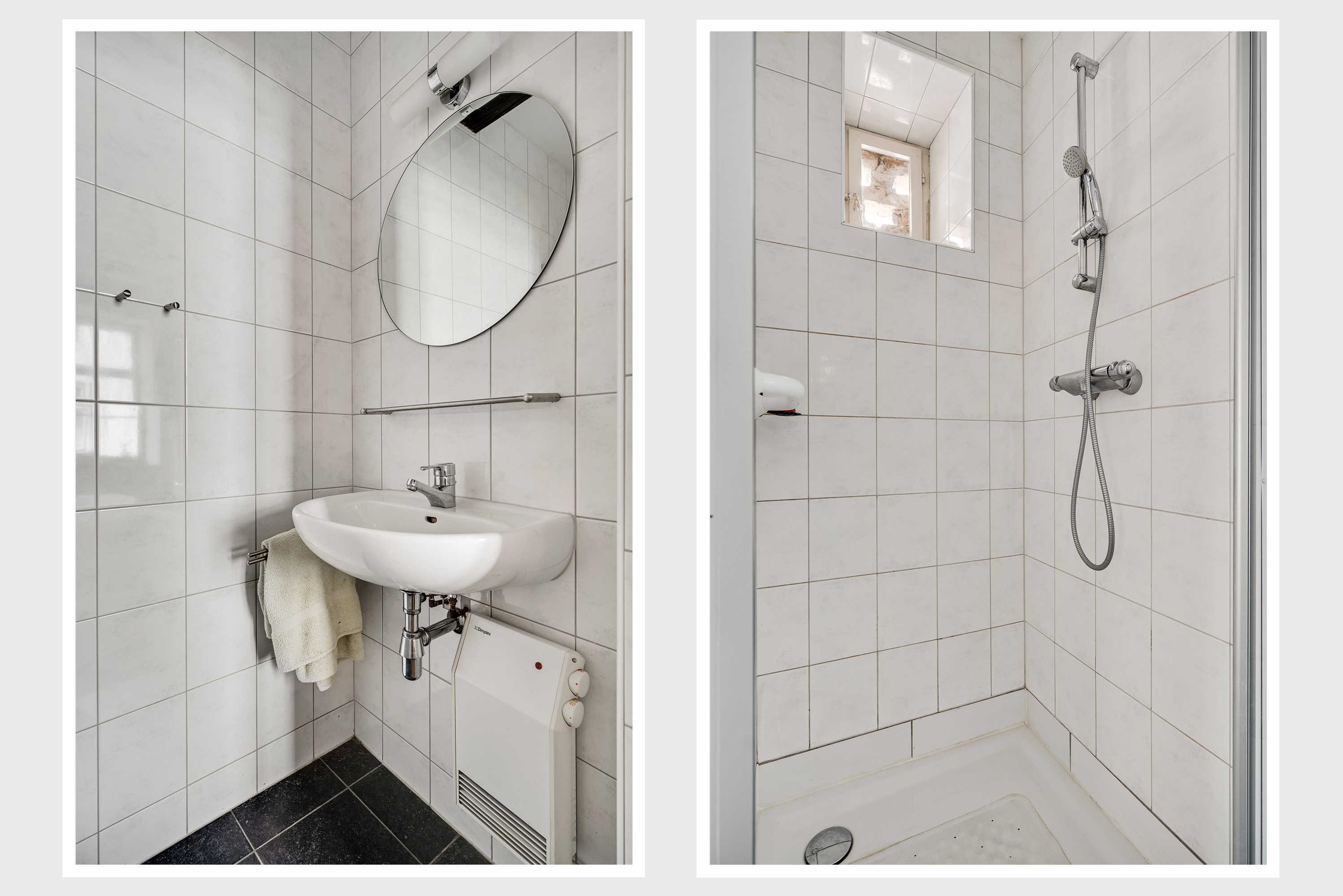 Luxe, vrijwel geheel betegelde badkamer met wastafel, toilet en douchecabine, inclusief wasmachine-aansluiting.