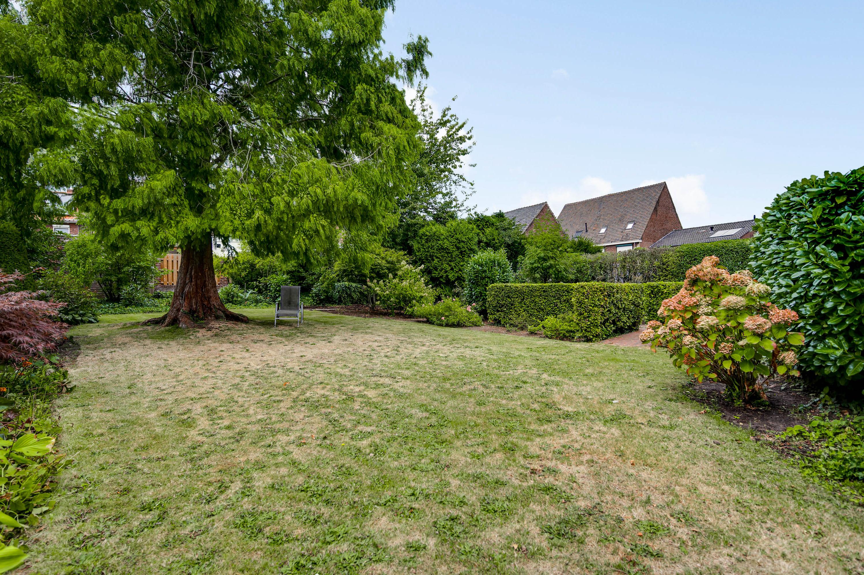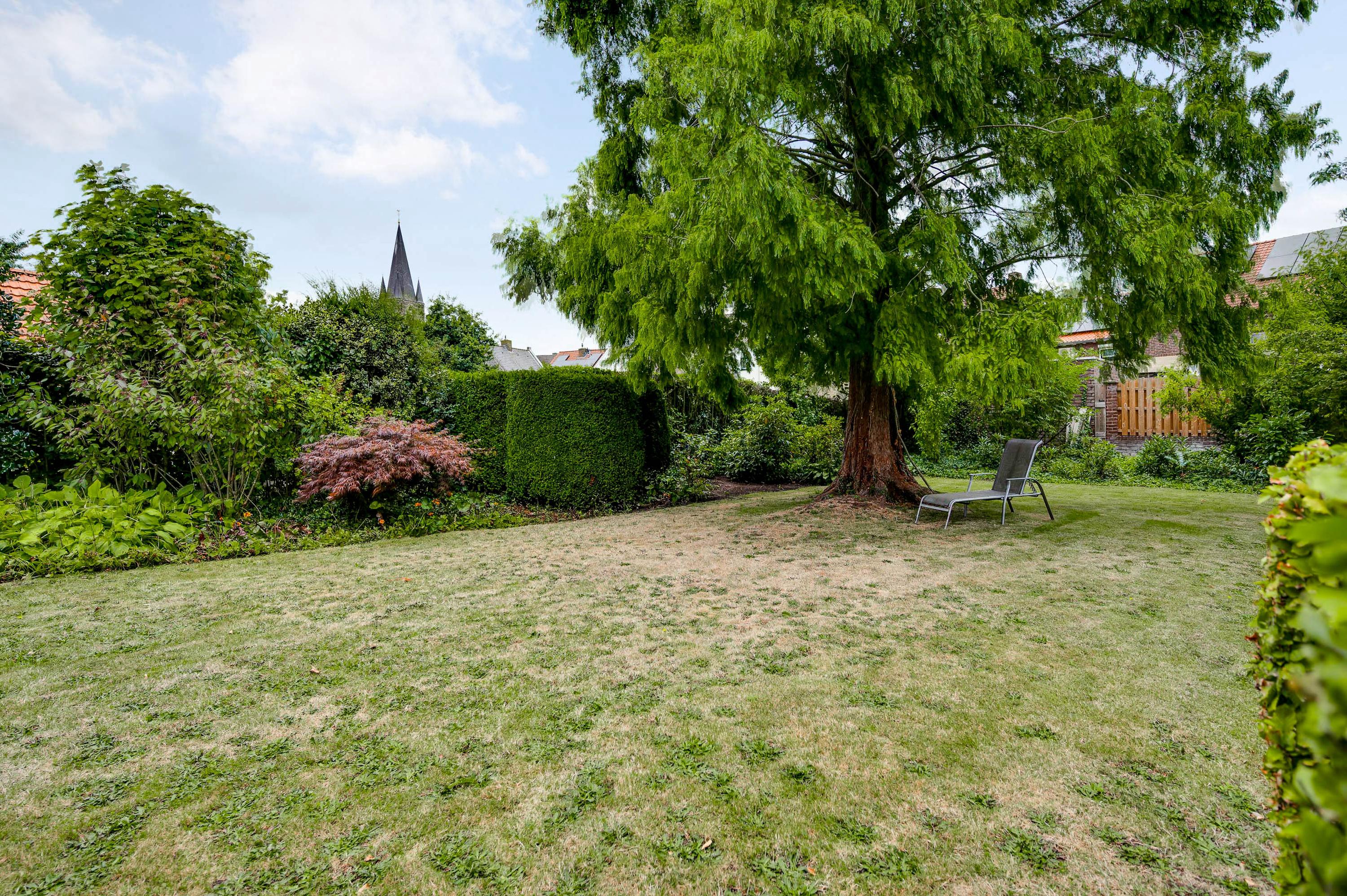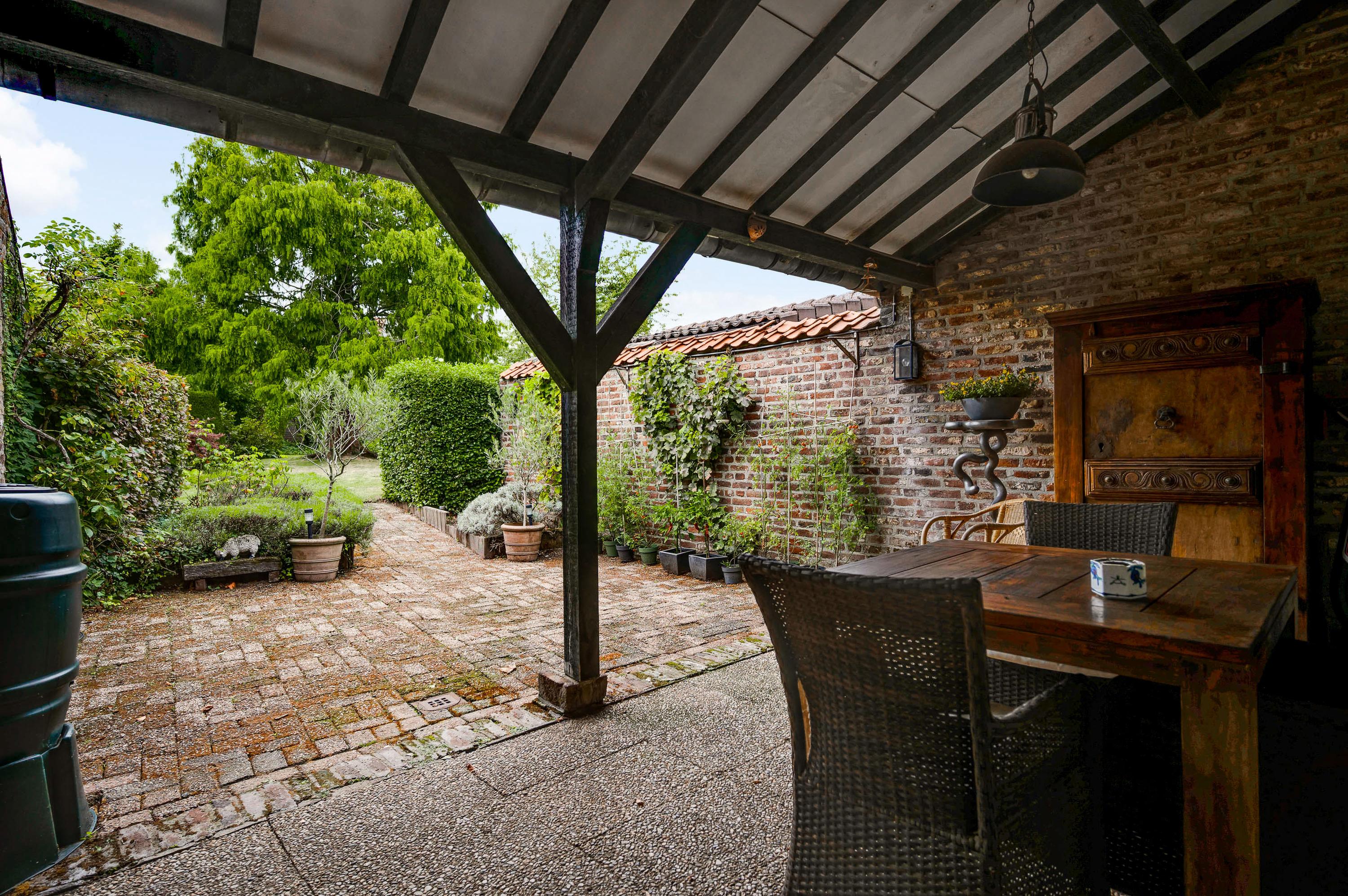 De tuin sluit naadloos aan bij de woning en biedt volop privacy, ondanks de centrale ligging in het historische centrum. De achtertuin is via een eigen achterom bereikbaar en ingericht met meerdere terrasjes – waarvan één overdekt – een gazon en sfeervolle borders.