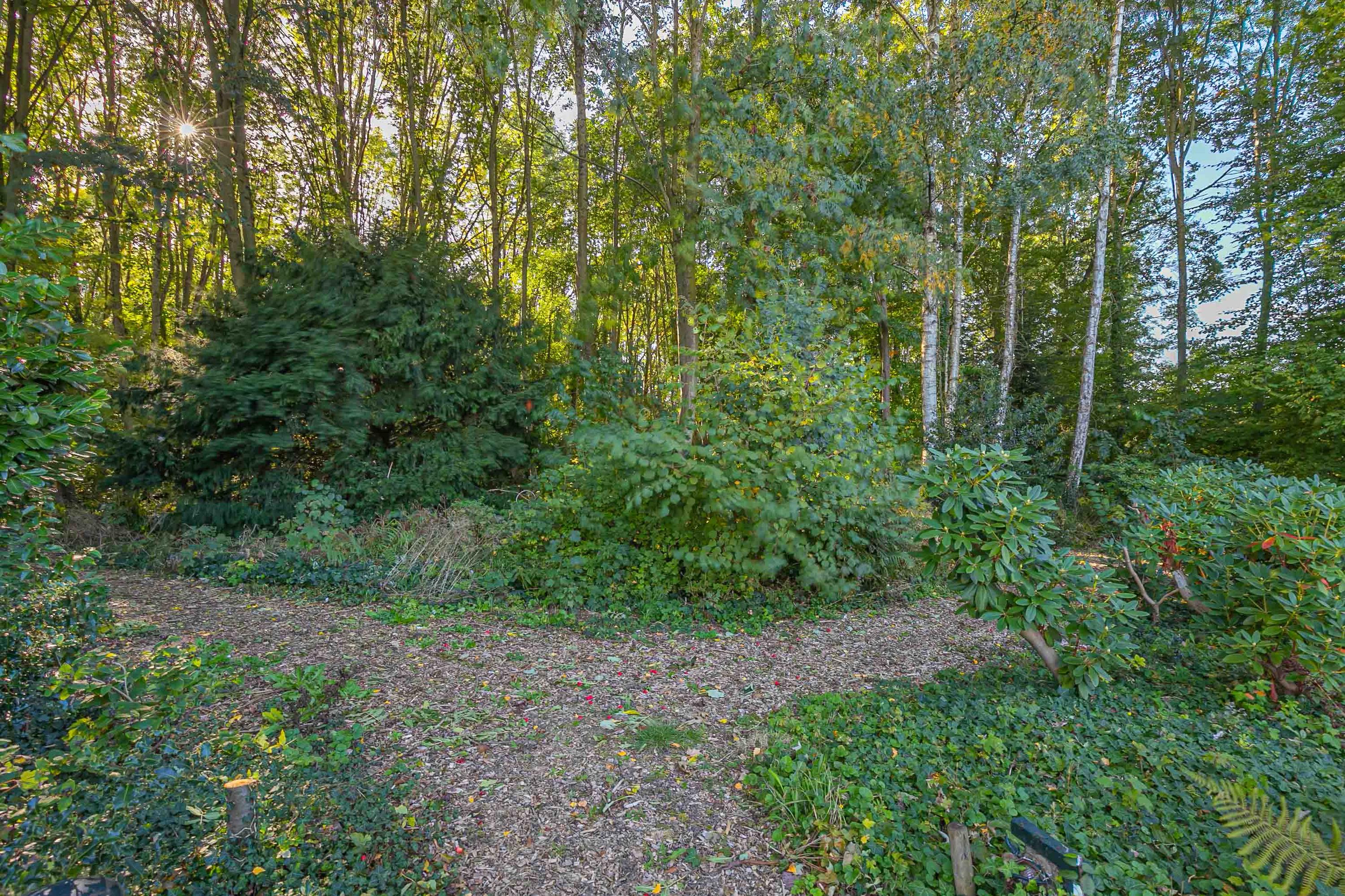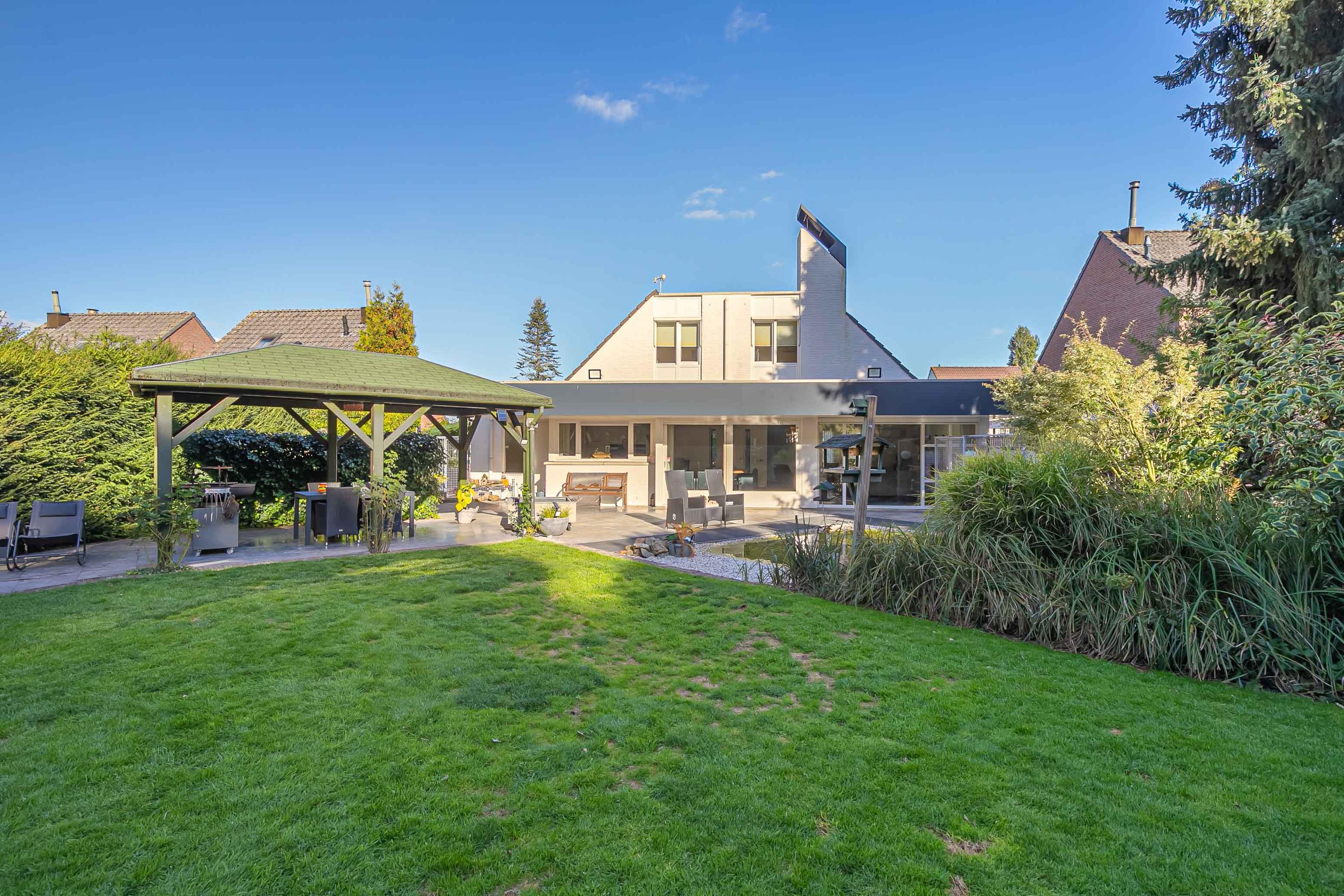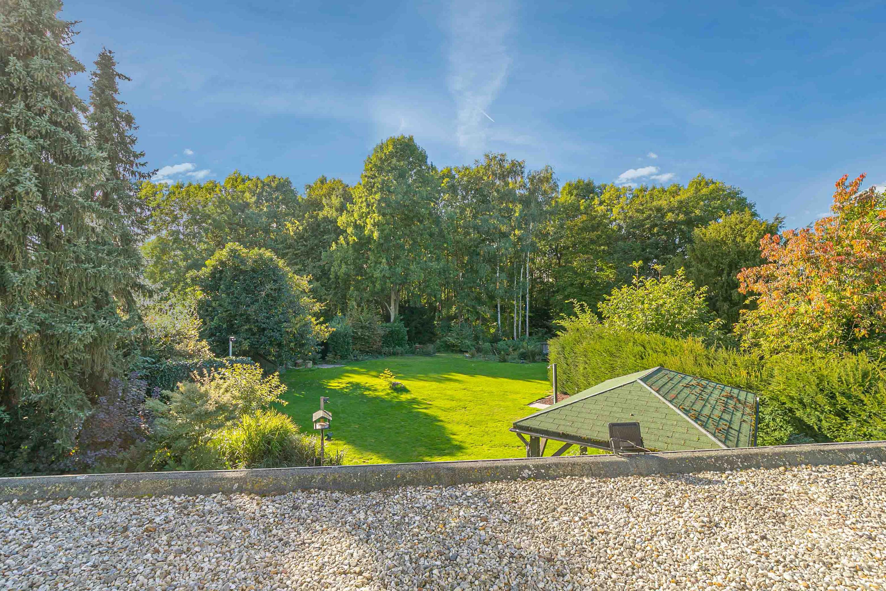 Riante, parkachtige tuin waar men in alle rust kan genieten van optimale privacy. Er zijn diverse zitgedeeltes gecreëerd, waarvan één met overkapping (ca. 14m²). Ook is er een vijver aangelegd in de tuin. Achter de tuin ligt een prachtig bos van ca. 9858m².