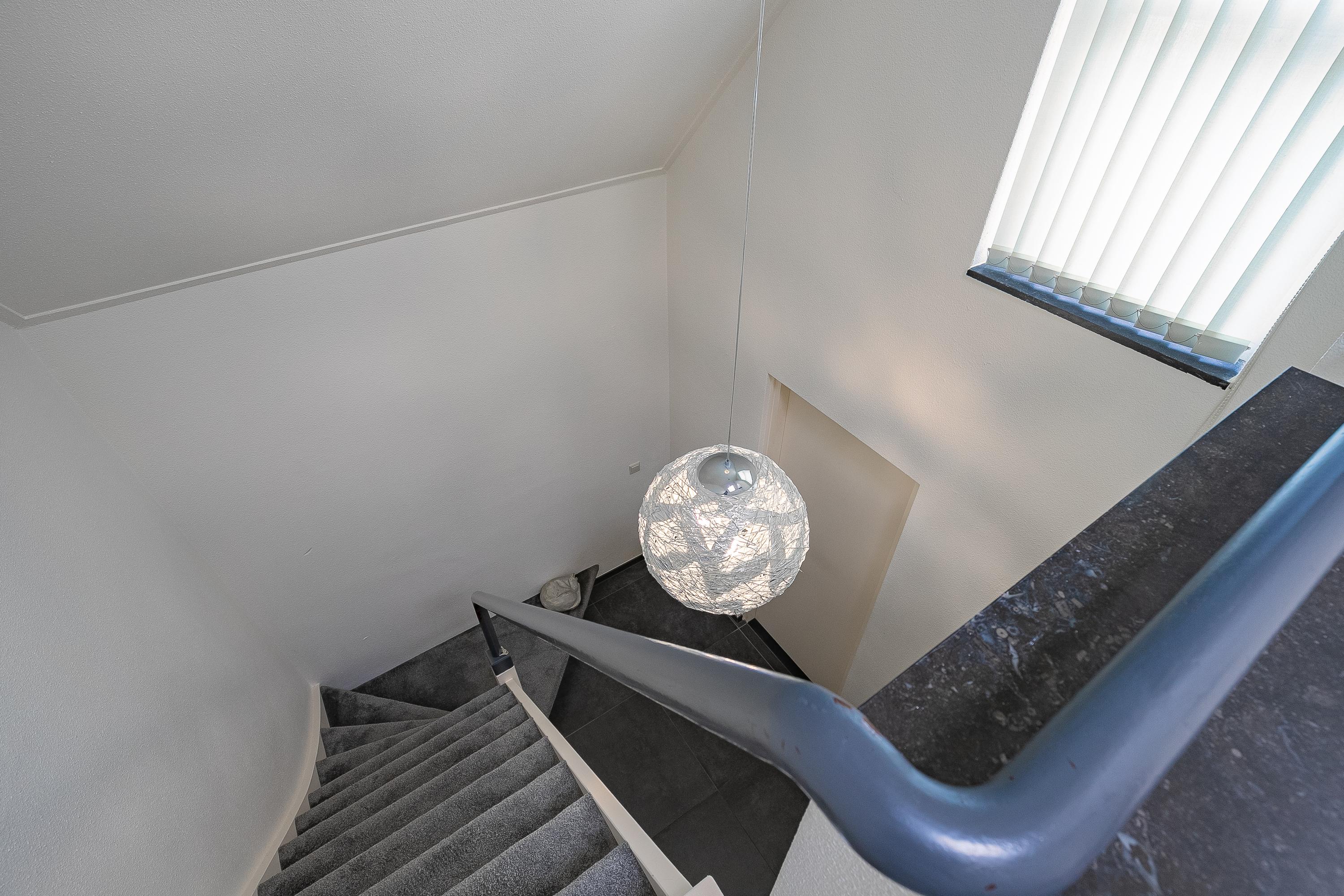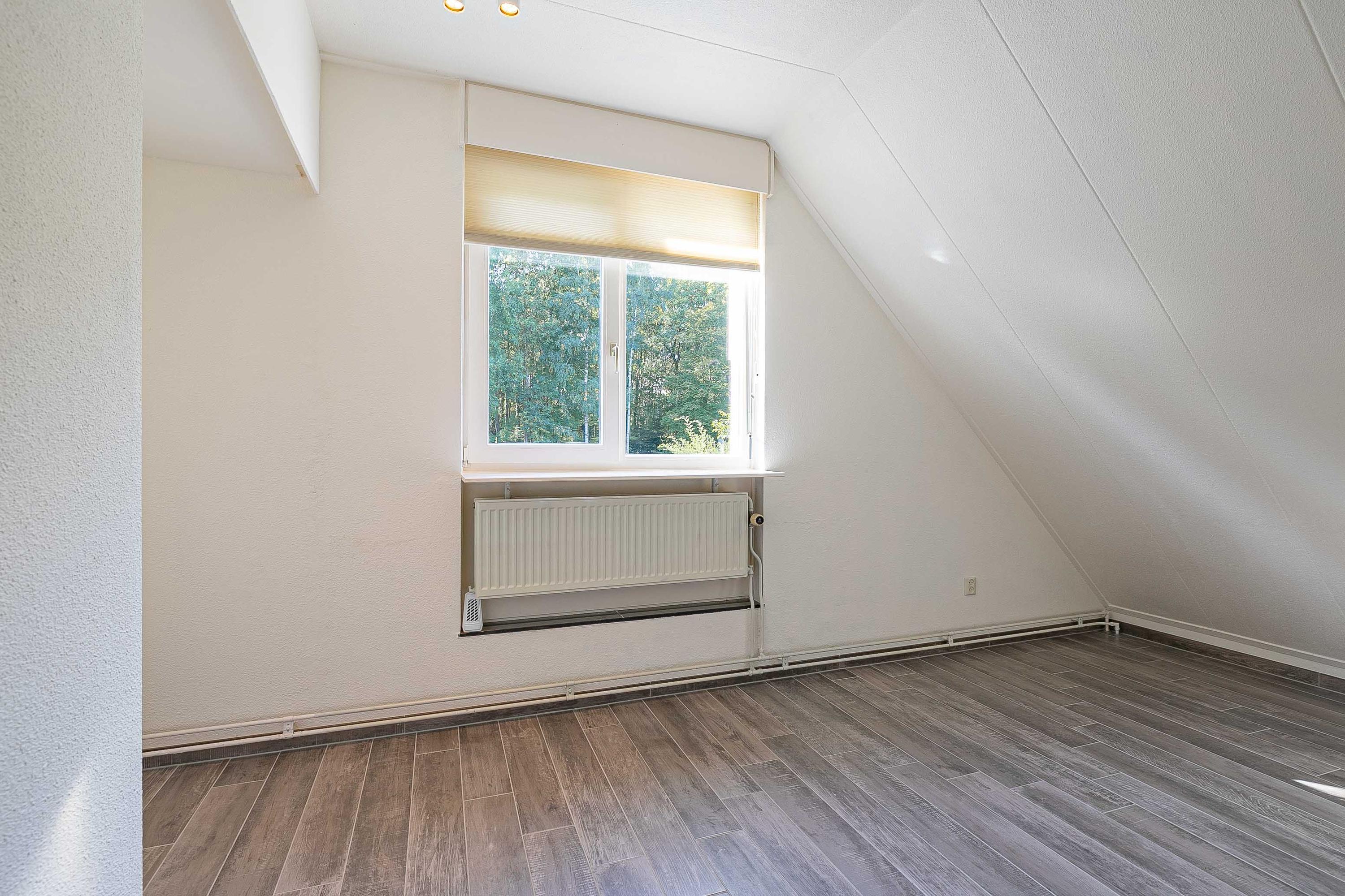 Overloop met lichtkoepel. Drie slaapkamers (ca. 12m², 10m², 9m²), waarvan twéé slaapkamers voorzien van zonneschermen. Badkamer (ca. 4m²) met douche en vaste wastafel. Ook bevindt zich op deze verdieping een separaat toilet. De gehele eerste verdieping is voorzien van houten kozijnen, dubbel glas en een keramische vloer. De eerste verdieping heeft een hoogte van 2,45m met uitzondering van de oppervlaktes onder het dakschuin.