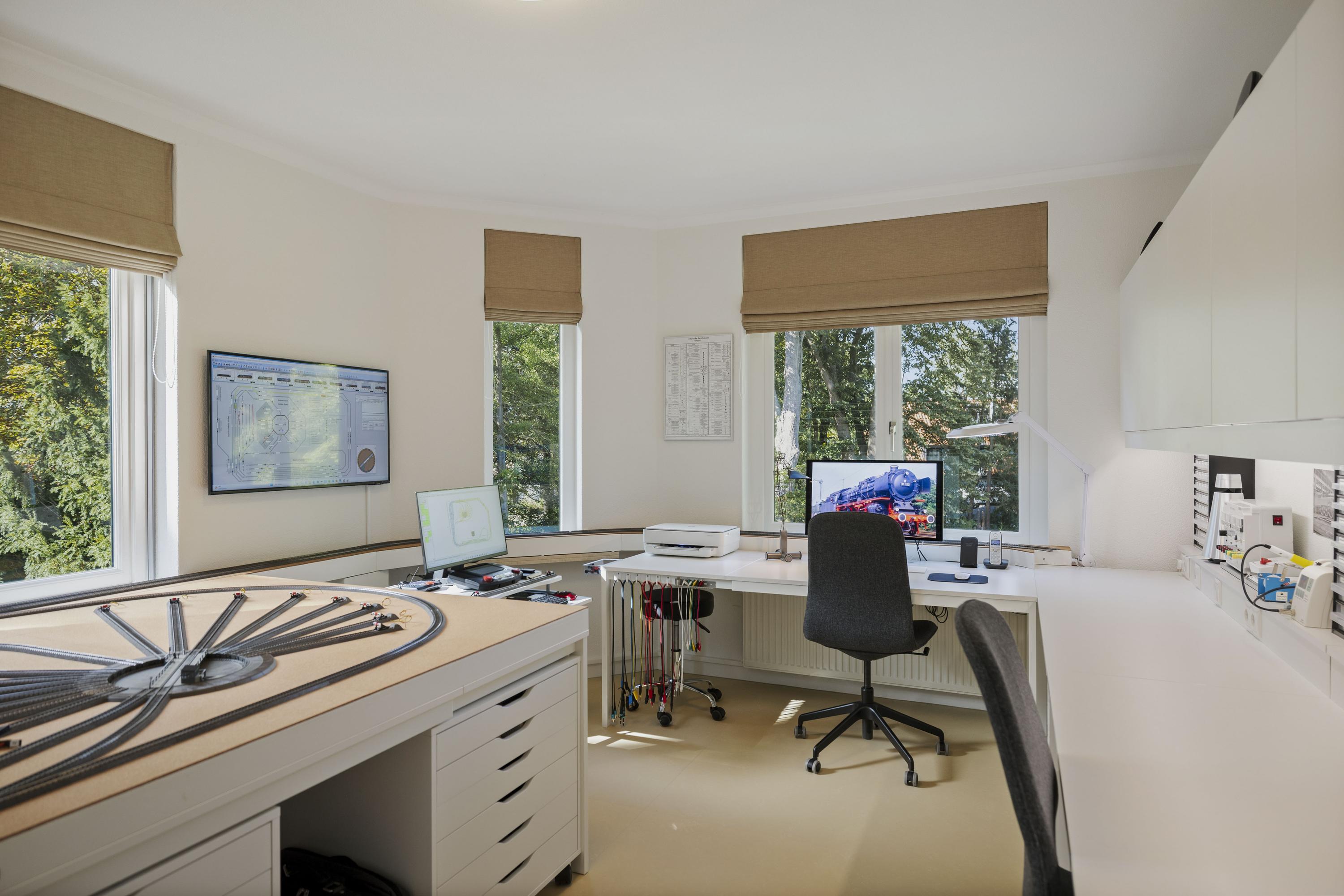 De riante woonkamer, met in het verlengde een ruime studeerkamer en-suite, biedt een prachtig uitzicht op het park en heeft openslaande deuren naar alle balkons.