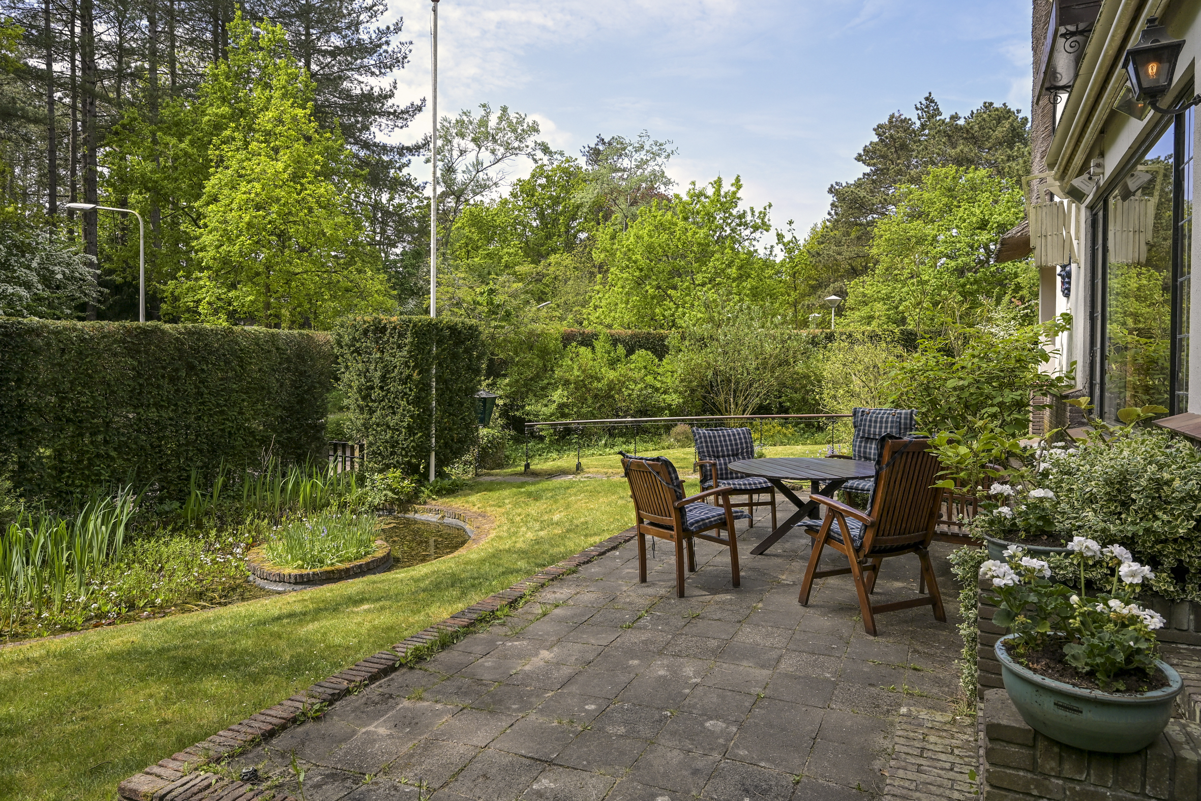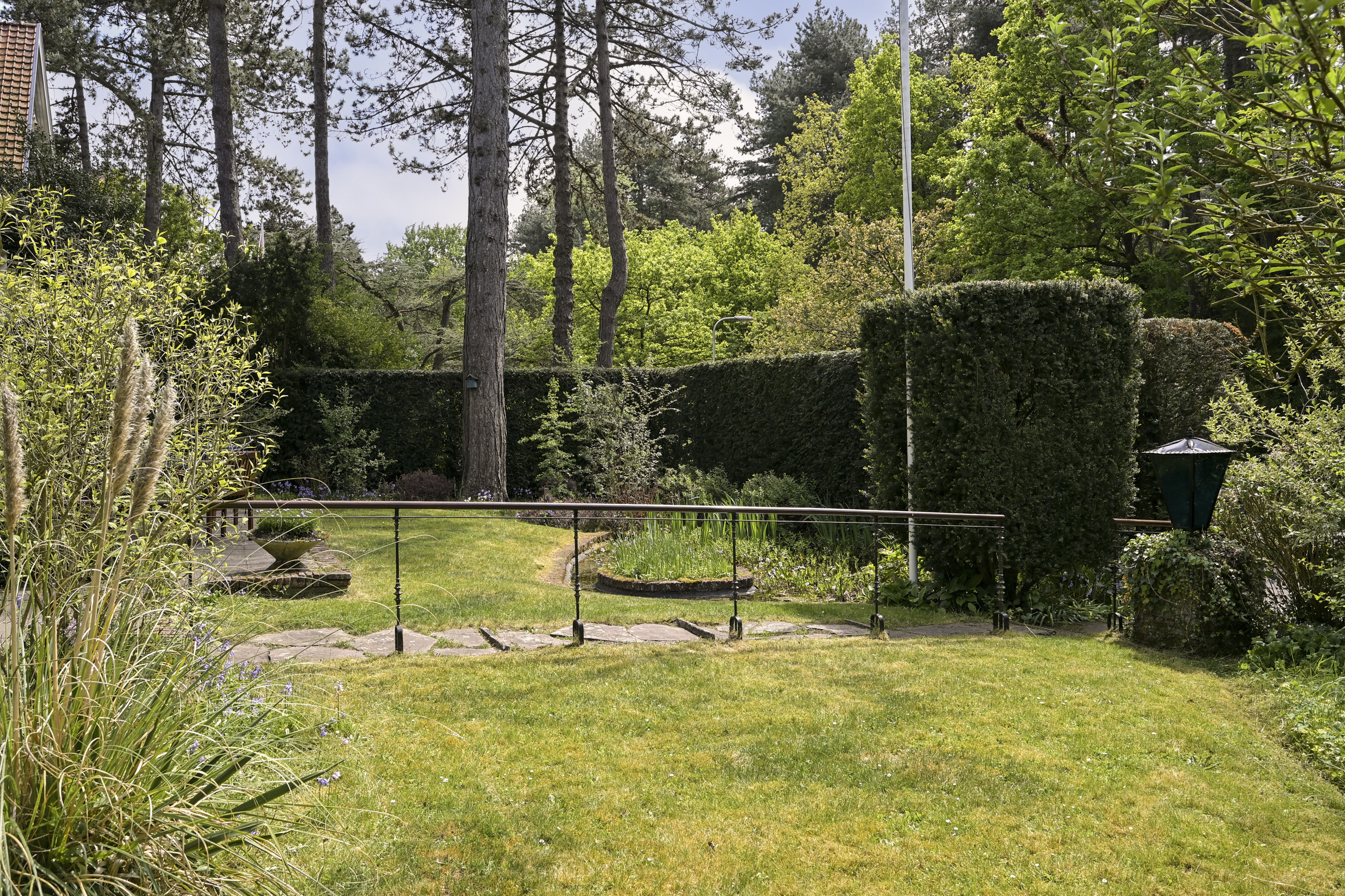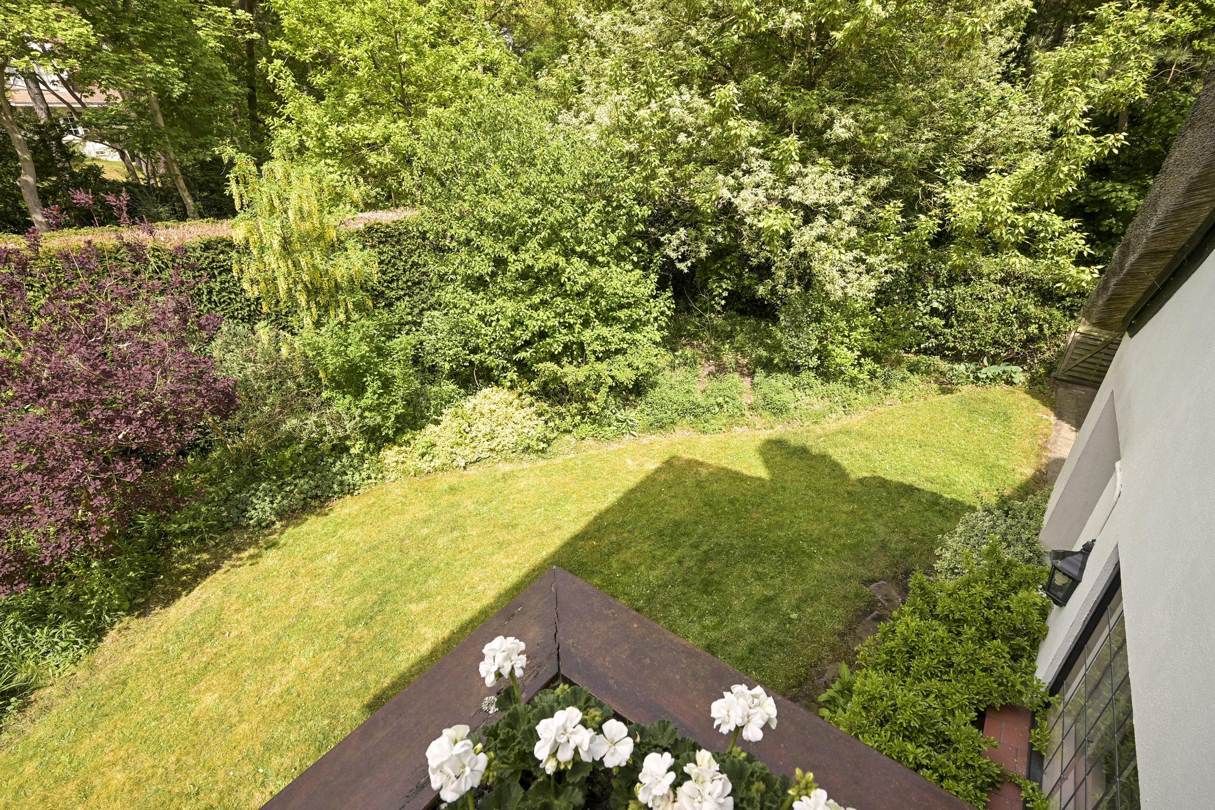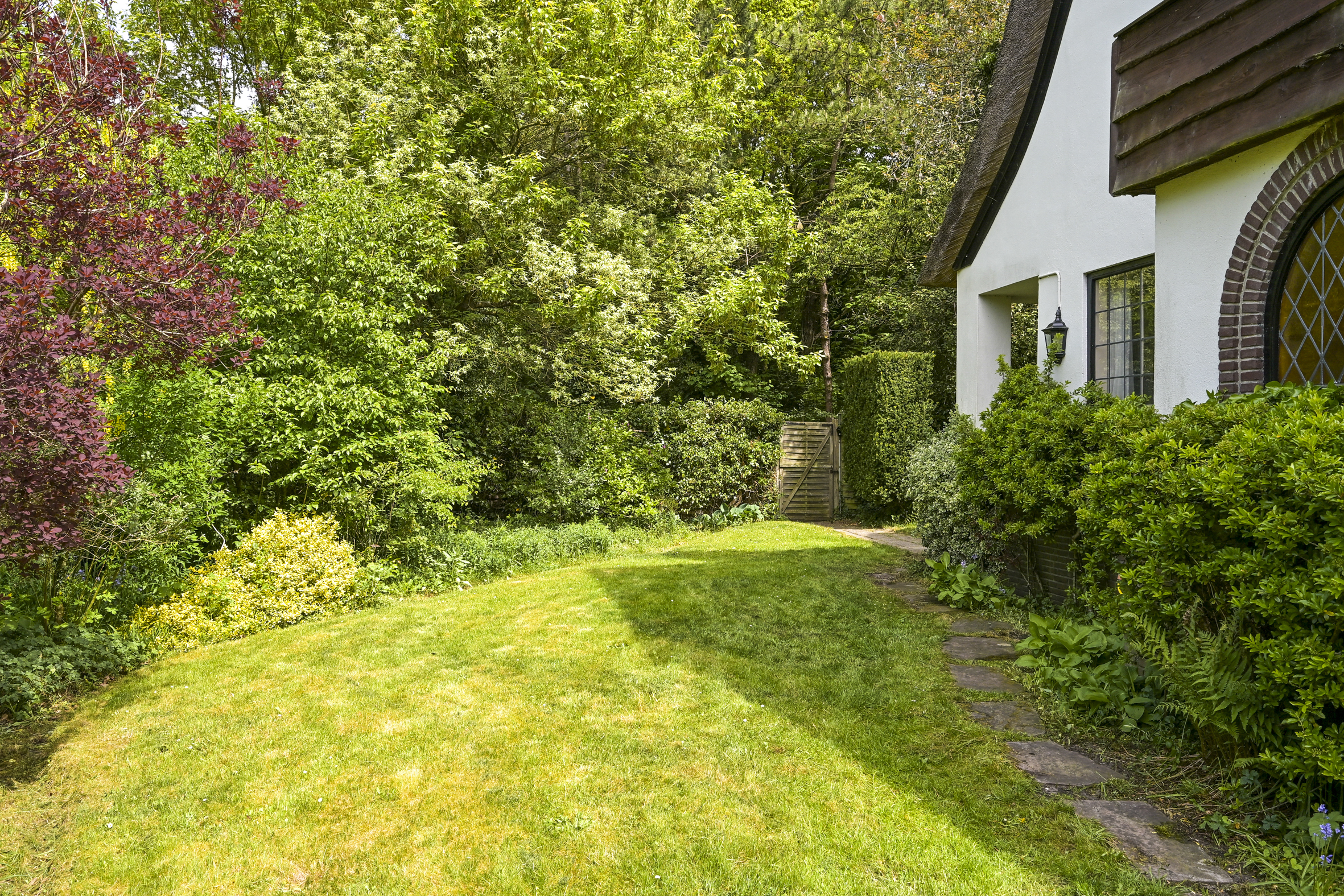 De tuin ligt half rondom de woning en is vrij gelegen en dus heel zonnig. Naast de oorspronkelijke garage die ooit verbonden was met de eetkamer en dus eenvoudig bij het huis zou kunnen worden getrokken is een nieuwere grote garage op het perceel aangebouwd die voor vele doeleinden geschikt is. Deze laatste heeft een automatische kanteldeur en heeft een doorloop naar de achtertuin.