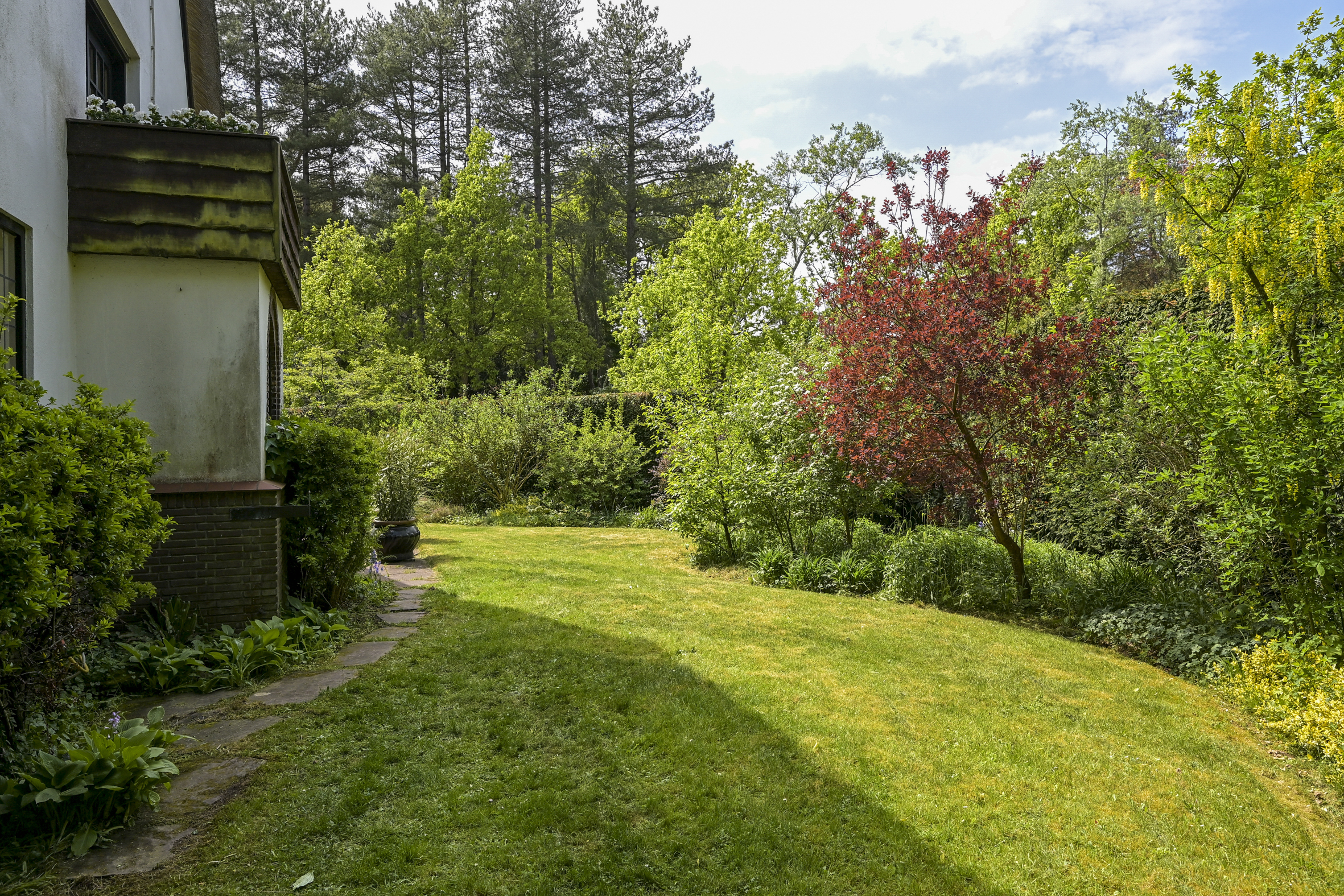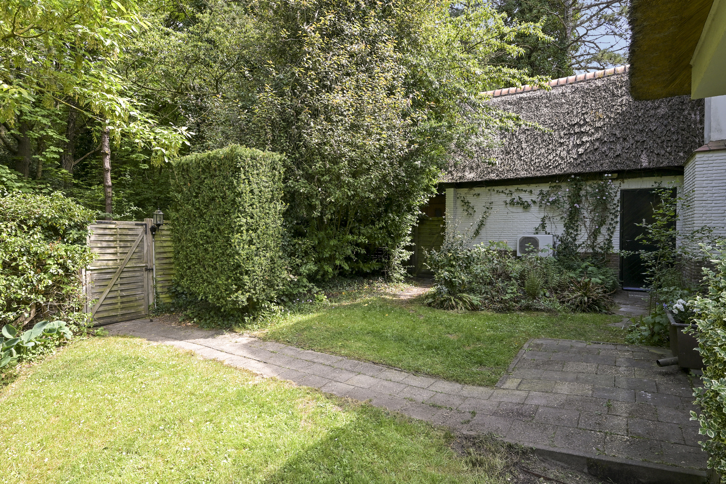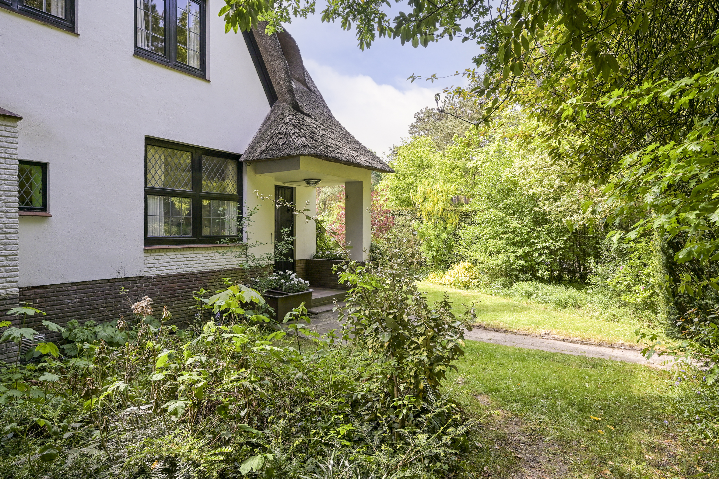 De tuin ligt half rondom de woning en is vrij gelegen en dus heel zonnig. Naast de oorspronkelijke garage die ooit verbonden was met de eetkamer en dus eenvoudig bij het huis zou kunnen worden getrokken is een nieuwere grote garage op het perceel aangebouwd die voor vele doeleinden geschikt is. Deze laatste heeft een automatische kanteldeur en heeft een doorloop naar de achtertuin.