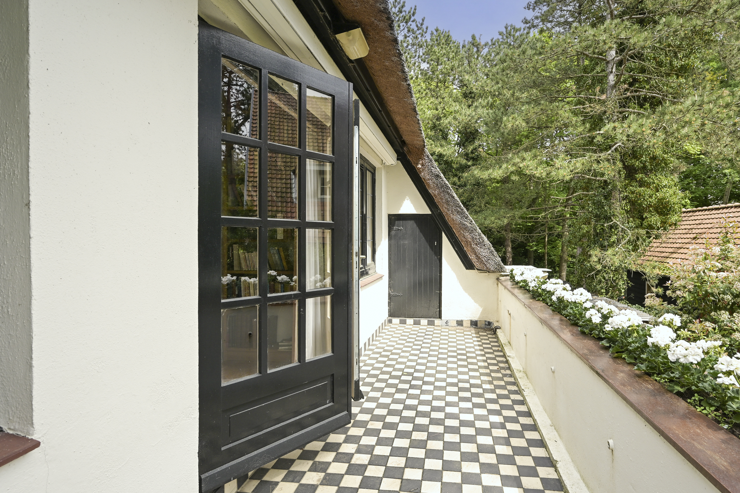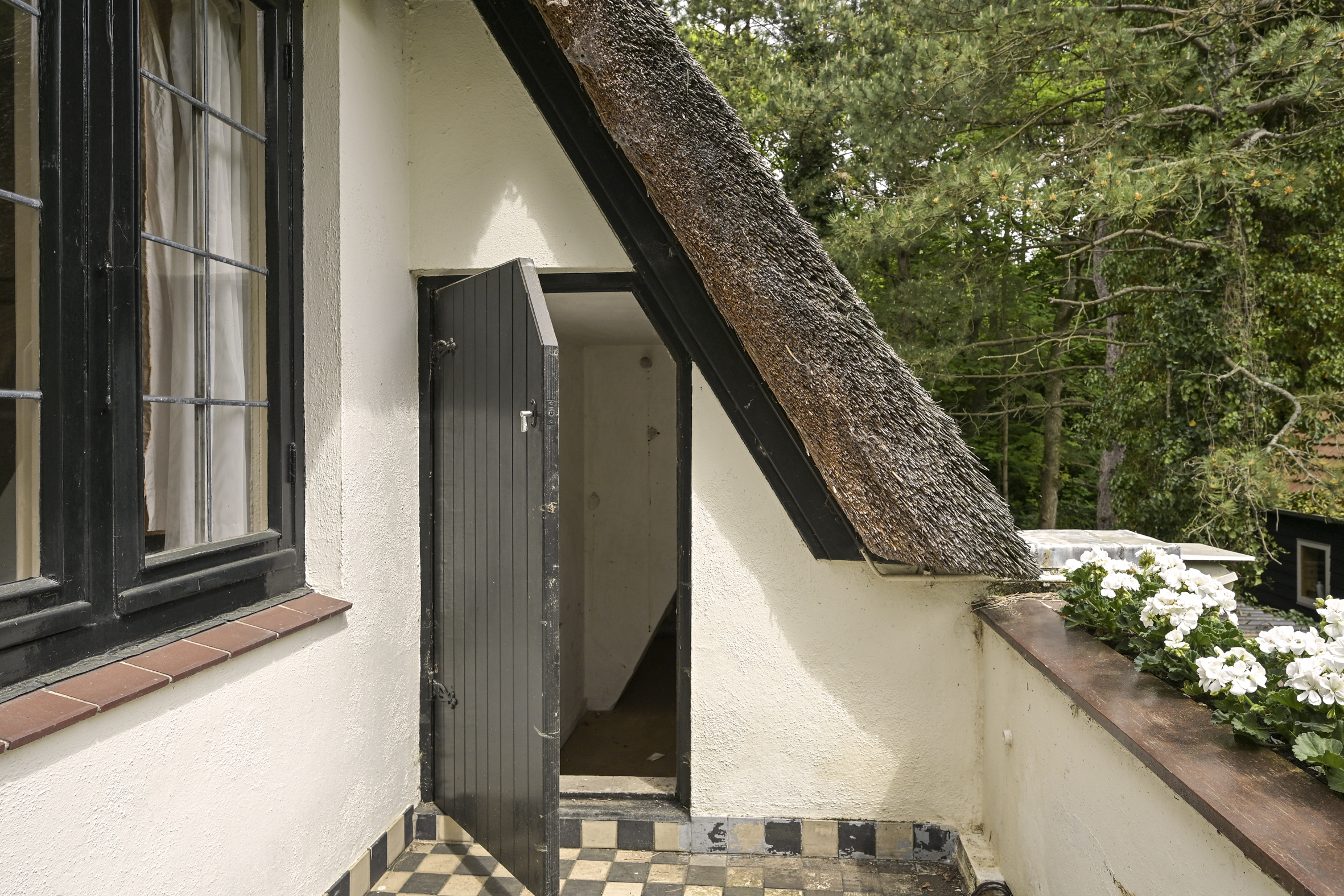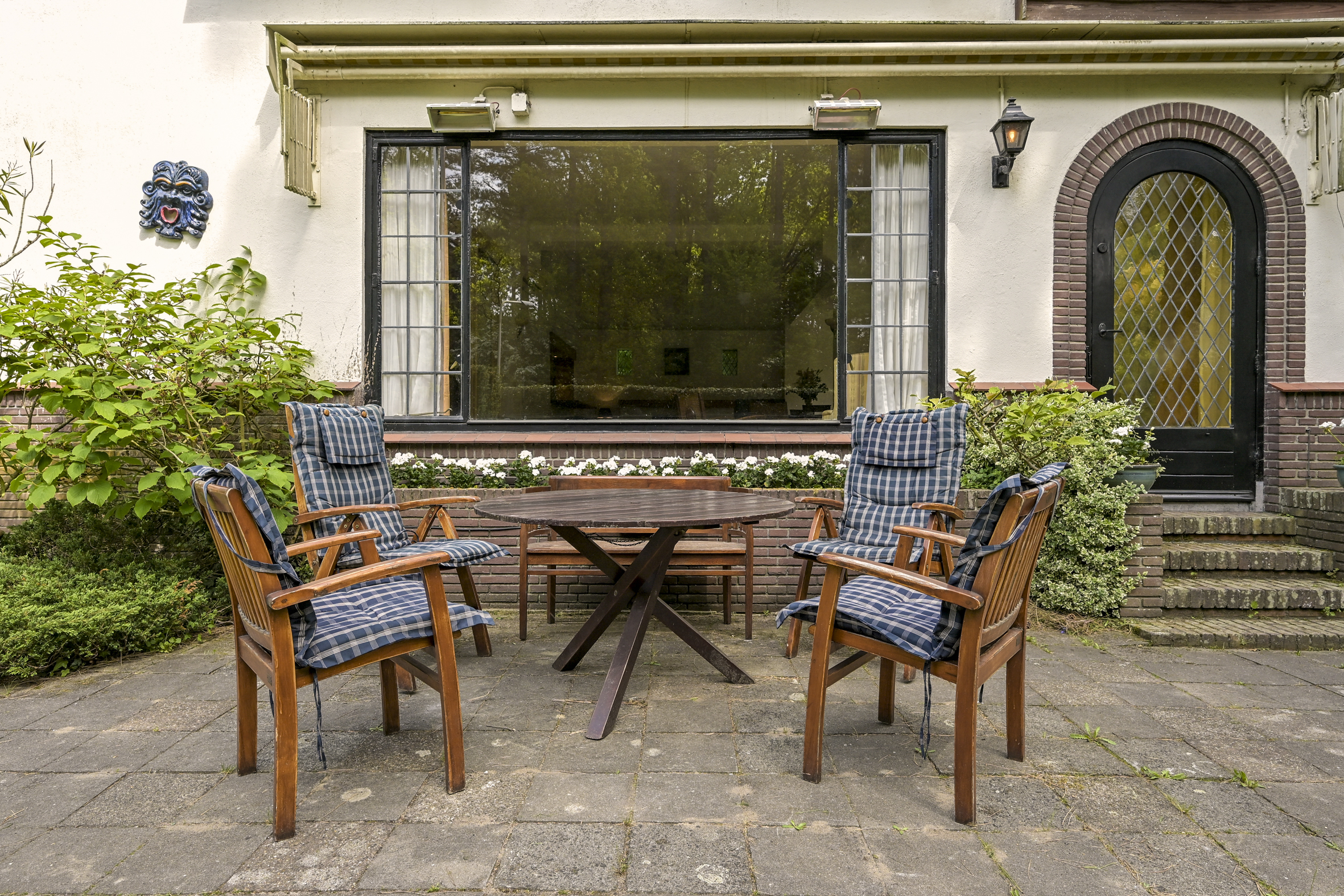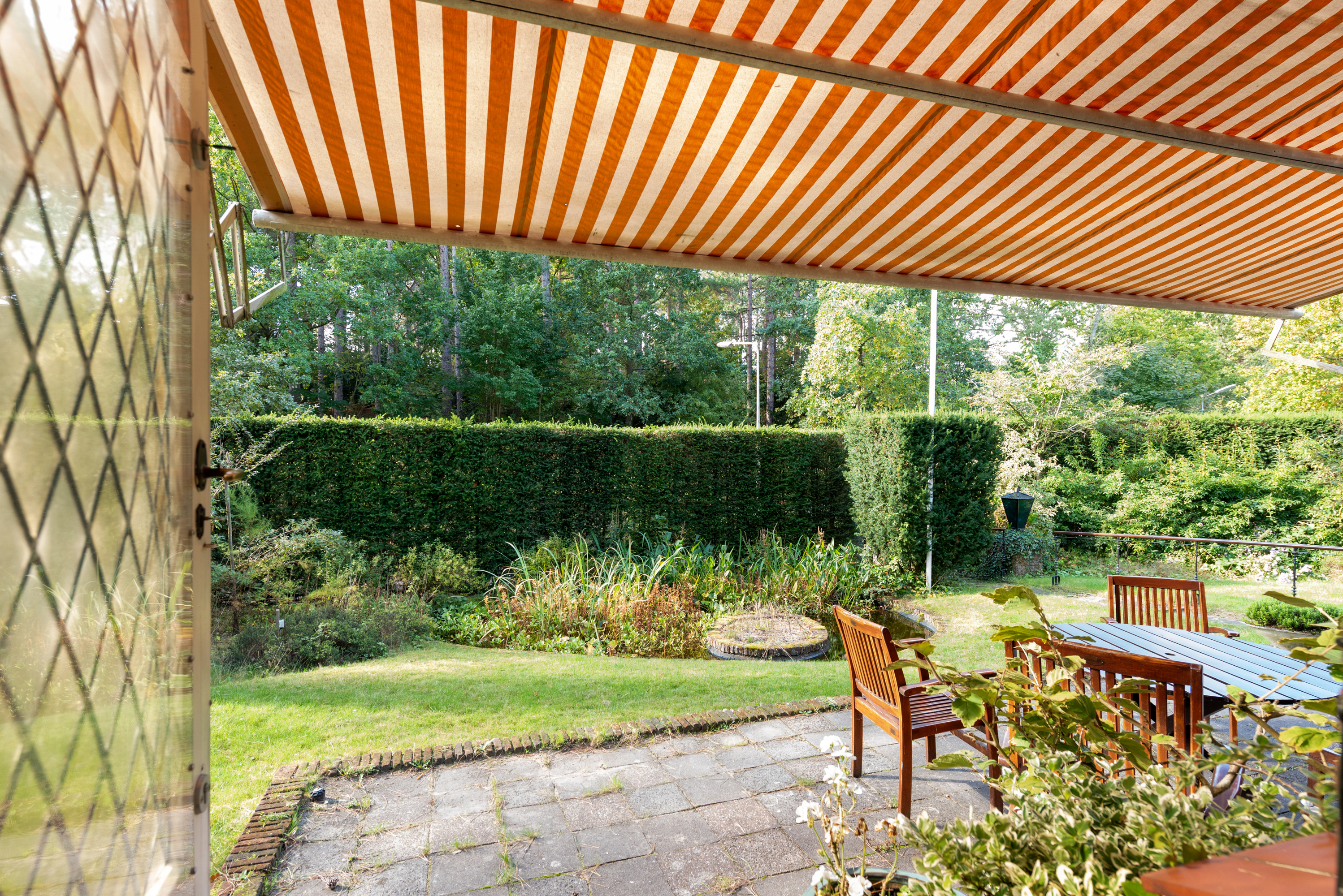 De tuin ligt half rondom de woning en is vrij gelegen en dus heel zonnig. Naast de oorspronkelijke garage die ooit verbonden was met de eetkamer en dus eenvoudig bij het huis zou kunnen worden getrokken is een nieuwere grote garage op het perceel aangebouwd die voor vele doeleinden geschikt is. Deze laatste heeft een automatische kanteldeur en heeft een doorloop naar de achtertuin.