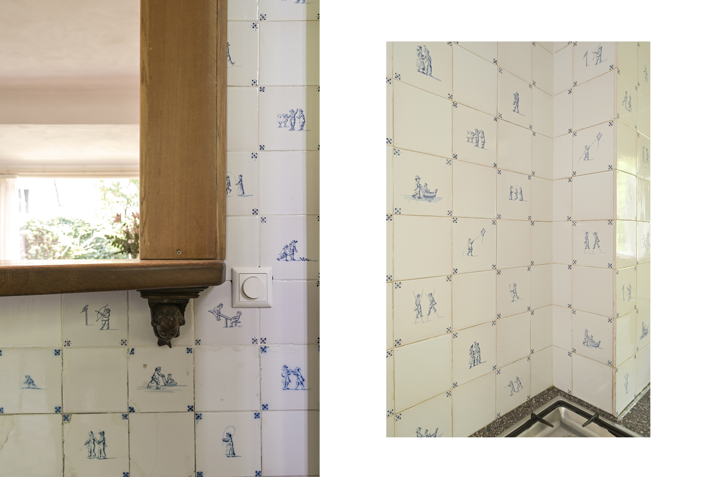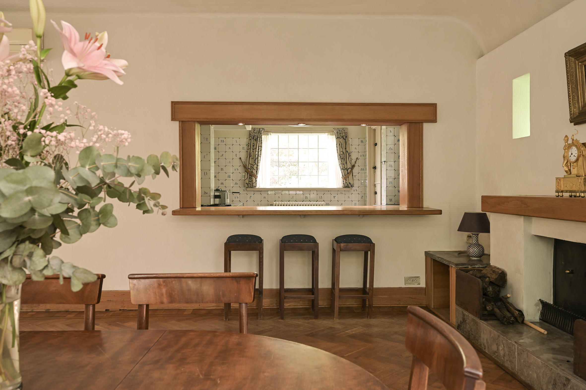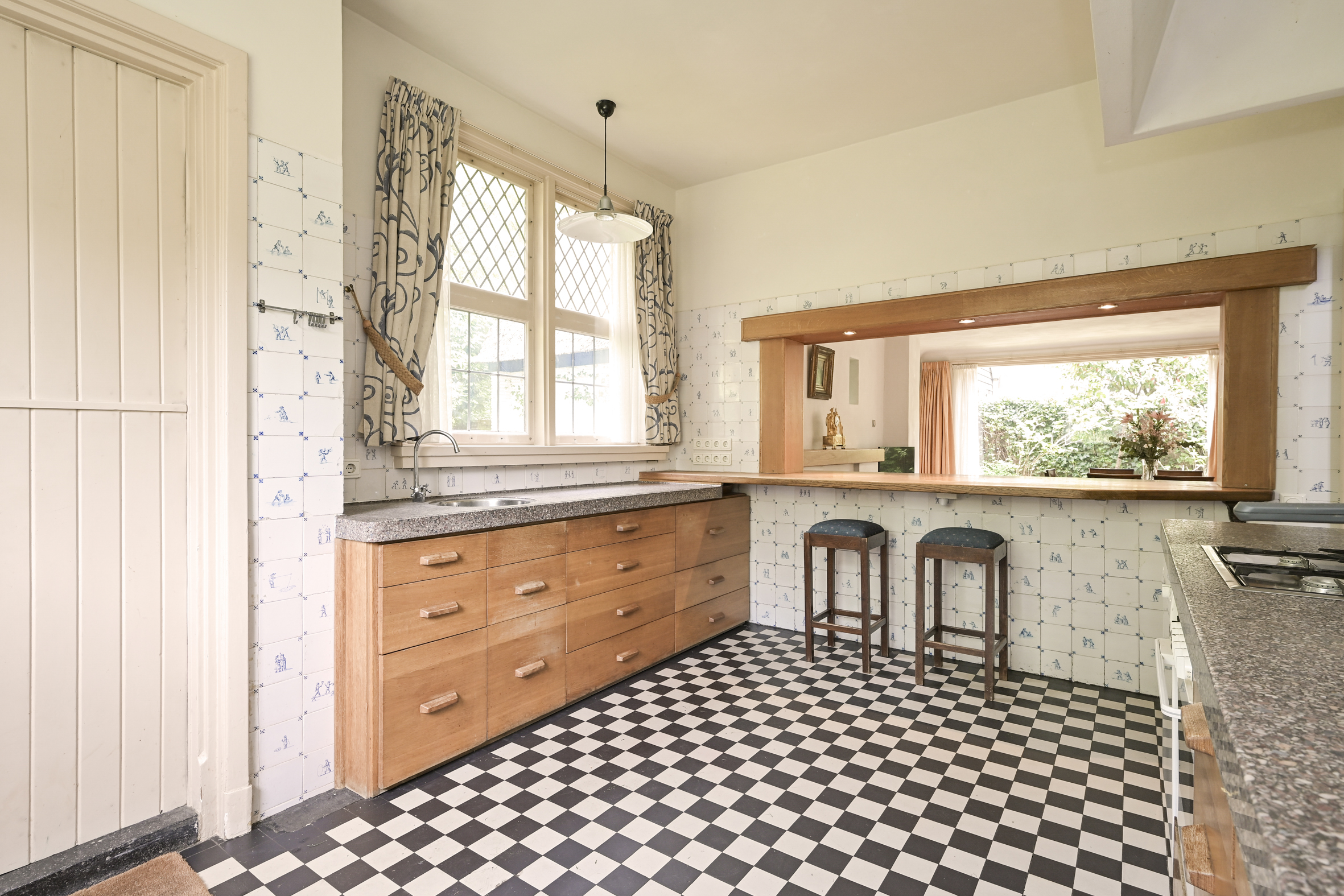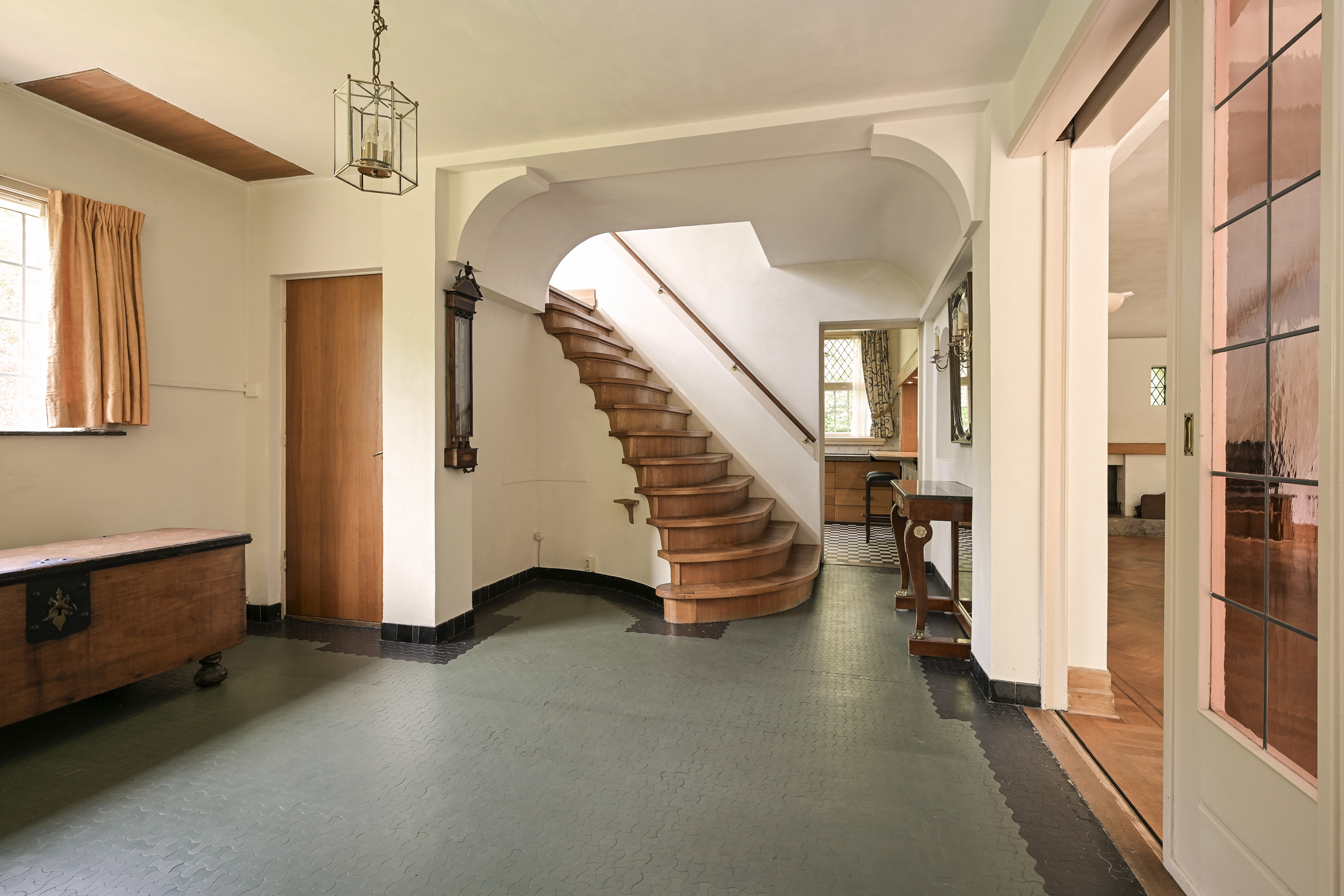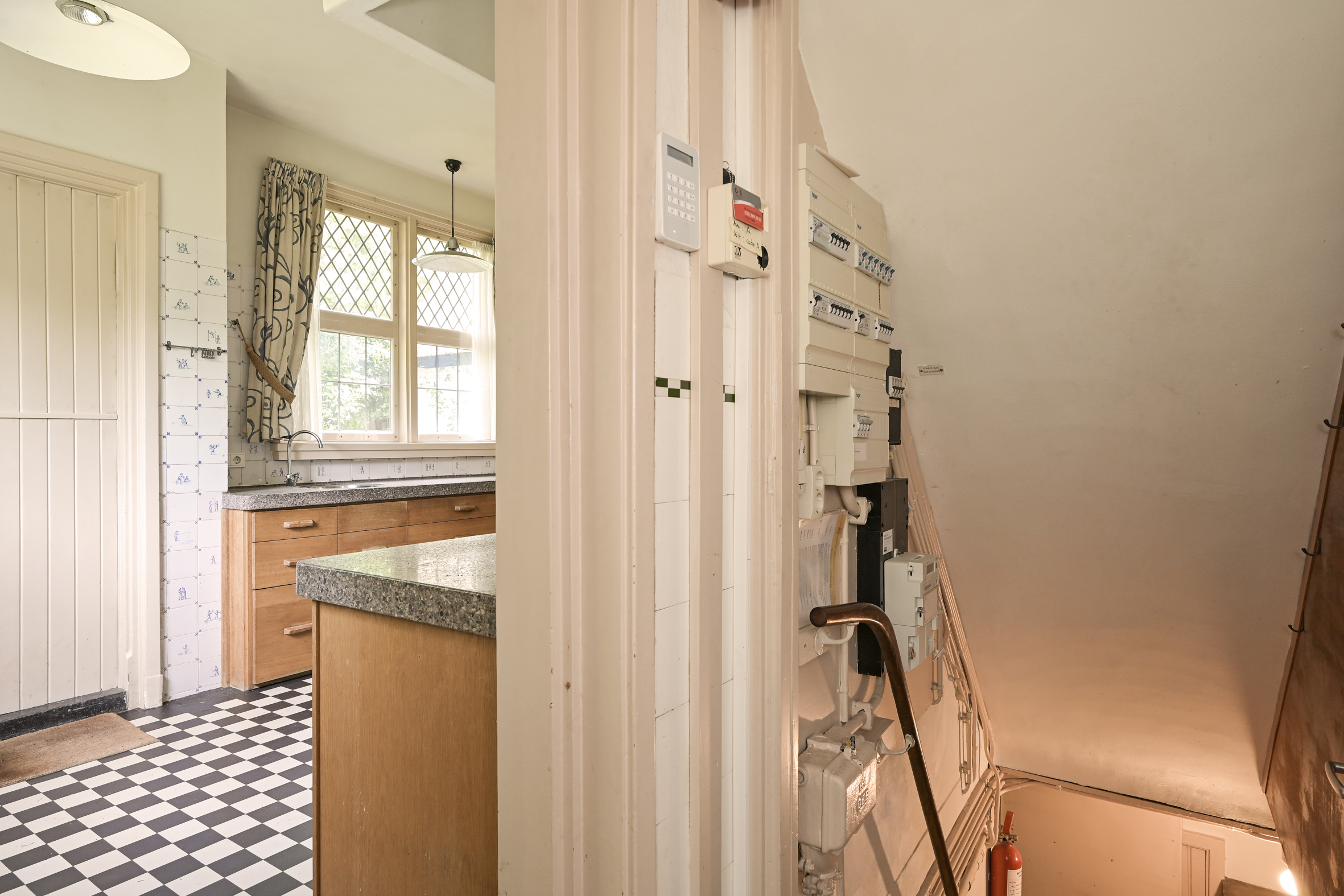 Indeling: entree, royale ontvangsthal met fraaie in mozaïek gelegde vloer, riant trappenhuis, eenvoudige wc met fonteintje. Dubbele schuifdeuren met glas in lood ramen naar ruime lichte zit/eetkamer met eiken parketvloeren, open haard, marmeren vensterbanken en toegang tot de zonnige tuin. Vanuit de centrale hal is de ruime nette keuken bereikbaar die middels een halfopen verbinding in contact met eetkamer staat. De keuken heeft een achter entree en heeft een aangrenzende bijkeuken met toegang tot de kelder die uit drie praktische ruimtes bestaat.