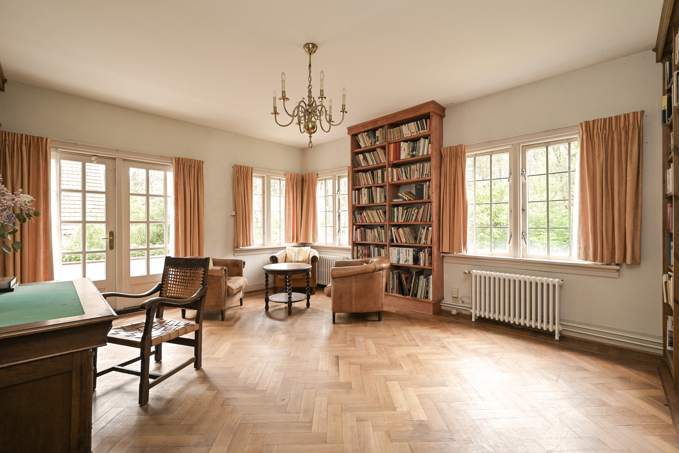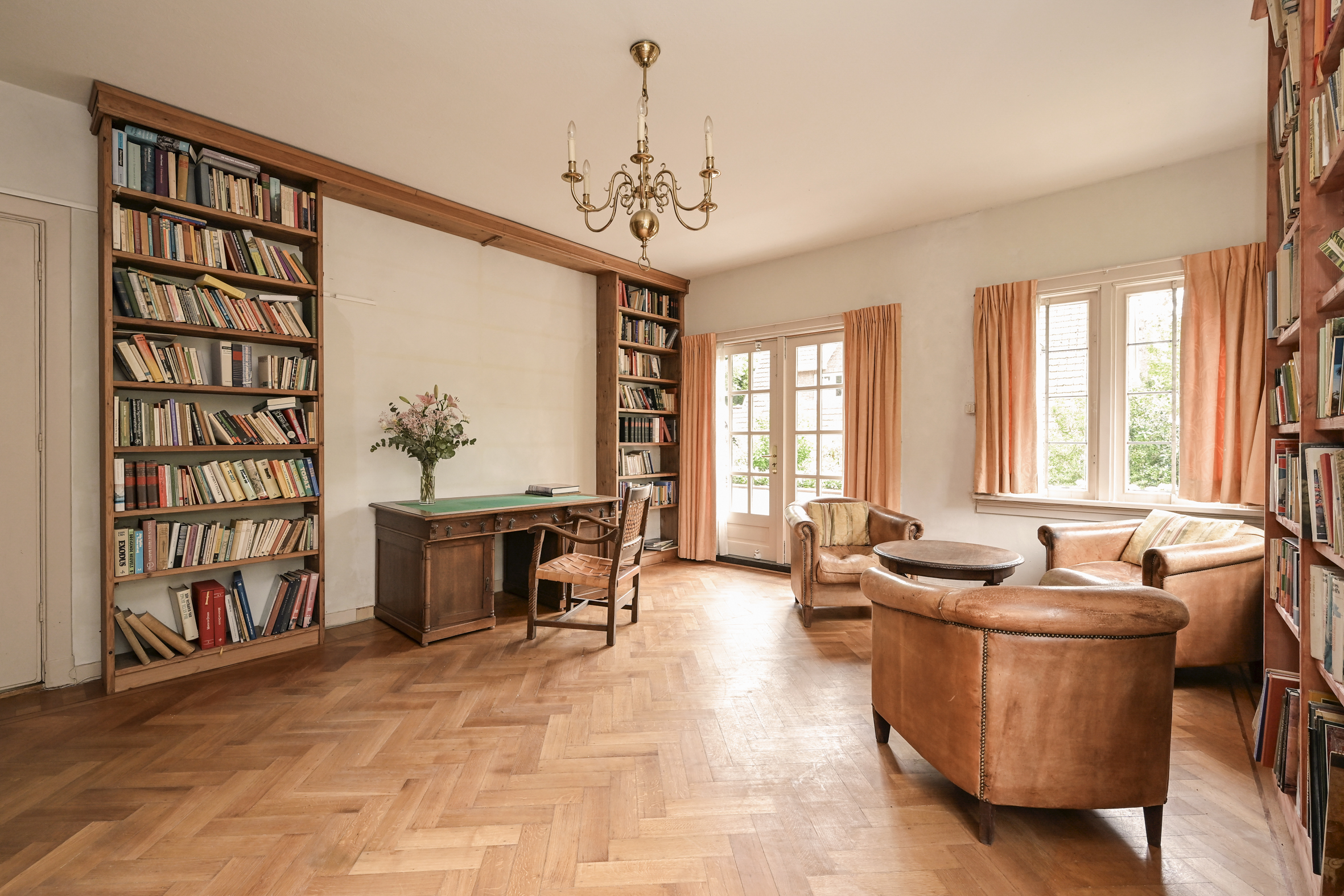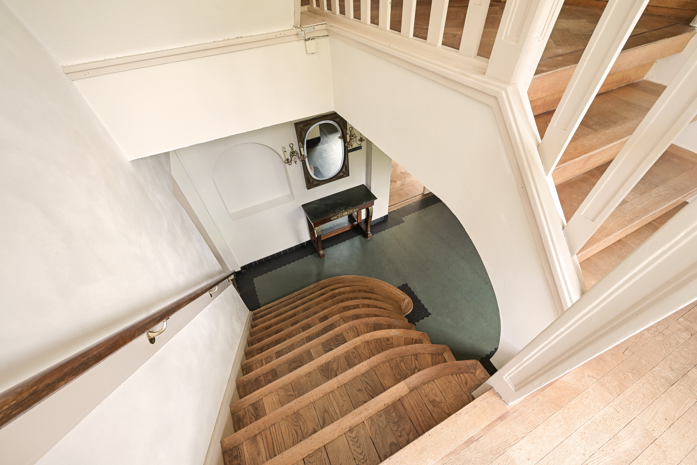 Het fraaie lichte bordestrappenhuis met halverwege toegang tot een balkon leidt naar de 1e verdieping waar we naast een eenvoudige badkamer en een aparte douche een fraaie studeerkamer met toegang tot ruim balkon vinden en twee ruime slaapkamers. Zoals benoemd zijn alle vertrekken voorzien van eiken parketvloeren.
