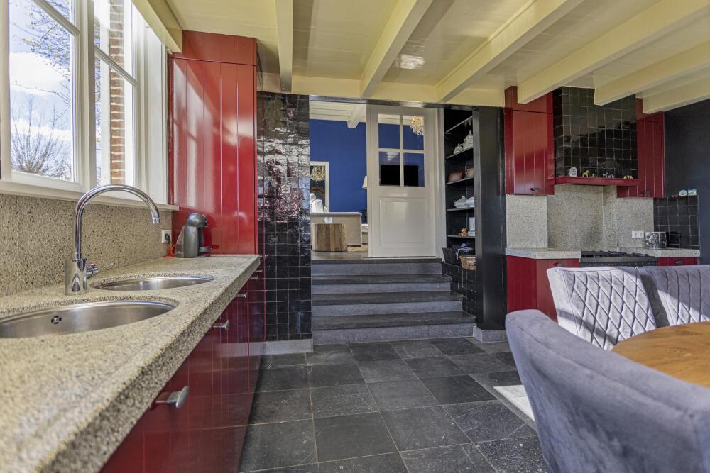 Begane grond: Via de zijkant betreedt u de hal welke toegang biedt naar de woonkeuken, het toilet, de badkamer voorzien van douche en wastafel, de kelder, de meterkast en de trapopgang naar de eerste verdieping. De ruime woonkeuken is voorzien van twee prachtige Terrazzo werkbladen, een Boretti 5 pits gasfornuis, dubbele elektrische oven, vaatwasser, koelkast, vriezer en dubbele spoelbak. Middels en-suite deuren is de woonkamer te bereiken. De imposante woonkamer kenmerkt zich door de hoge plafonds voorzien van de originele balken, de blauwstenen vloer, de schouw met houtkachel en het prachtig zicht door alle venters. Vanuit de woonkamer zijn er twee royale kamers te bereiken, die naar eigen wens kunnen worden benut.