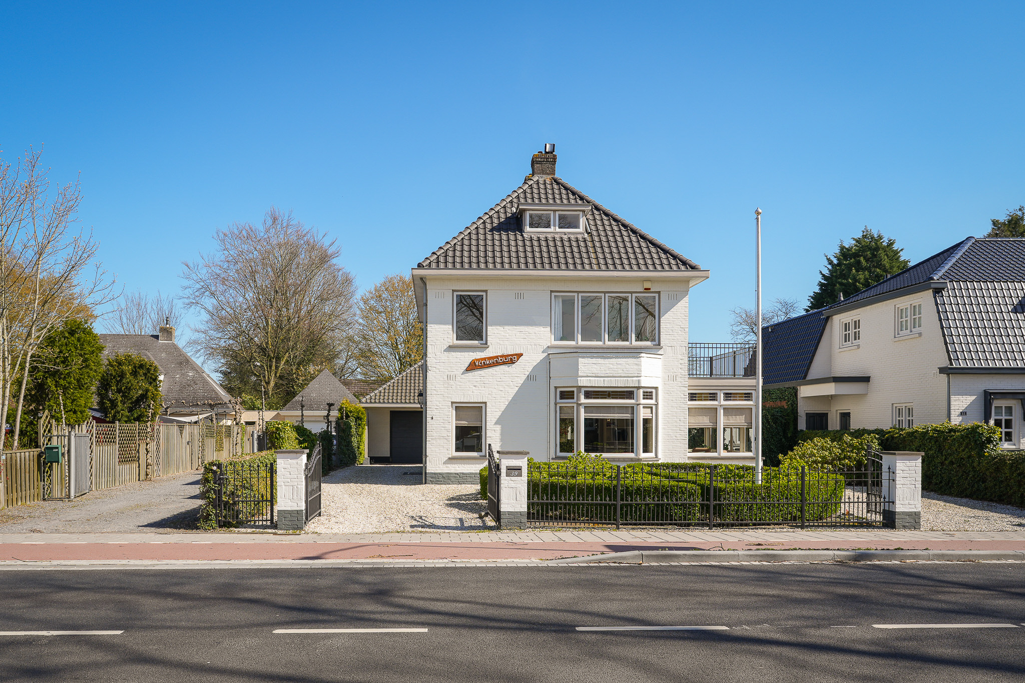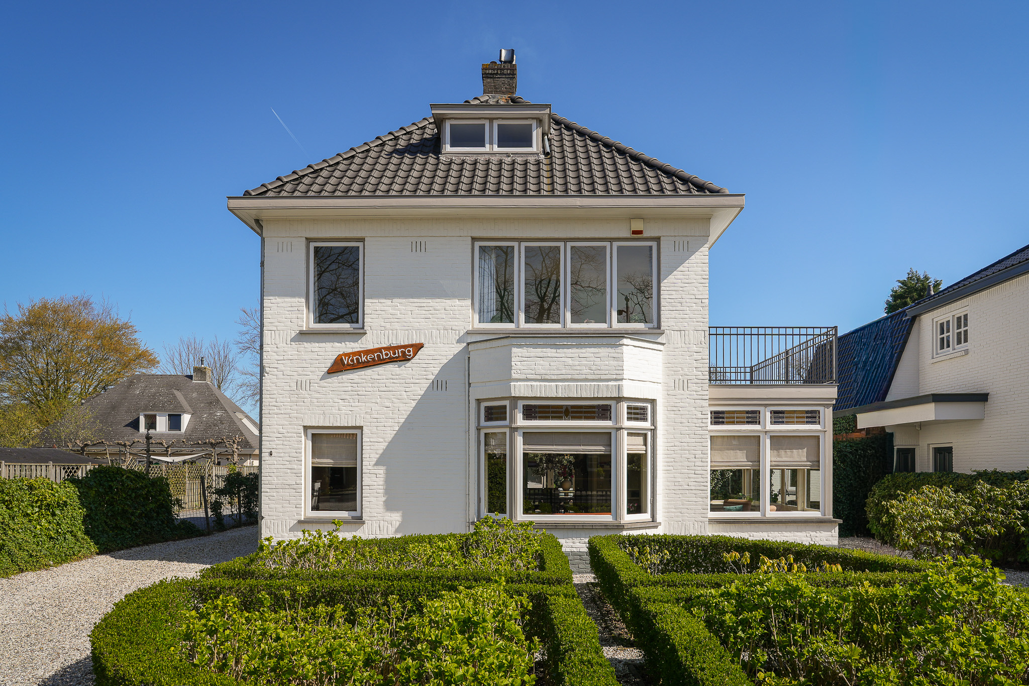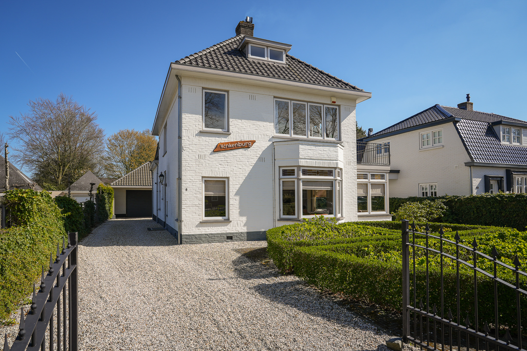 Deze in het oog springende witte villa, genaamd Vinkenburg, is in 1929 gebouwd naar een ontwerp van gemeentearchitect De Groot. Kenmerkende stijlkenmerken uit de bouwperiode zijn behouden gebleven, zoals de brede overstekken, erker, serre, glas-in-lood bovenlichten en paneeldeuren met klassiek hang- en sluitwerk.