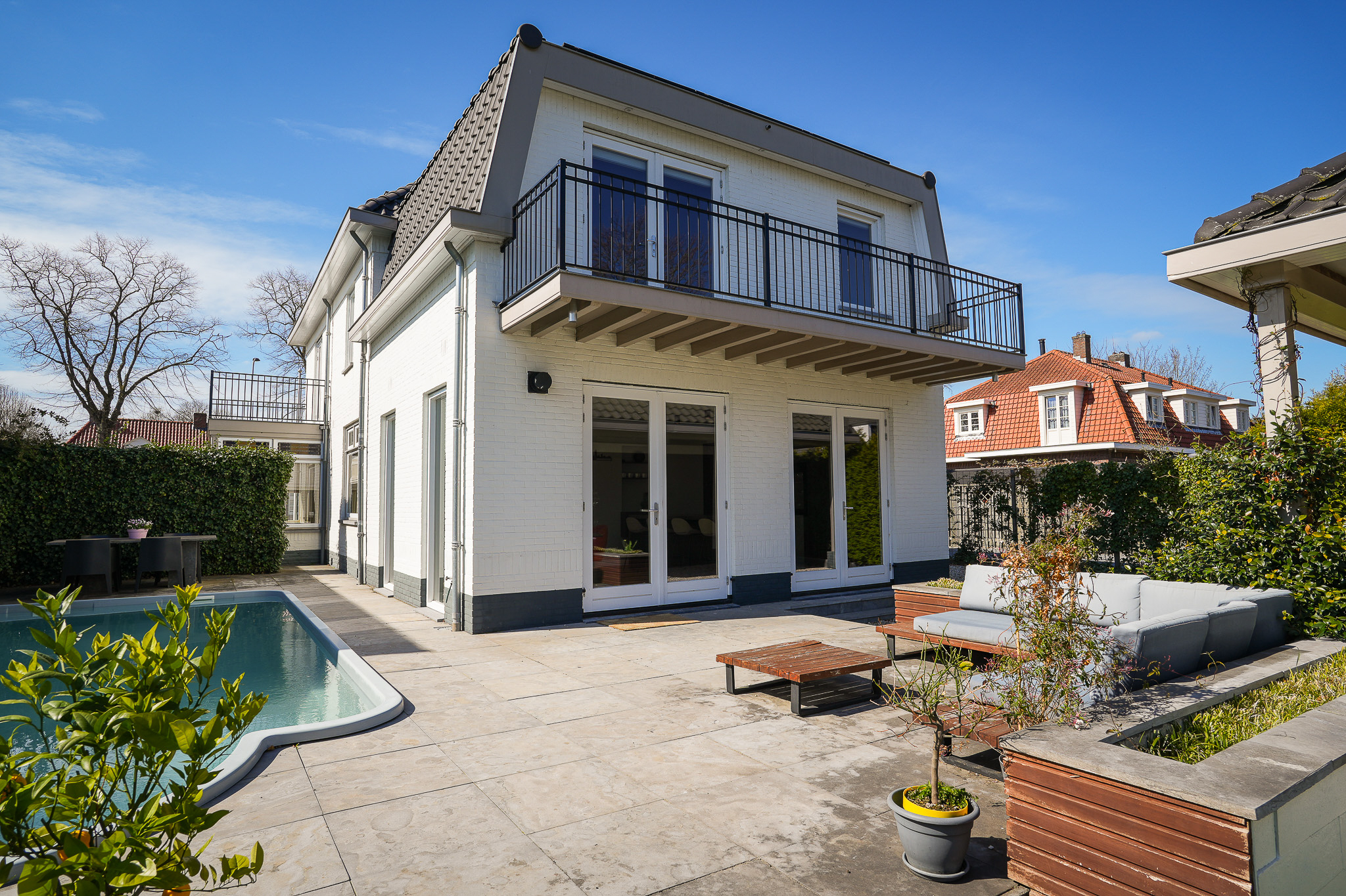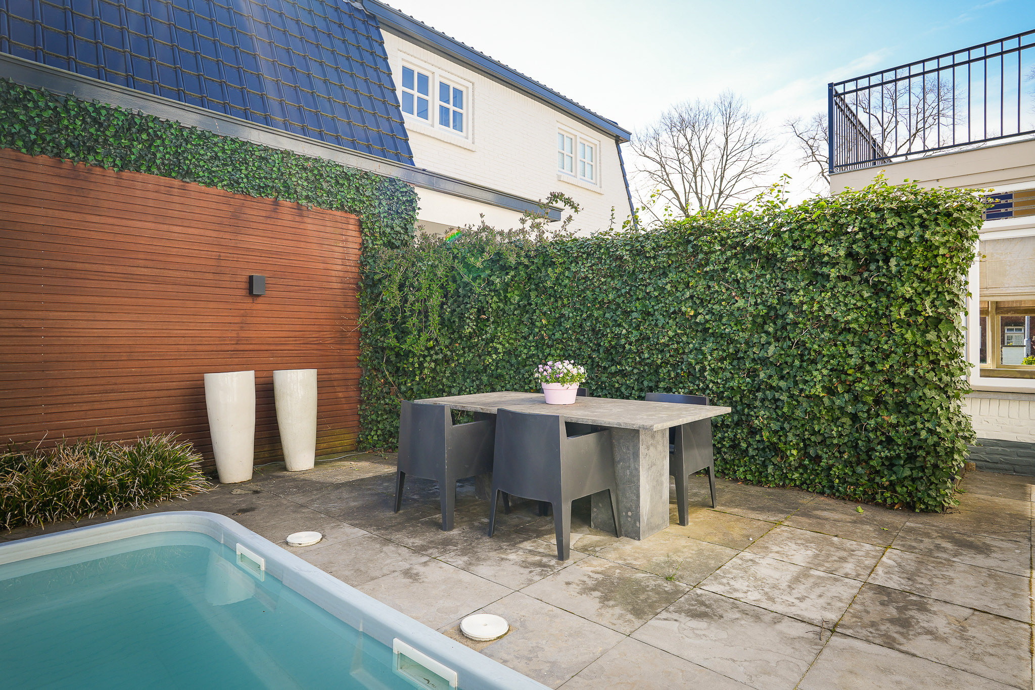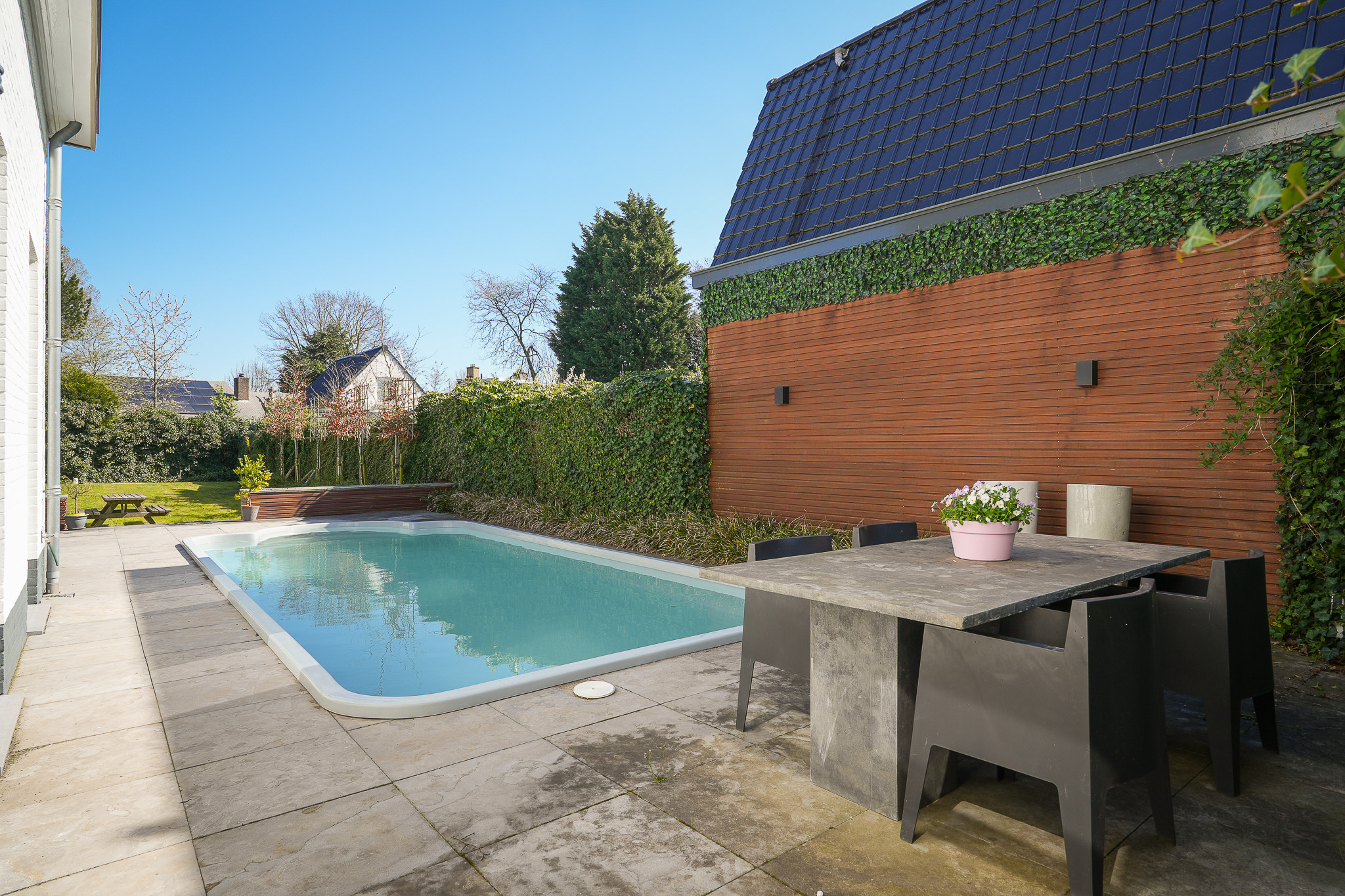 Aan het terras grenst het zwembad, een fraai aangelegd kunststof zwembad dat wordt verwarmd via een warmtepompinstallatie die is opgesteld in het bijgebouw. De tuin die aan het terras grenst, is ingericht als gazon.