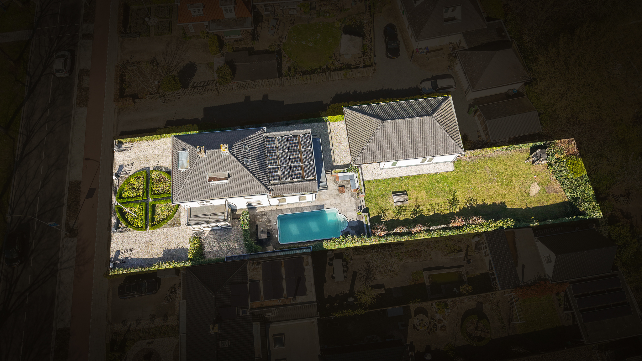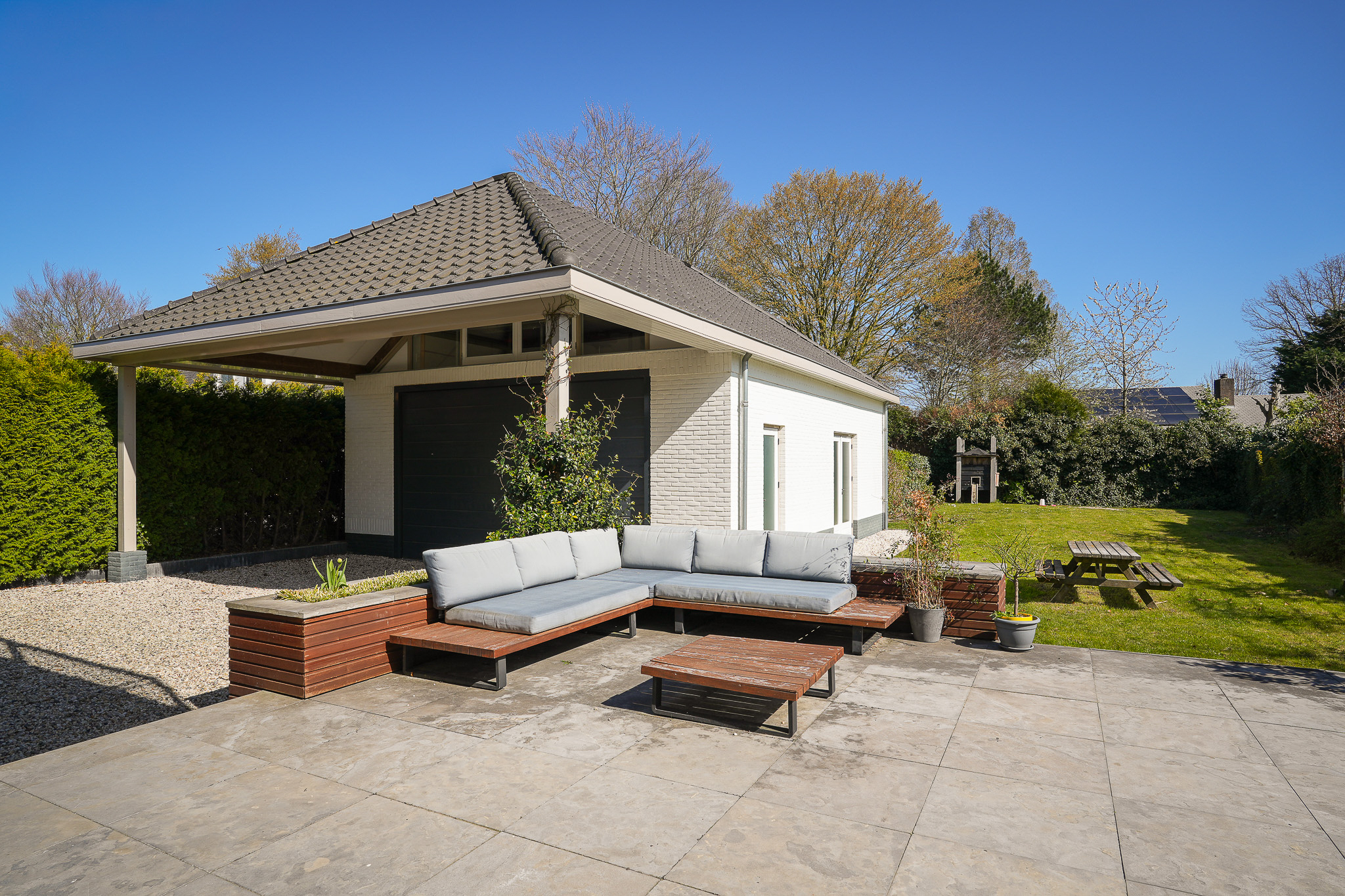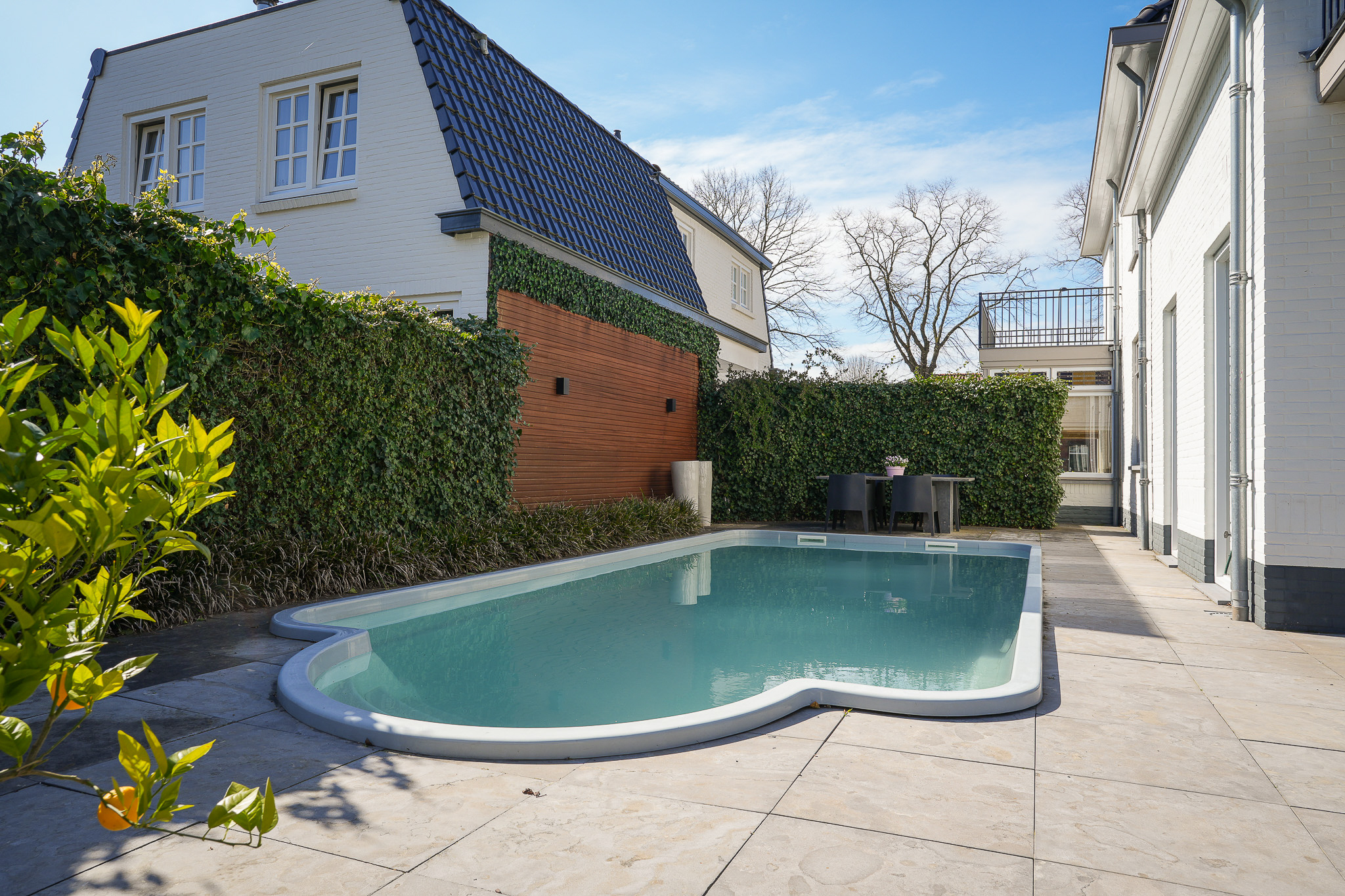 Aan het terras grenst het zwembad, een fraai aangelegd kunststof zwembad dat wordt verwarmd via een warmtepompinstallatie die is opgesteld in het bijgebouw. De tuin die aan het terras grenst, is ingericht als gazon.