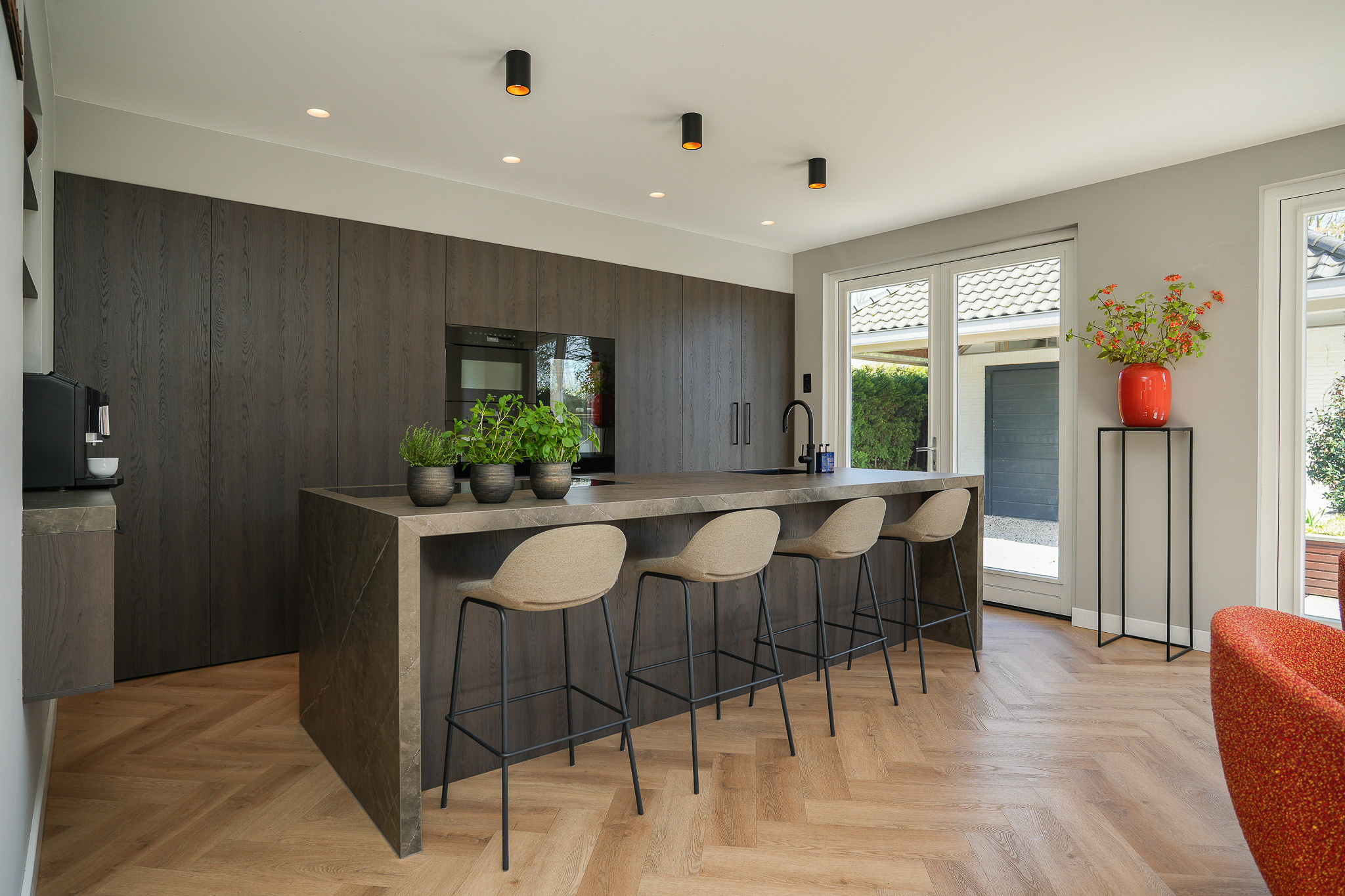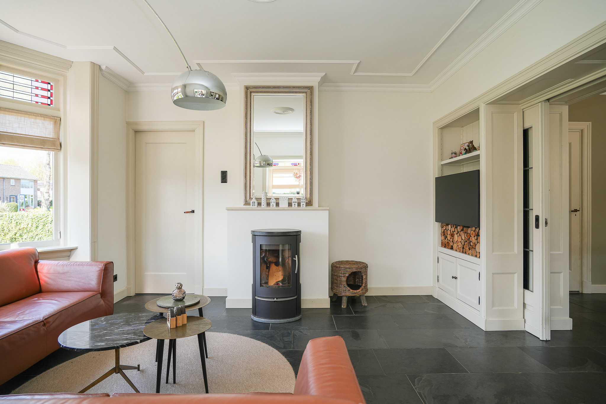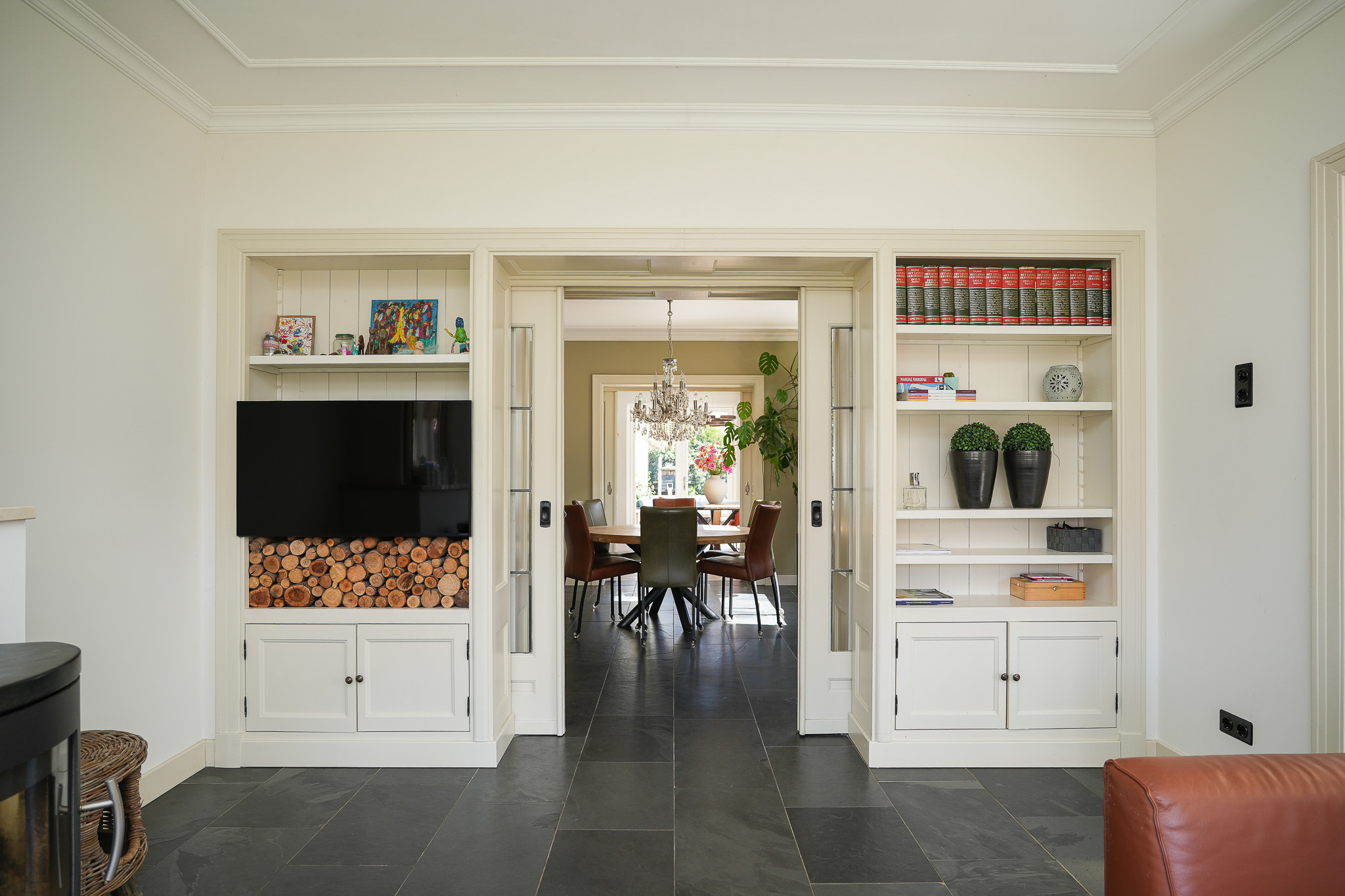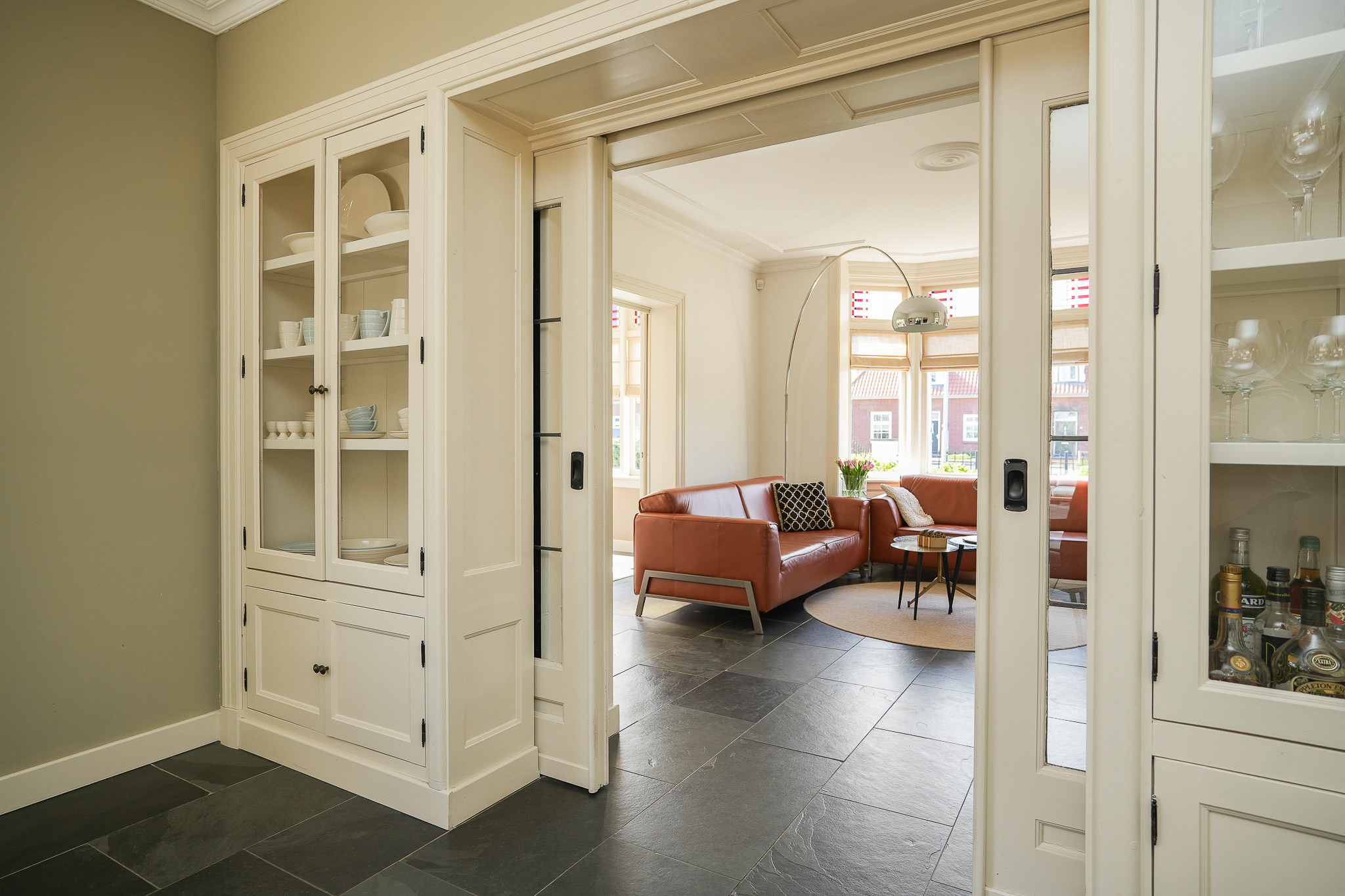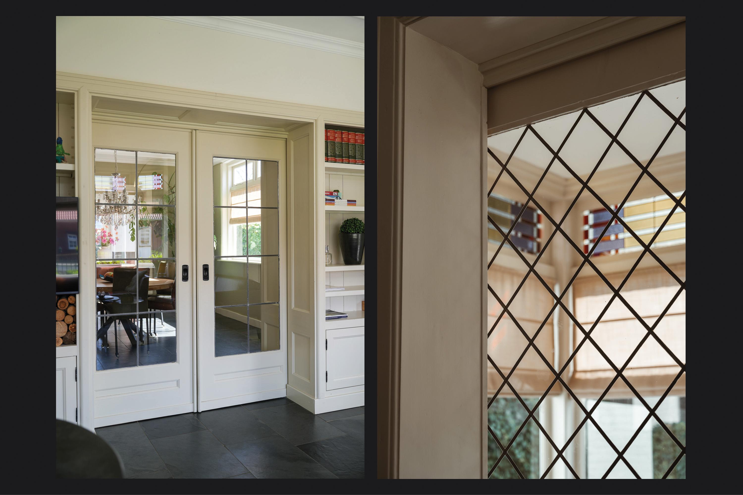 Dubbele suitedeuren met glas-in-lood, geflankeerd door vaste kasten, geven toegang tot de achterkamer die direct in verbinding staat met de woonkeuken. Deze woonkeuken bevindt zich in de in 2021/2022 gerealiseerde aanbouw en ligt volledig tuingericht. Hier vormt zich het hart van het huis, met uitzicht op de tuin en een directe verbinding naar buiten.
