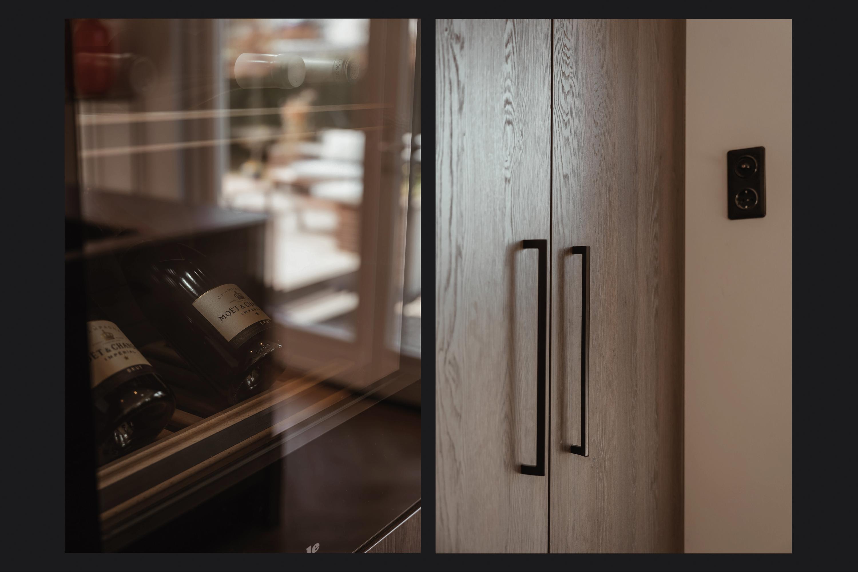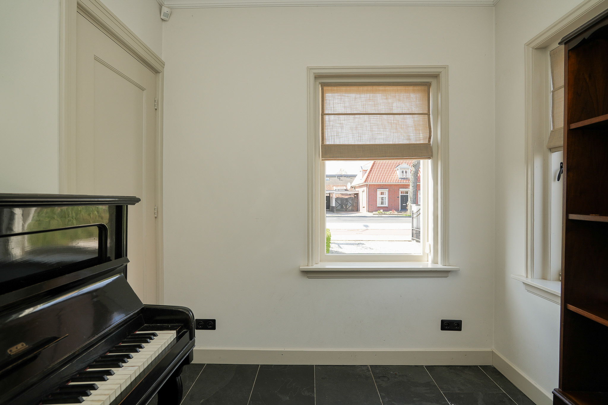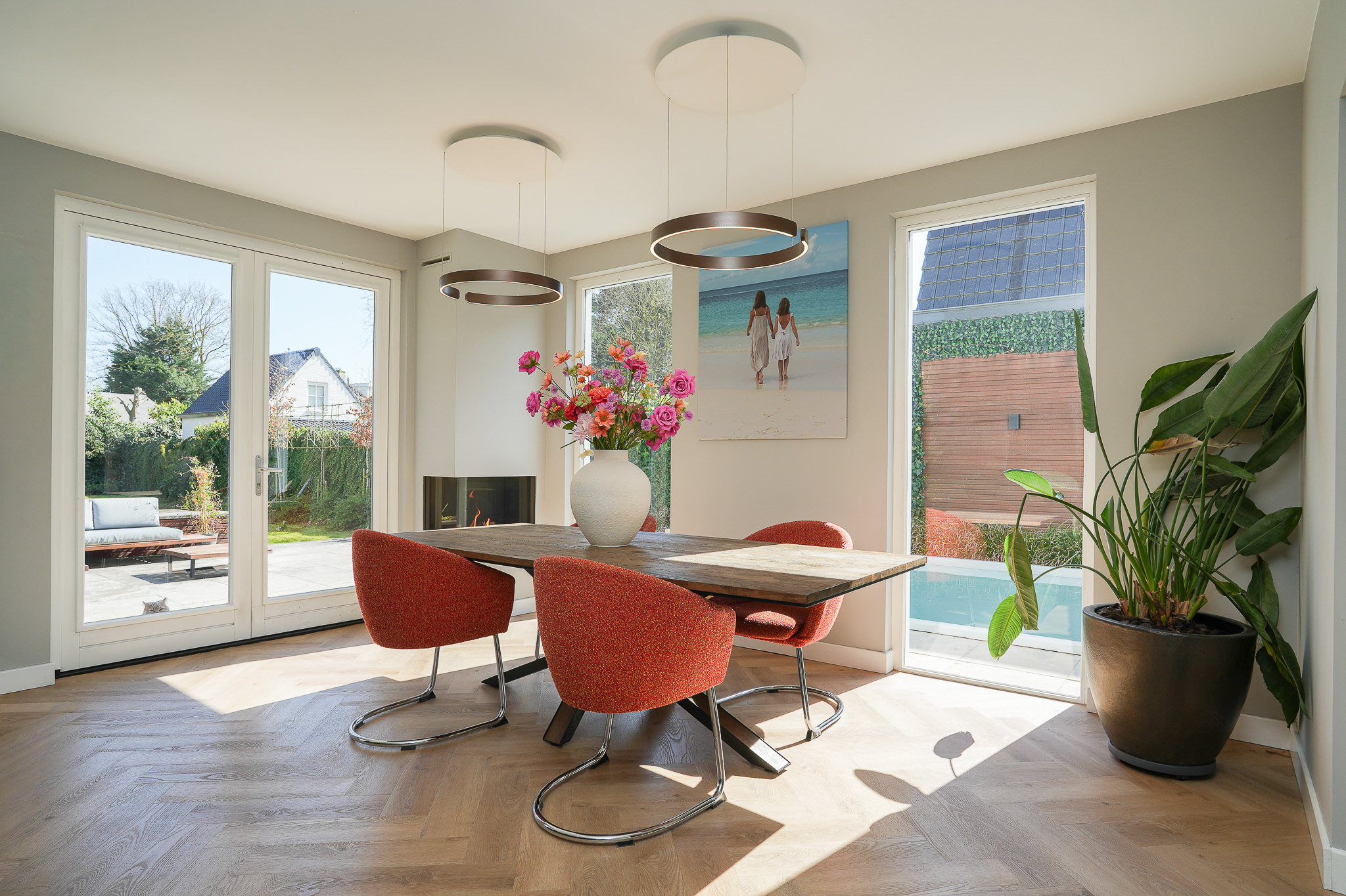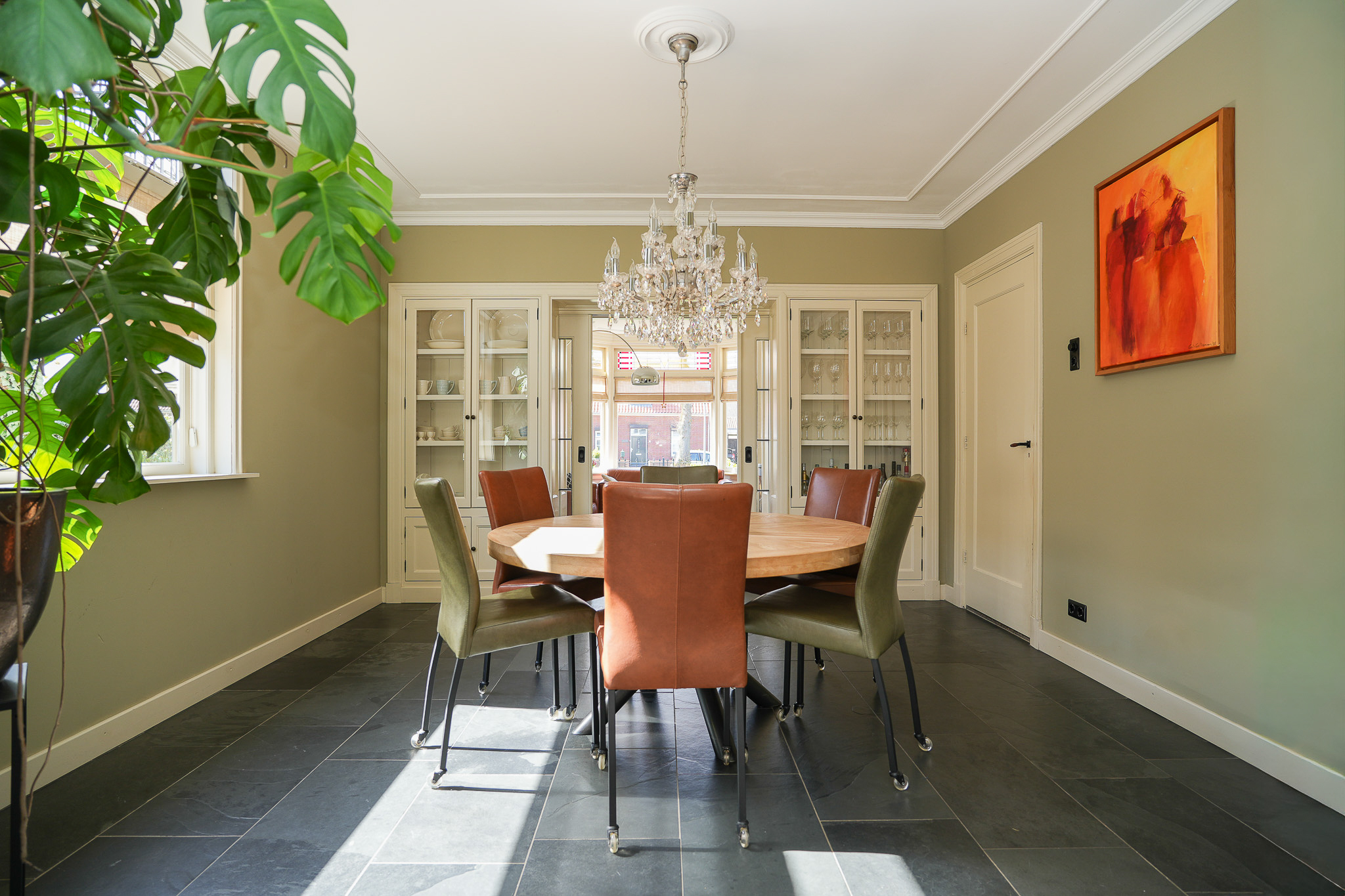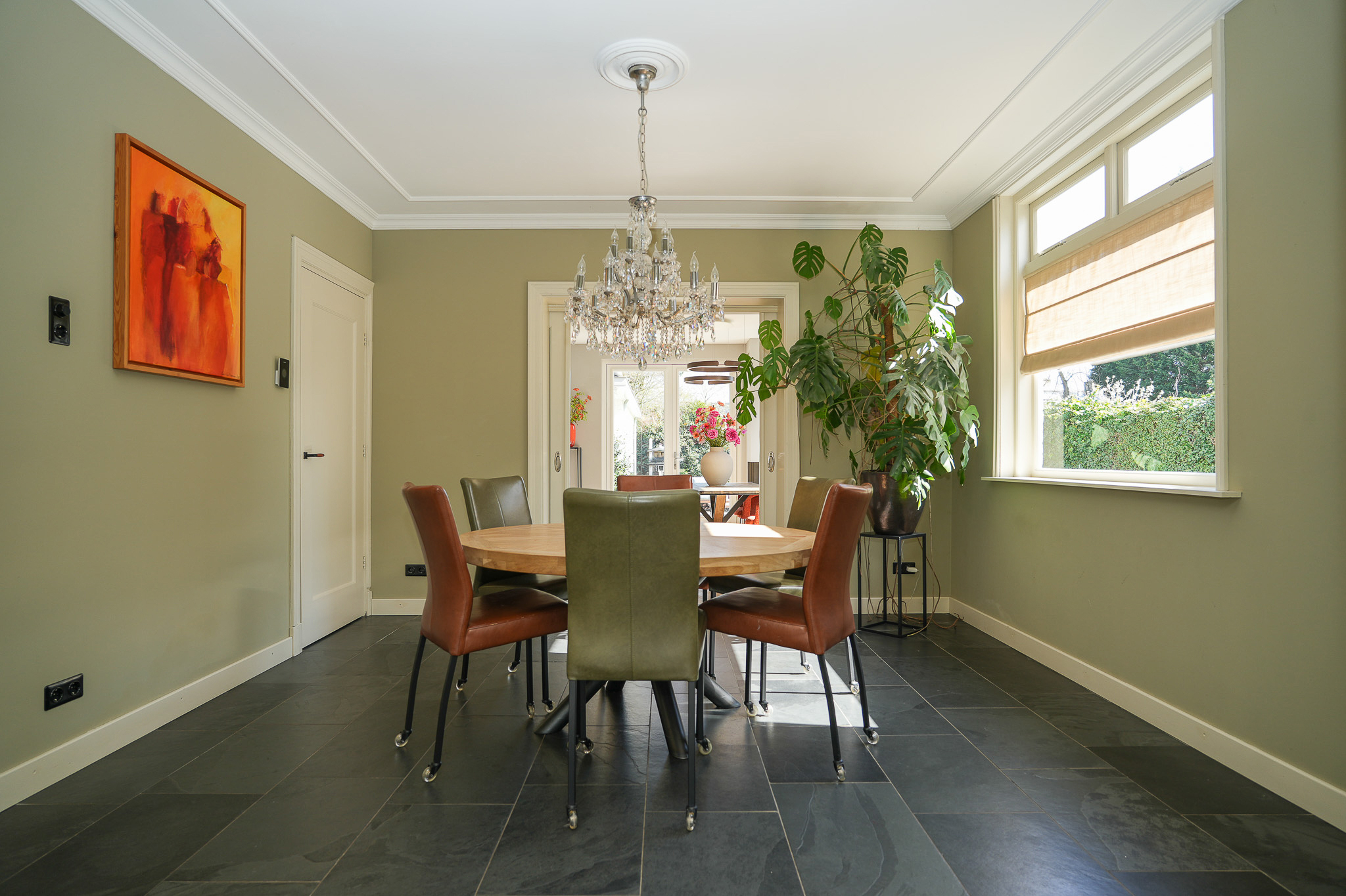 Dubbele suitedeuren met glas-in-lood, geflankeerd door vaste kasten, geven toegang tot de achterkamer die direct in verbinding staat met de woonkeuken. Deze woonkeuken bevindt zich in de in 2021/2022 gerealiseerde aanbouw en ligt volledig tuingericht. Hier vormt zich het hart van het huis, met uitzicht op de tuin en een directe verbinding naar buiten.