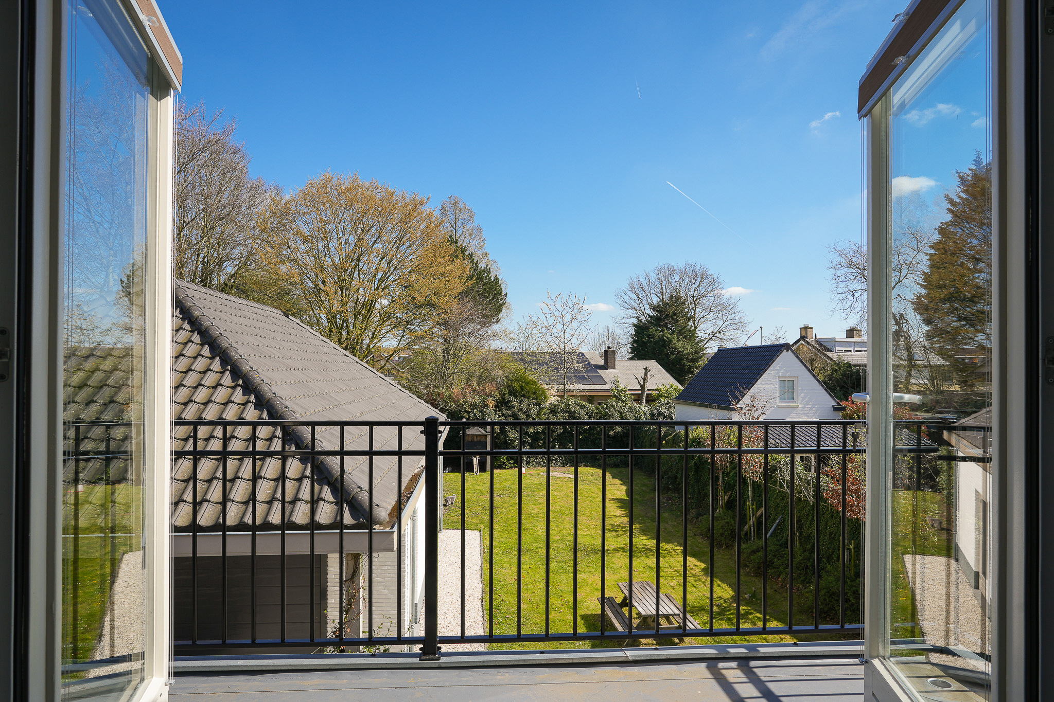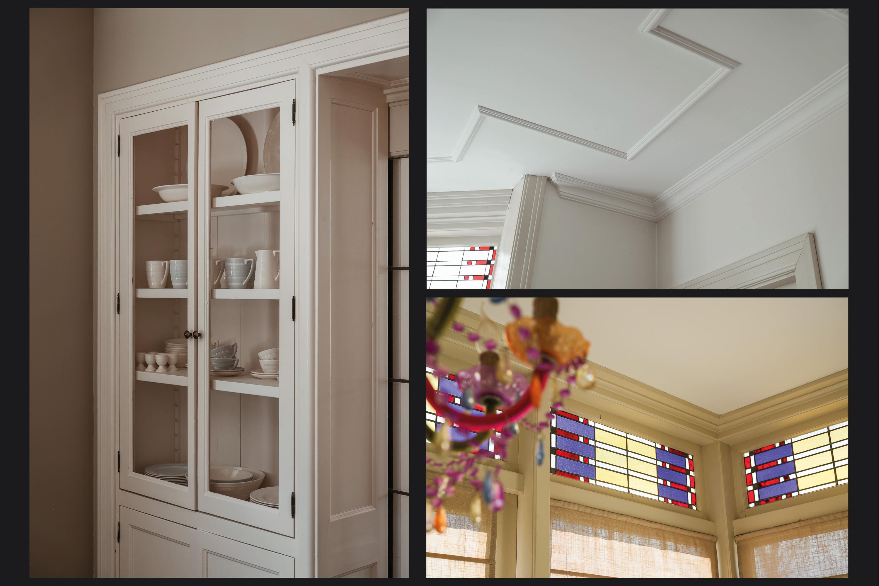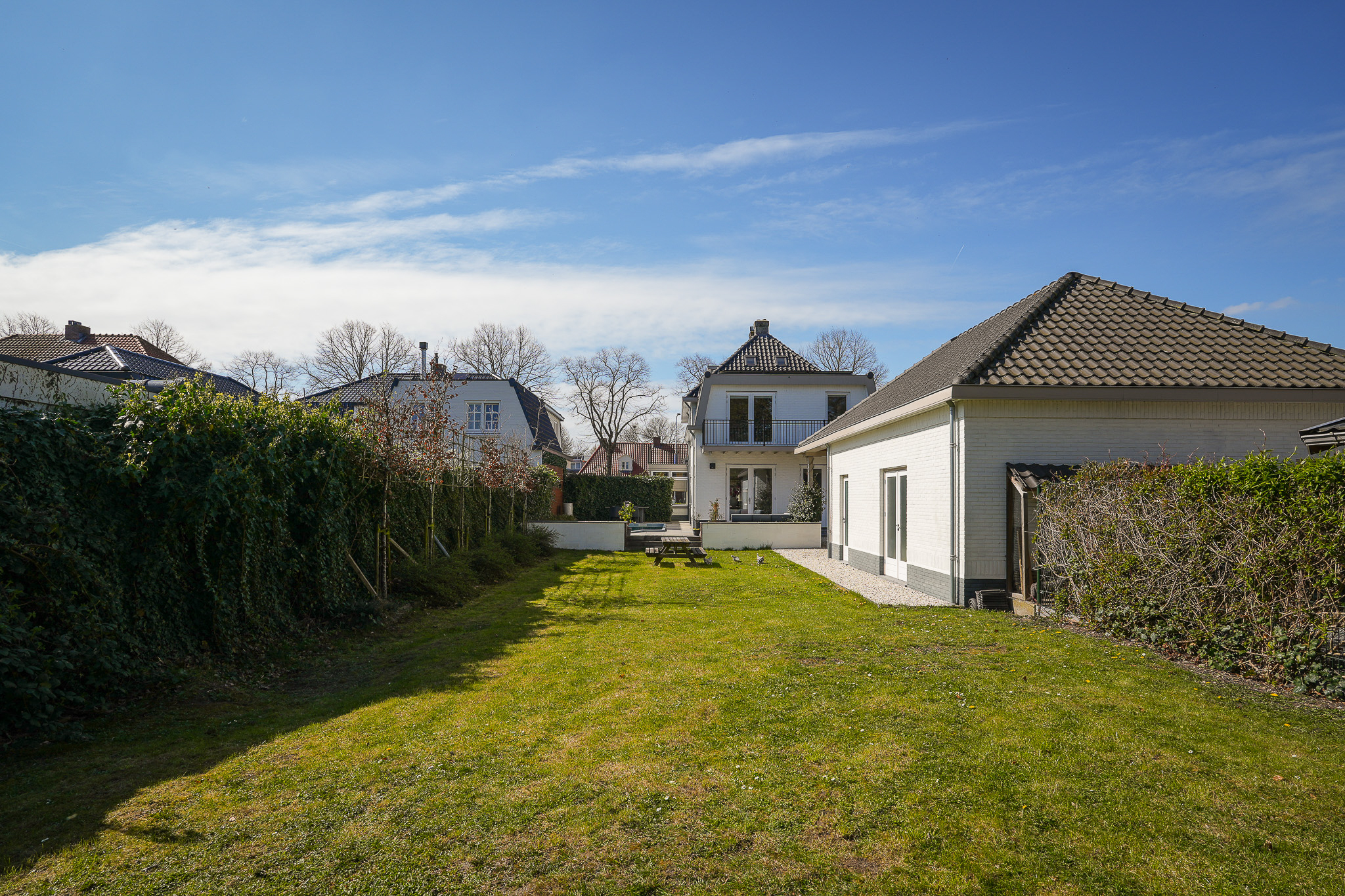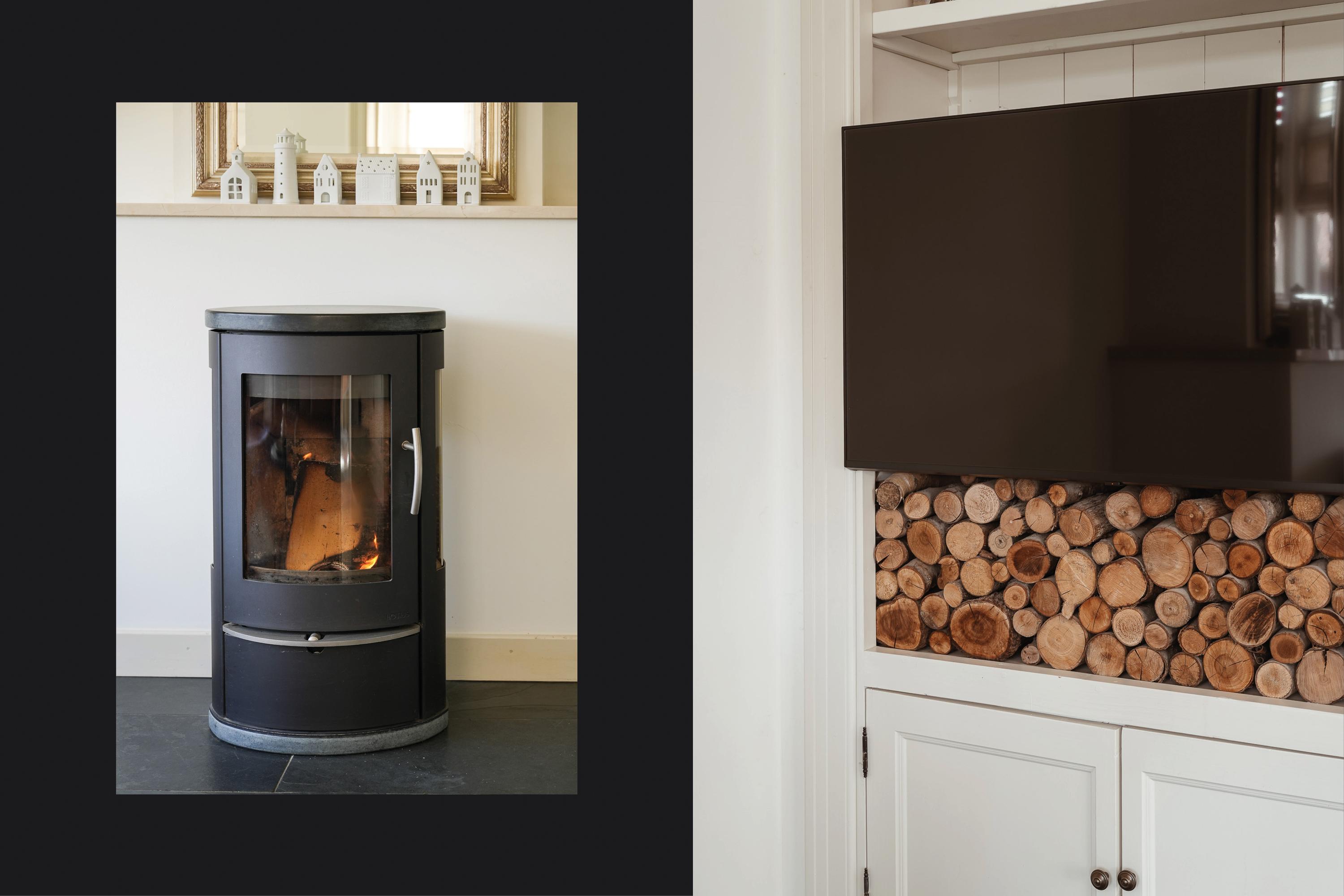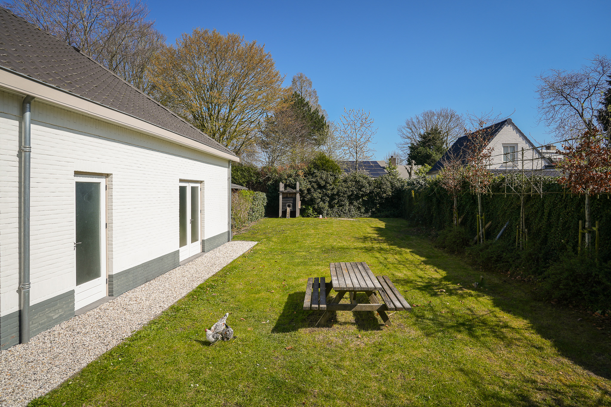 Dubbele suitedeuren met glas-in-lood, geflankeerd door vaste kasten, geven toegang tot de achterkamer die direct in verbinding staat met de woonkeuken. Deze woonkeuken bevindt zich in de in 2021/2022 gerealiseerde aanbouw en ligt volledig tuingericht. Hier vormt zich het hart van het huis, met uitzicht op de tuin en een directe verbinding naar buiten.