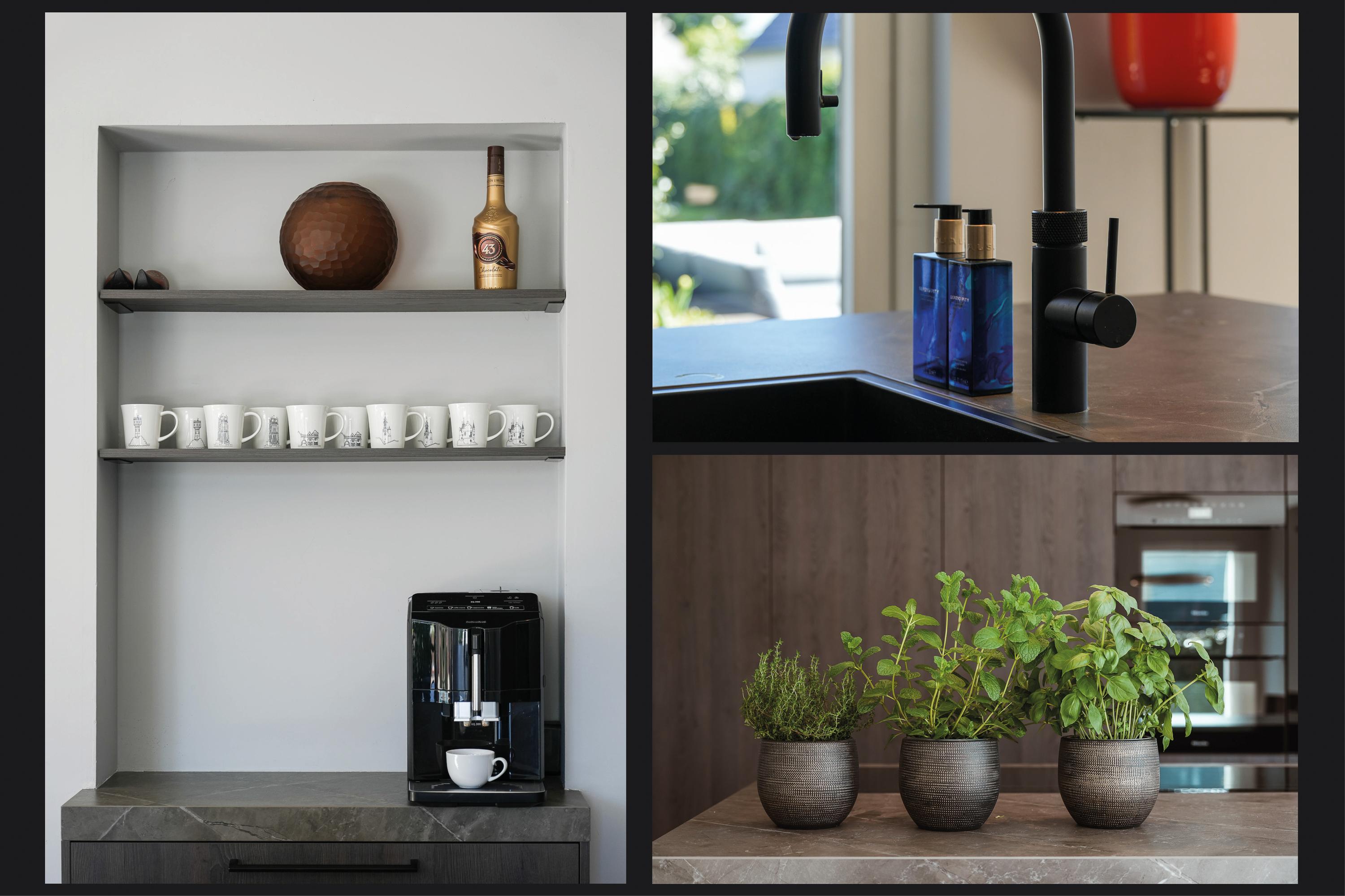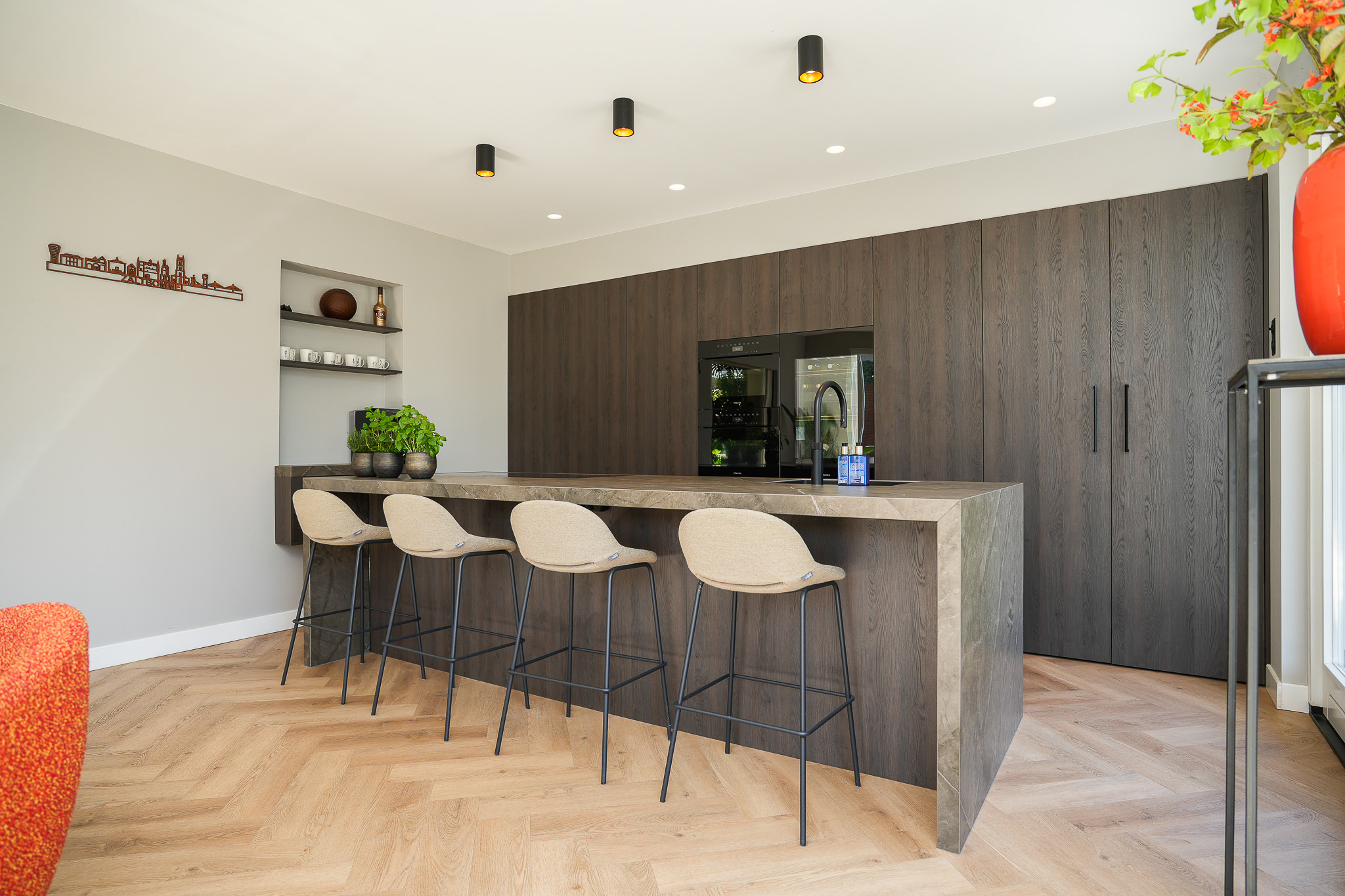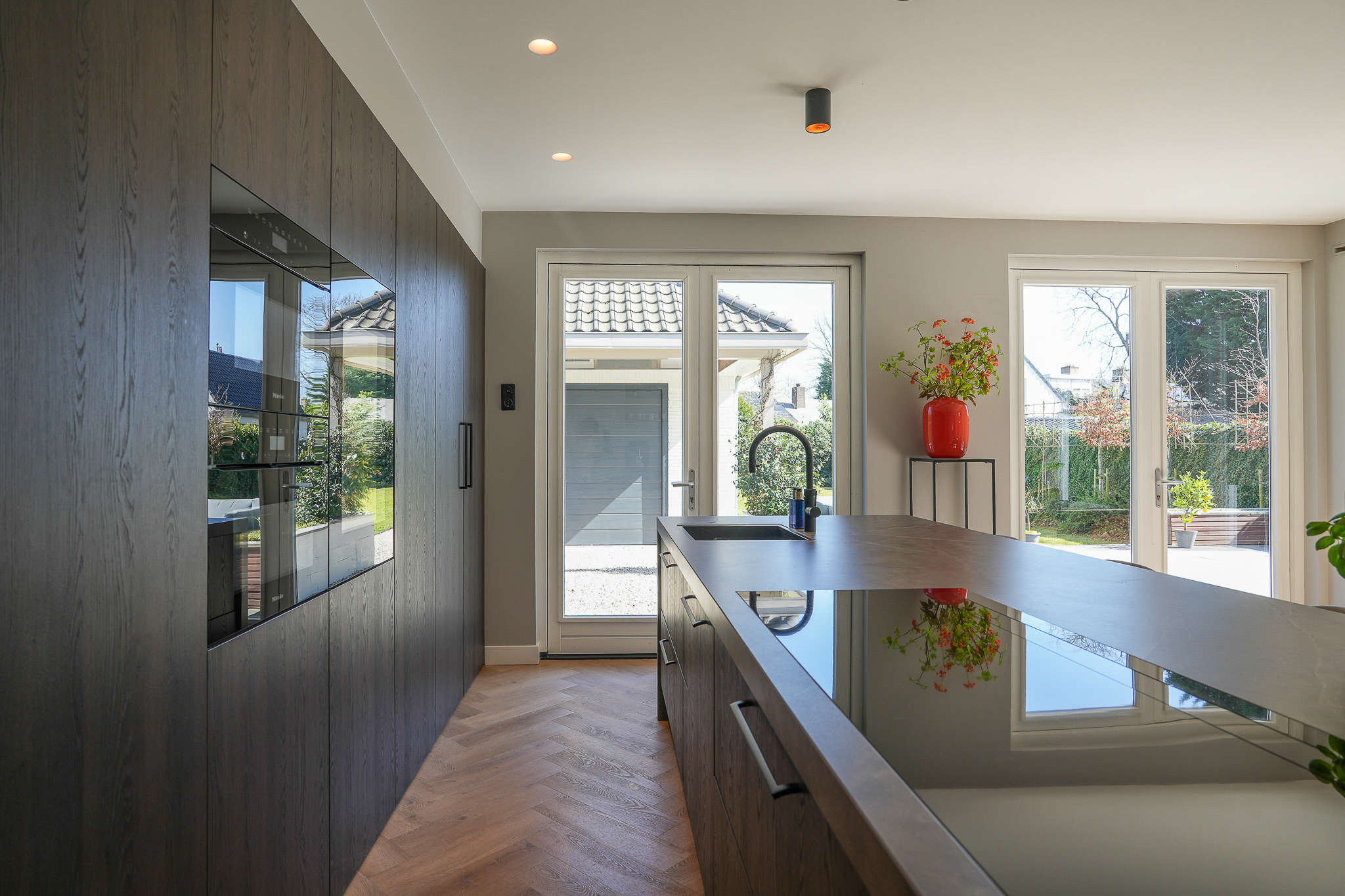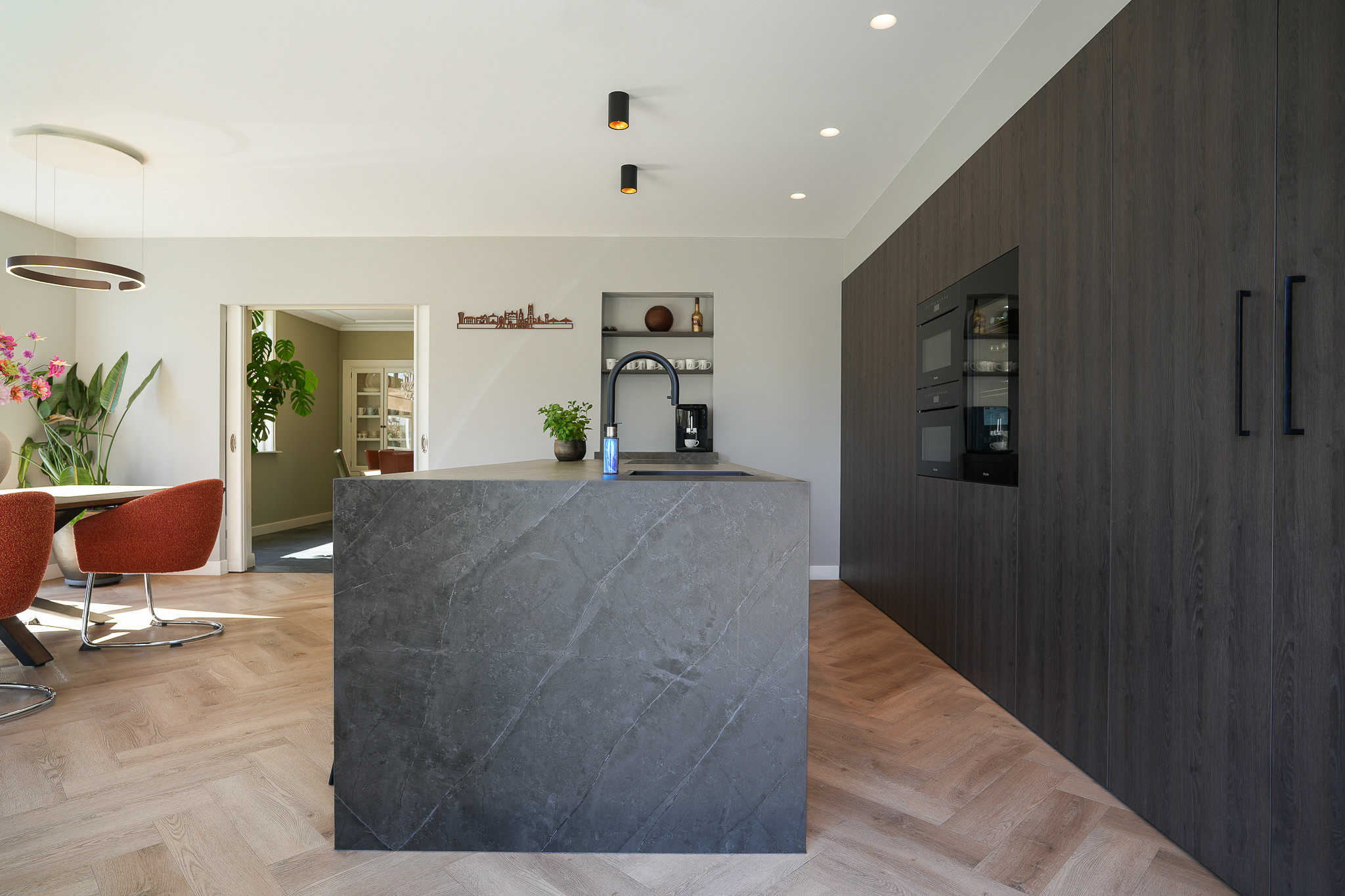 De keuken is hoogwaardig uitgevoerd, met een brede kastenwand met luxe inbouwapparatuur en een groot kookeiland met een Dekton werkblad.