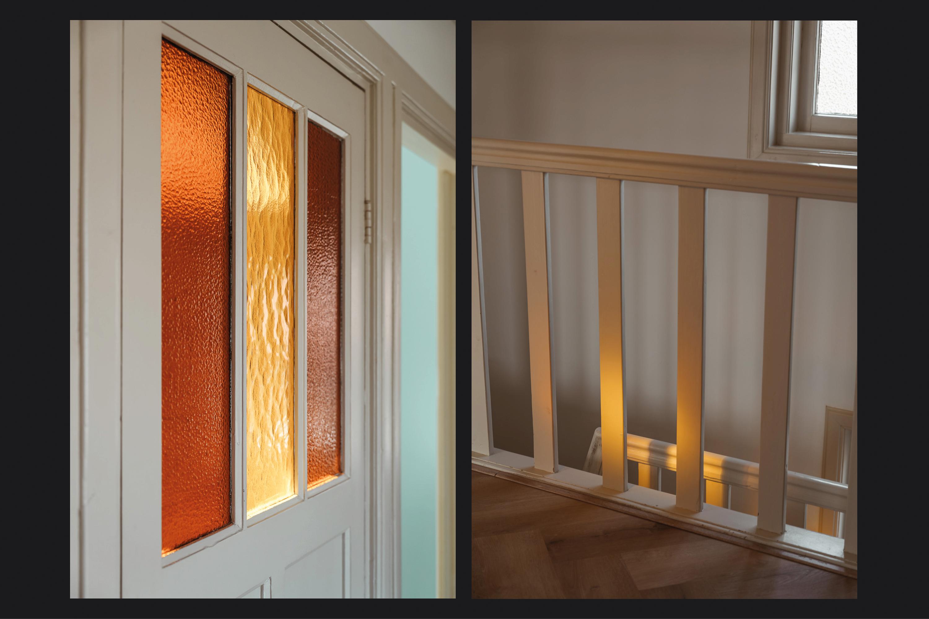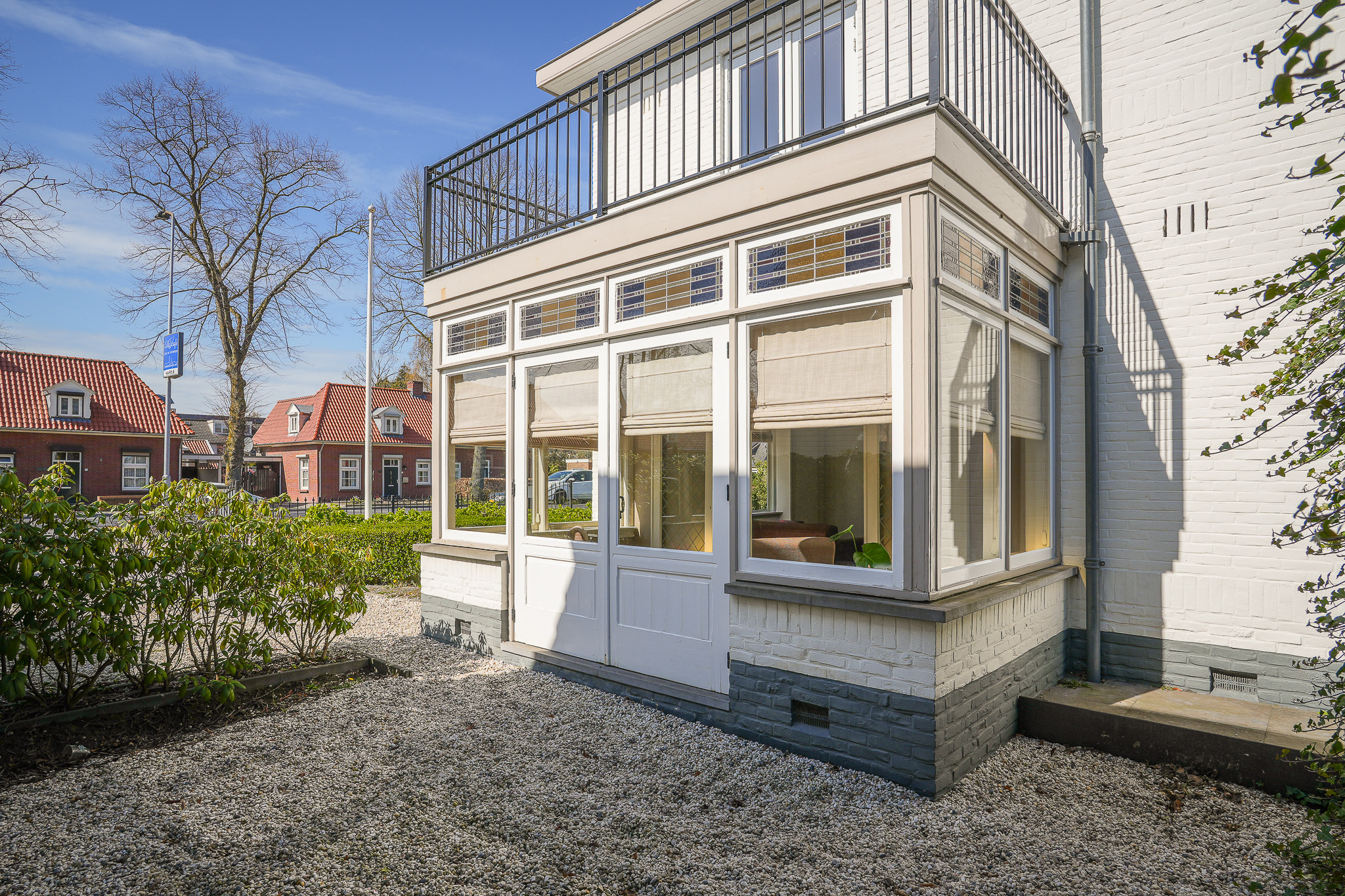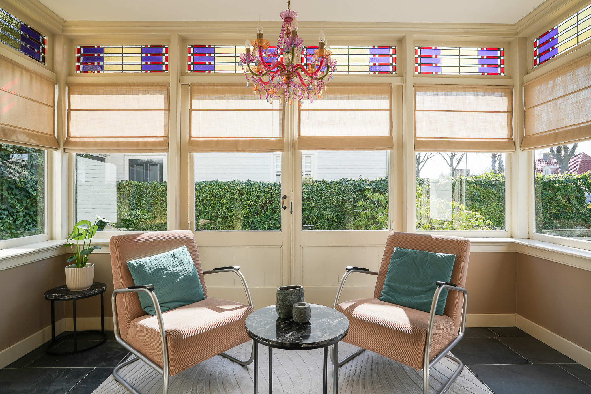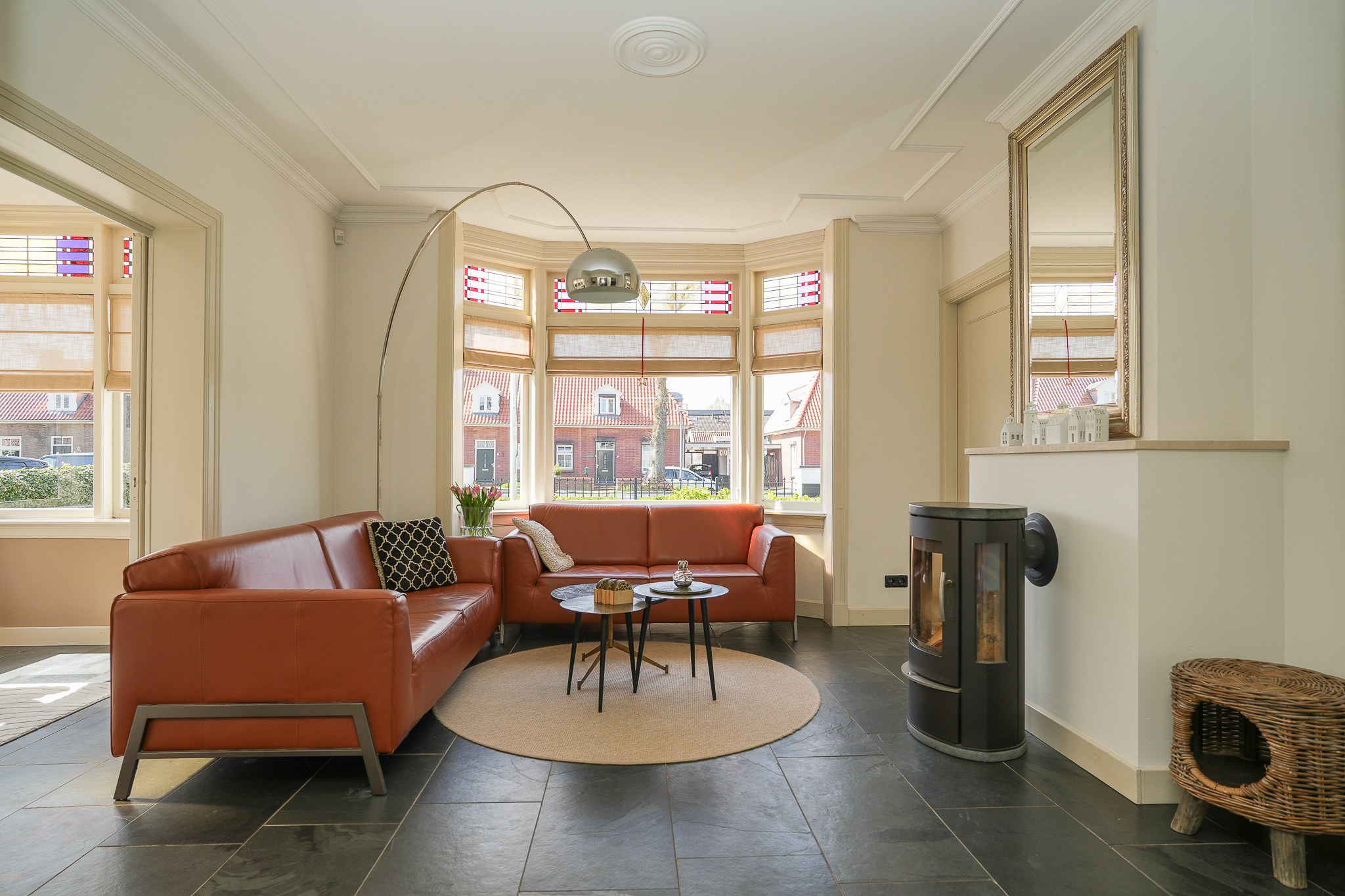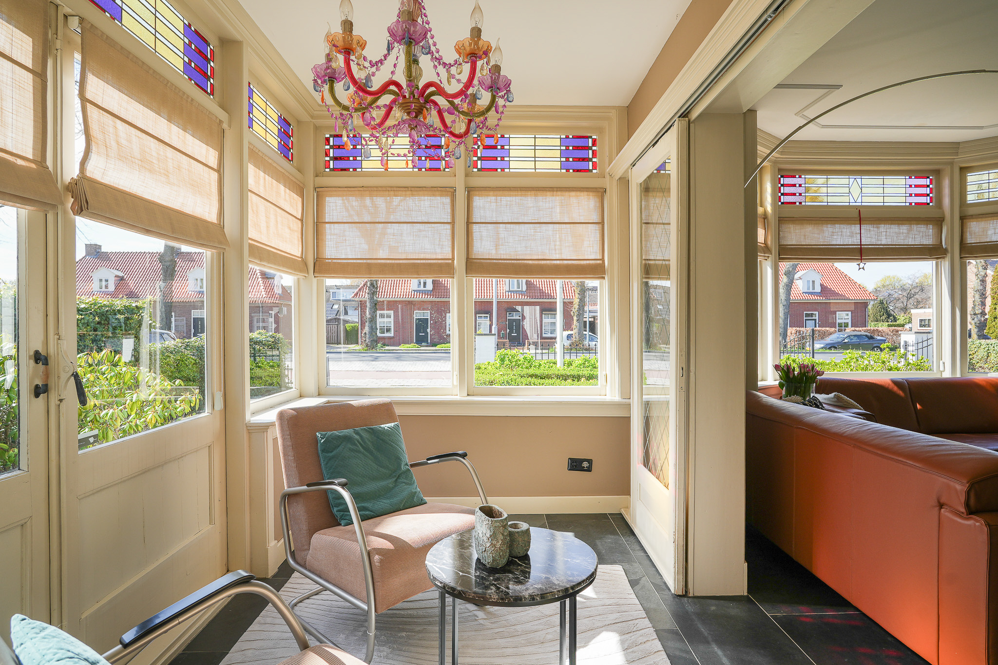 De woonkamer en suite is heerlijk licht, met zowel in de voor- als in de achterkamer ramen op de zuidzijde. De voorkamer beschikt over een schouw met houtkachel, een hoog stucplafond met sierlijsten en een erker met glas-in-lood bovenlichten. Vanuit hier is er toegang tot de muziek-/werkkamer en de afsluitbare serre. In de serre openen dubbele deuren naar de zijtuin, waarbij ook hier de glas-in-lood bovenlichten zijn behouden.