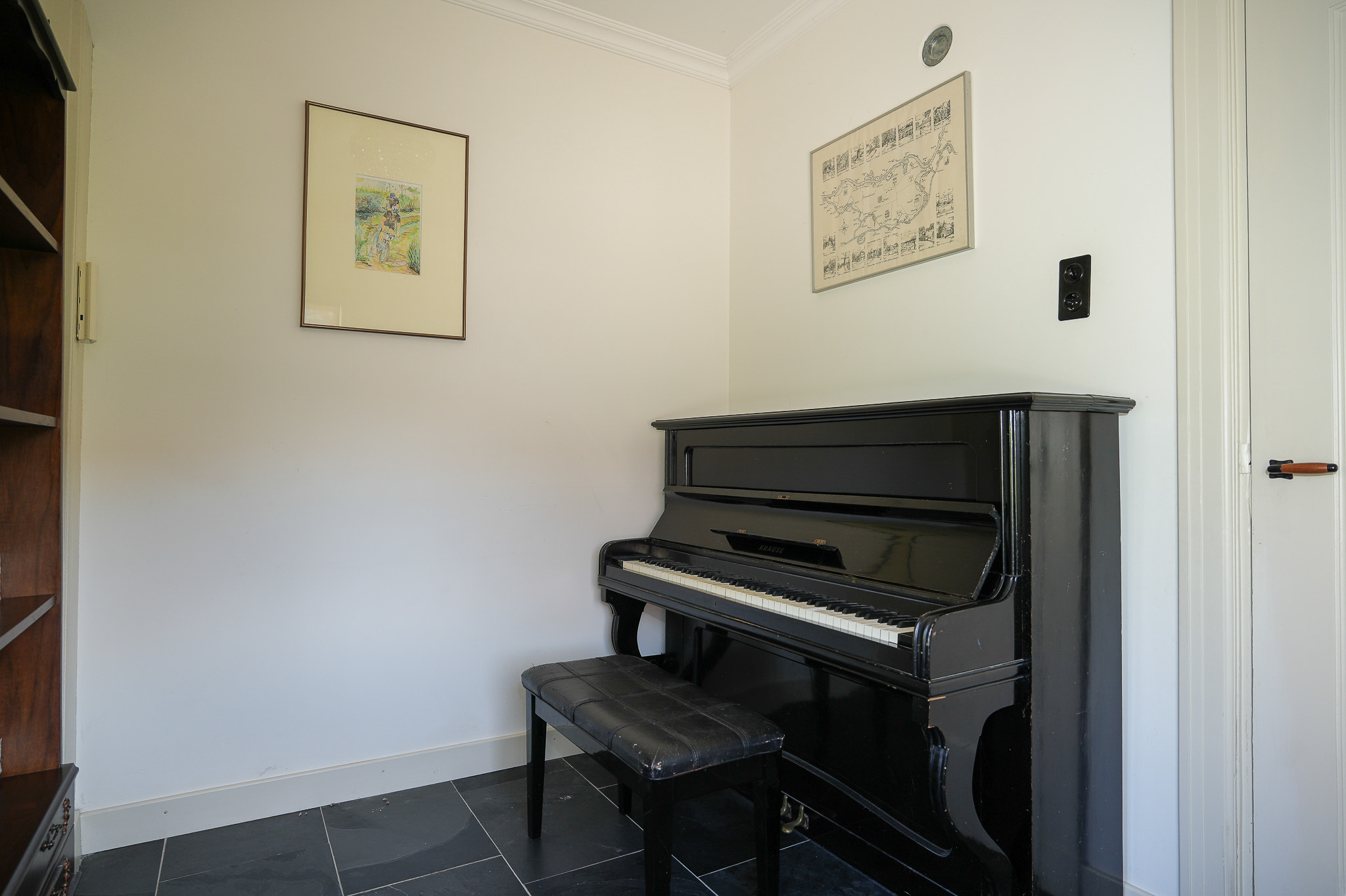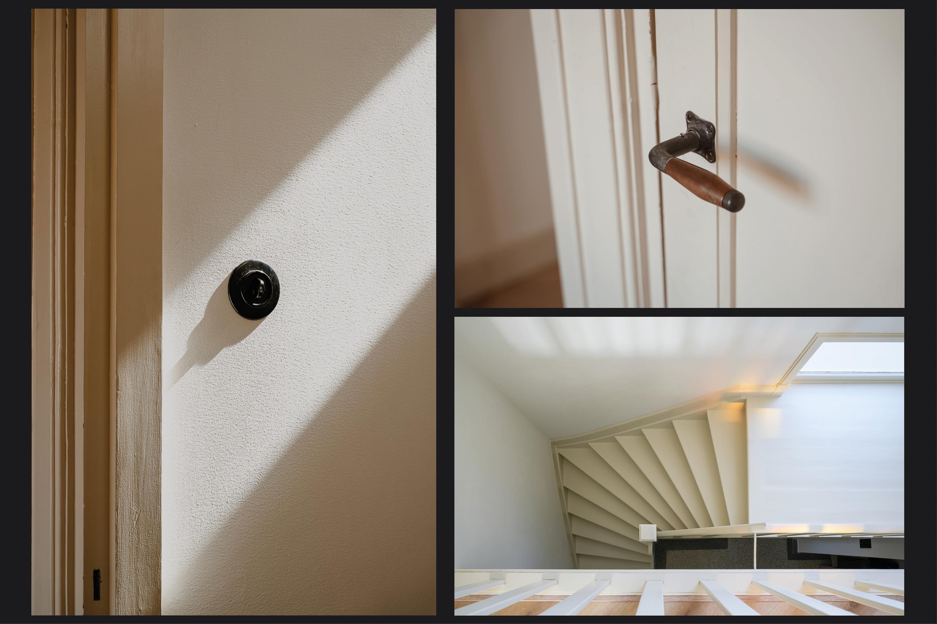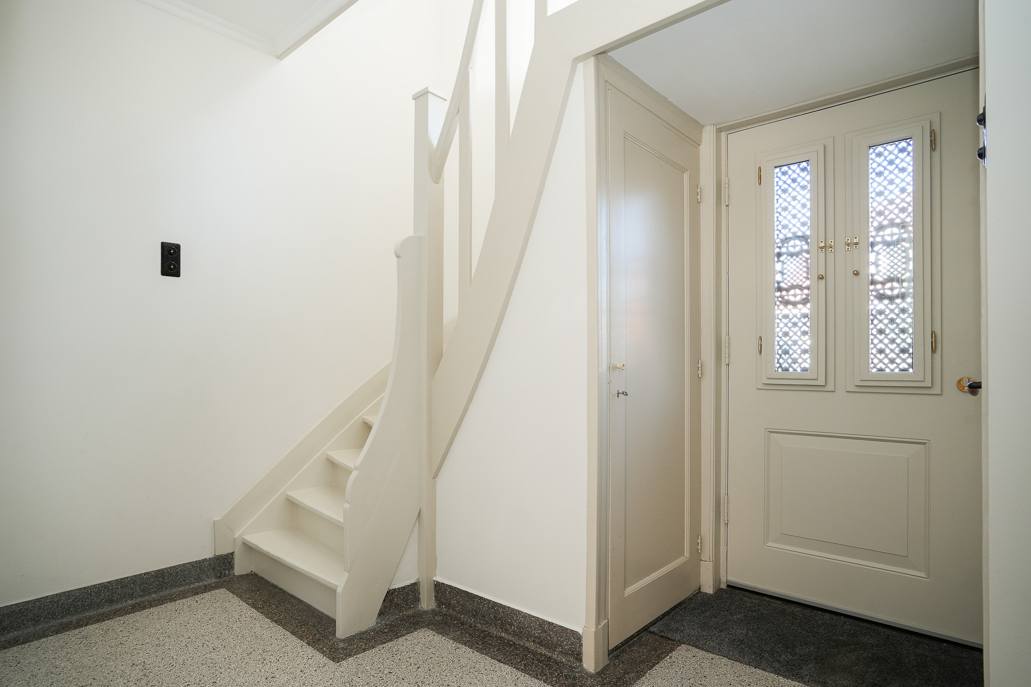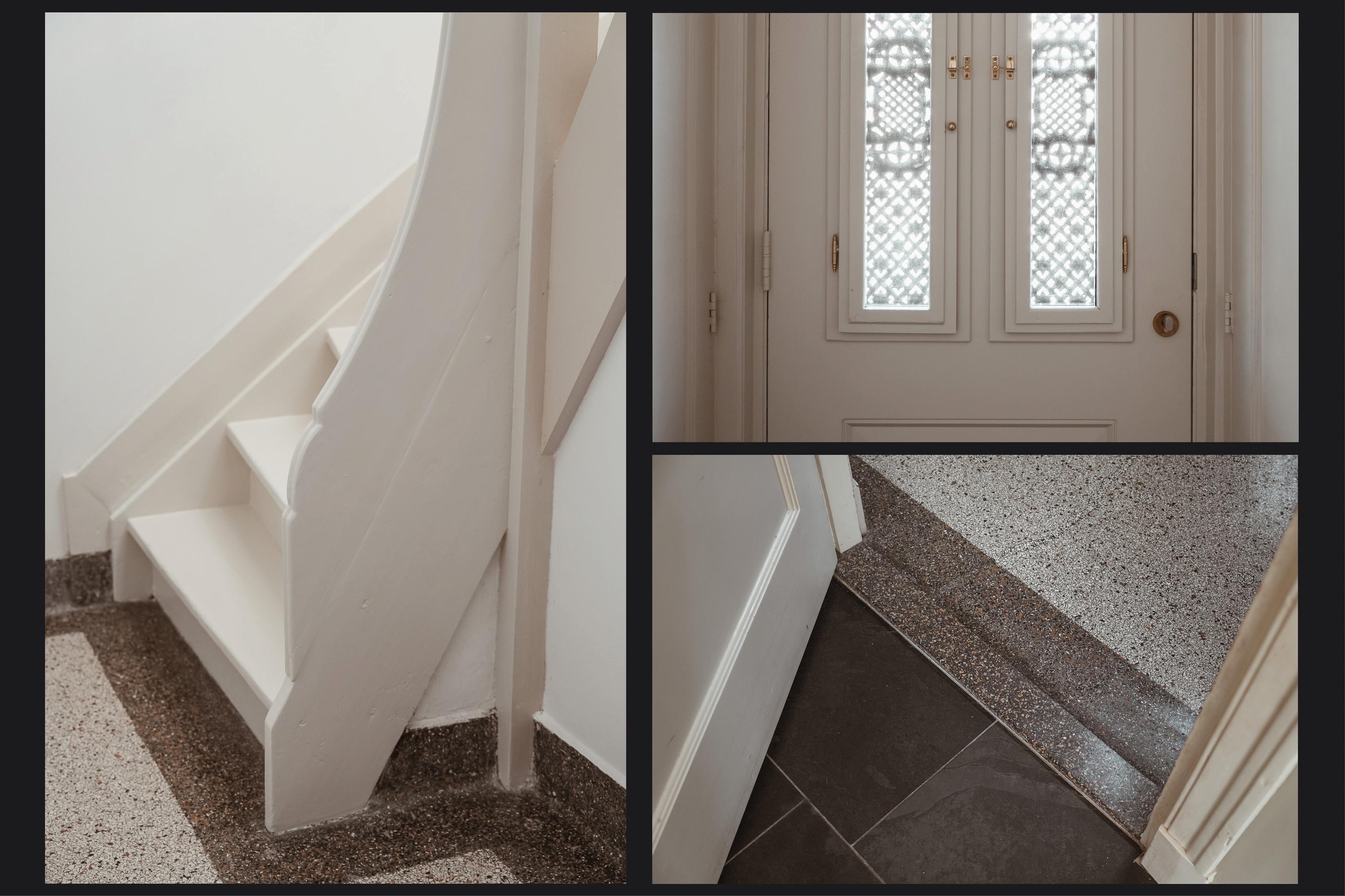 Via de brede oprit is de zijentree bereikbaar. De hal biedt toegang tot de woonkamer en suite, de toiletruimte en de wijnkelder. De terrazzovloer, trapopgang en de gaaf bewaard gebleven paneeldeuren met klassiek hang- en sluitwerk vormen fraaie details uit de vooroorlogse bouwperiode.