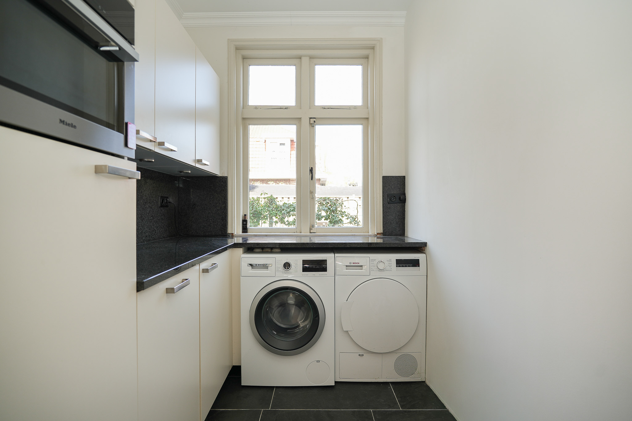 Vanuit de achterkamer is de praktische bijkeuken bereikbaar, voorzien van een extra vaatwasser, koelkast en aansluitingen voor de wasmachine. De woonkeuken is afgewerkt met een pvc-visgraatvloer met vloerverwarming; in de woonkamer, muziekkamer en serre ligt natuursteen, eveneens met vloerverwarming.