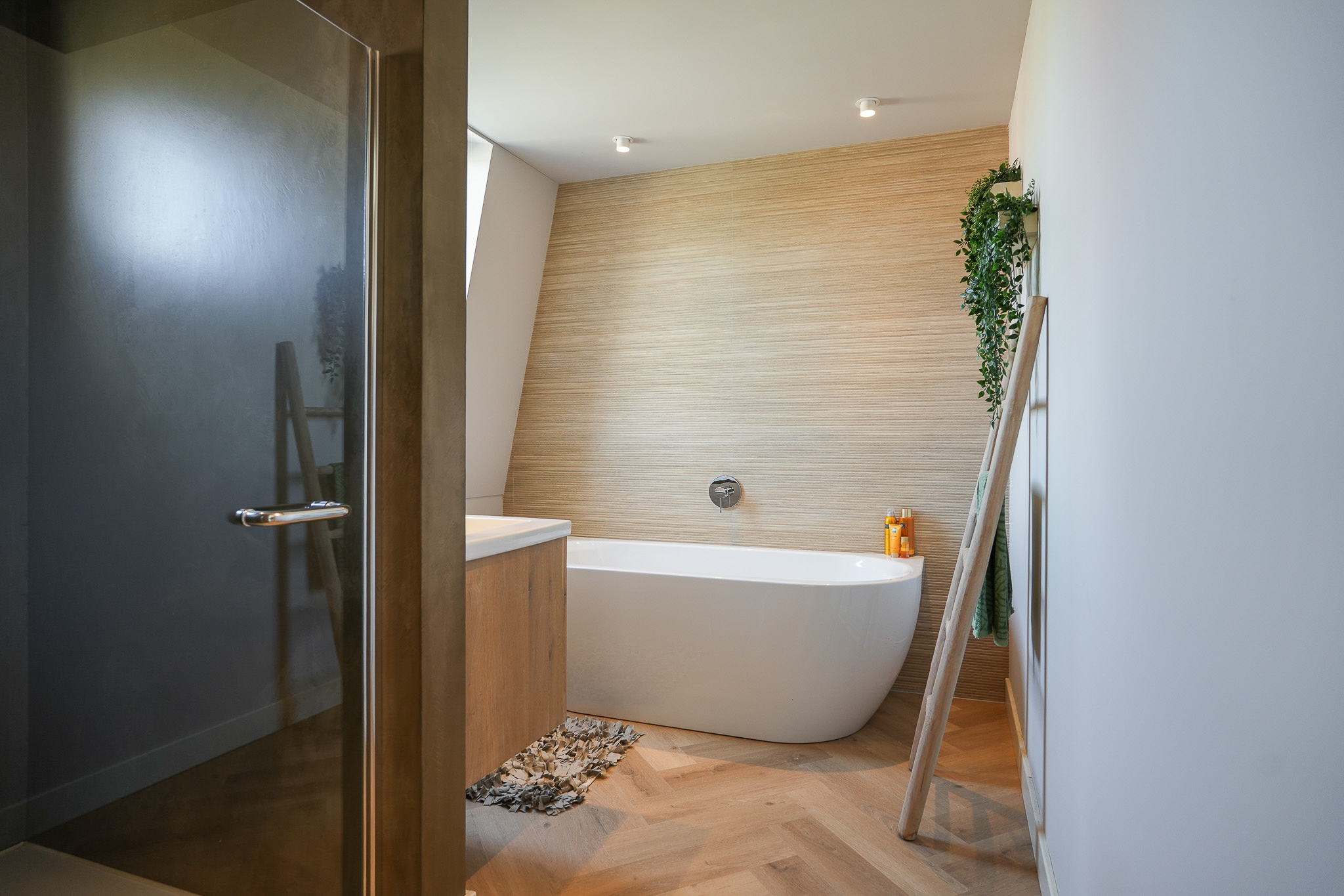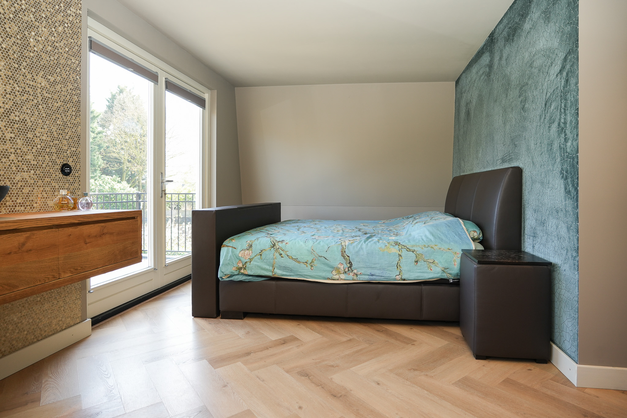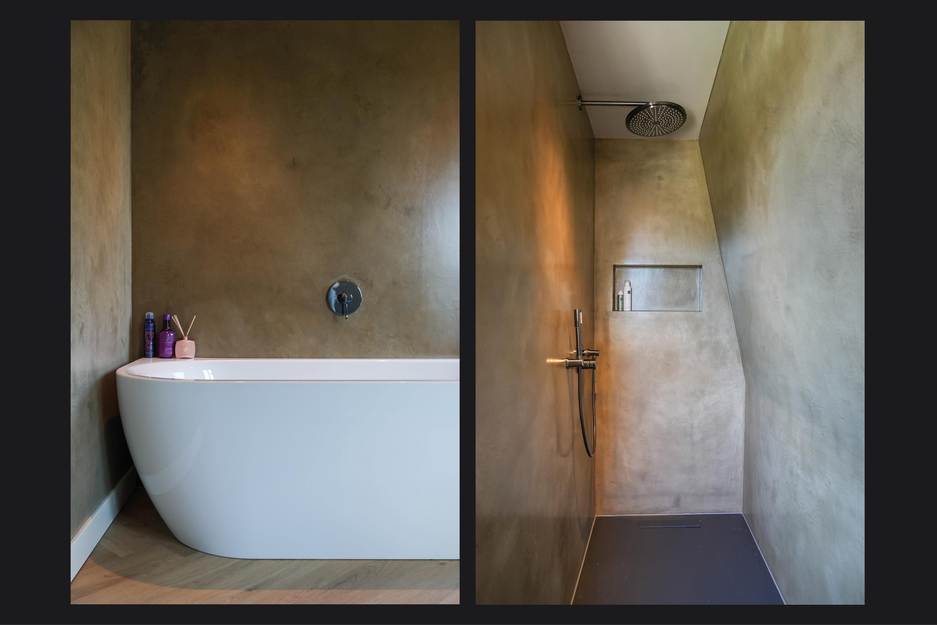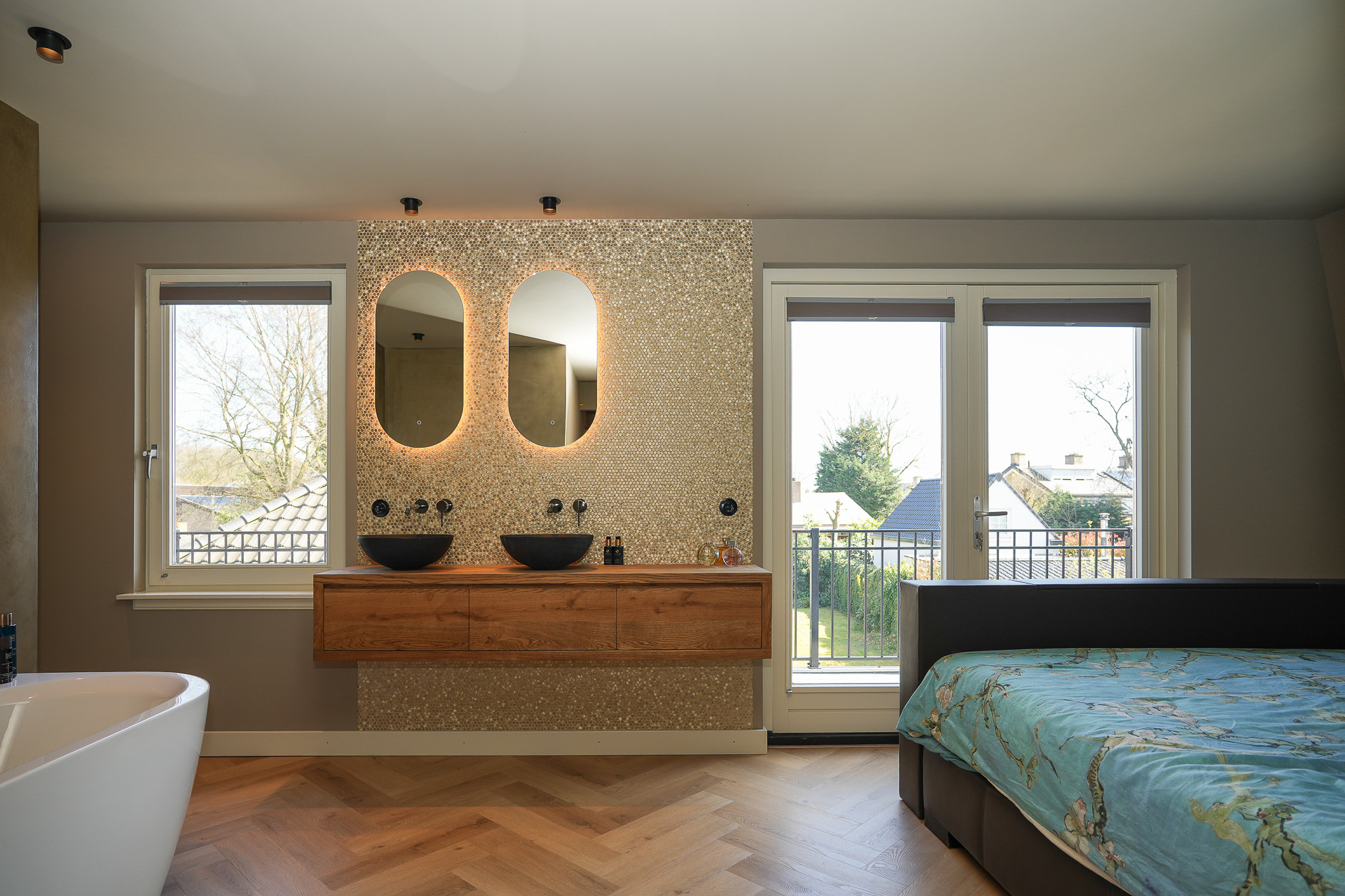 Op de overloop is zichtbaar dat de verbouwing met grote zorg is uitgevoerd. De nieuwe aanbouw sluit naadloos aan bij de oorspronkelijke stijl. Hier bevindt zich tevens de toiletruimte. In de uitbouw aan de achterzijde ligt een slaapkamer met balkon, een luxe open badkamer en een walk-in closet. De badkamer is uitgerust met een half vrijstaand ligbad, een ruime inloopdouche met regendouche en een luxe wastafelmeubel. De wand achter het meubel is afgewerkt met hexagonale mozaïektegels, terwijl de wanden bij douche en bad zijn uitgevoerd in betonciré. Door de oostelijke ligging valt hier in de ochtend het zonlicht naar binnen en is het balkon direct vanuit de slaapkamer bereikbaar.